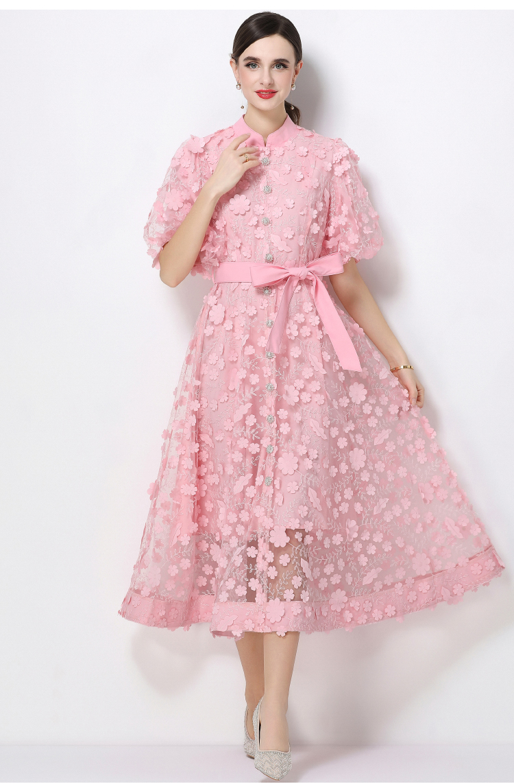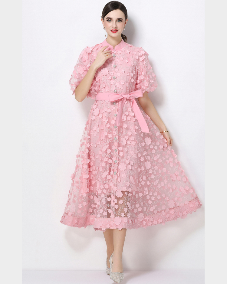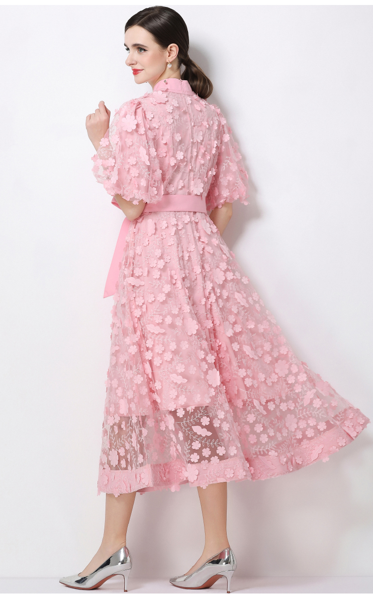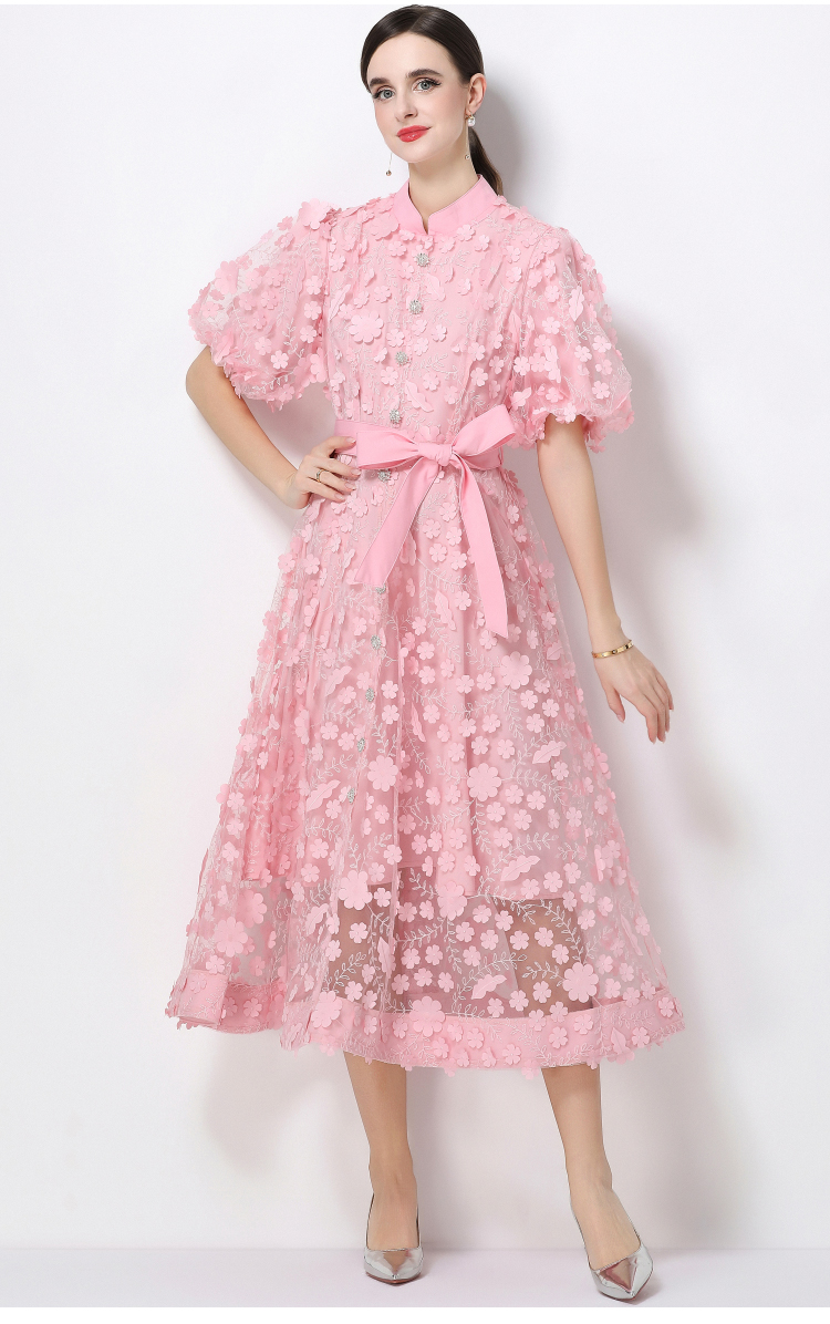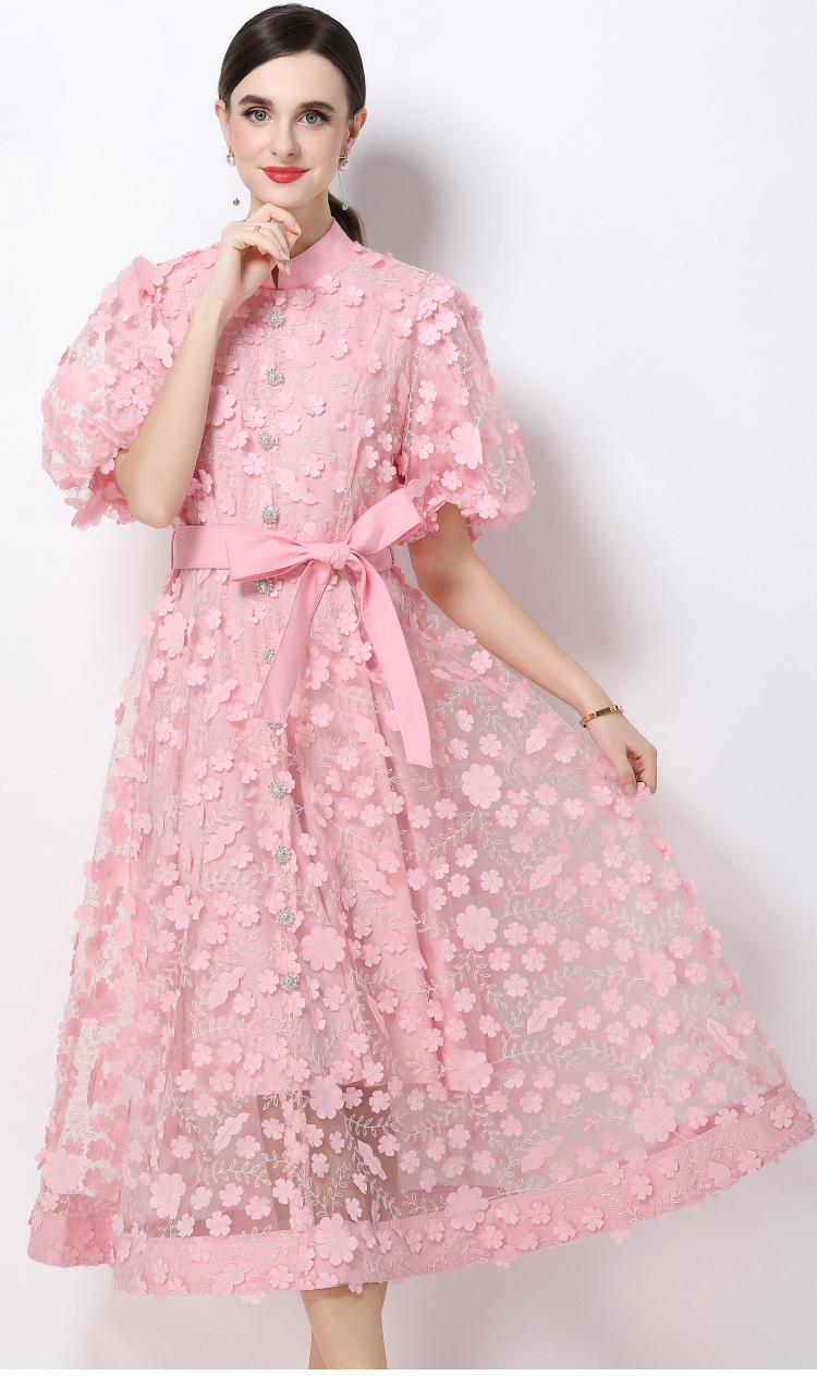 RY1746# 实拍法式浪漫风立体花朵刺绣立领连衣裙长袖收腰优雅显瘦A字裙