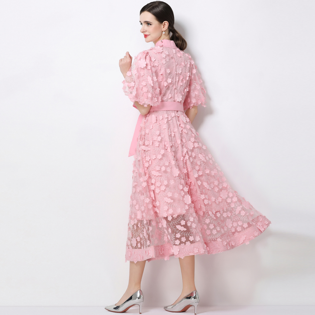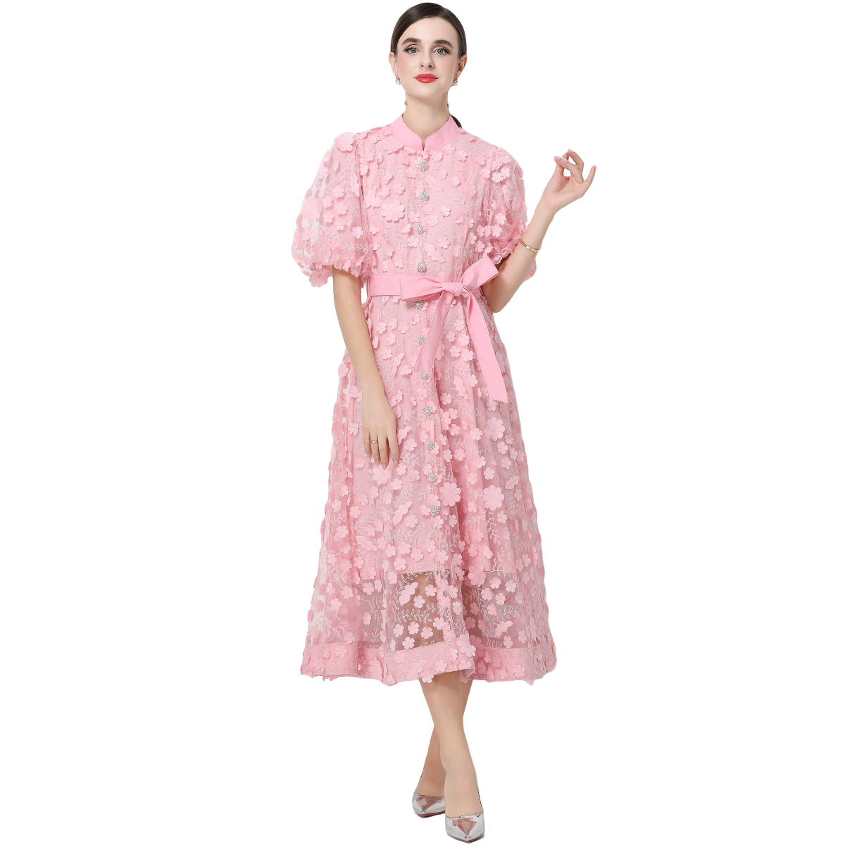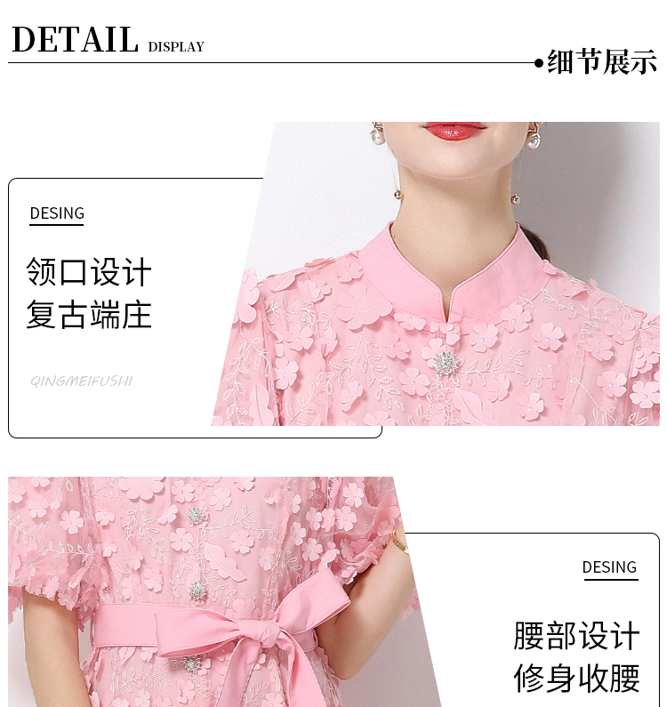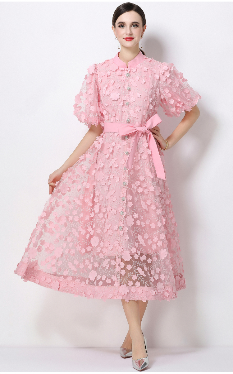 RY1746# 实拍法式浪漫风立体花朵刺绣立领连衣裙长袖收腰优雅显瘦A字裙