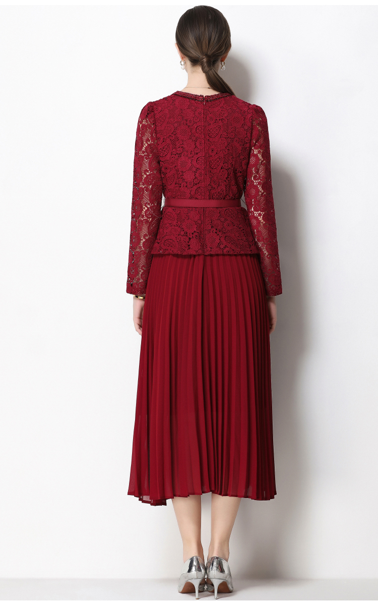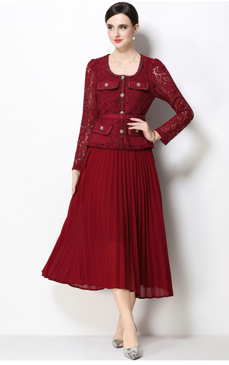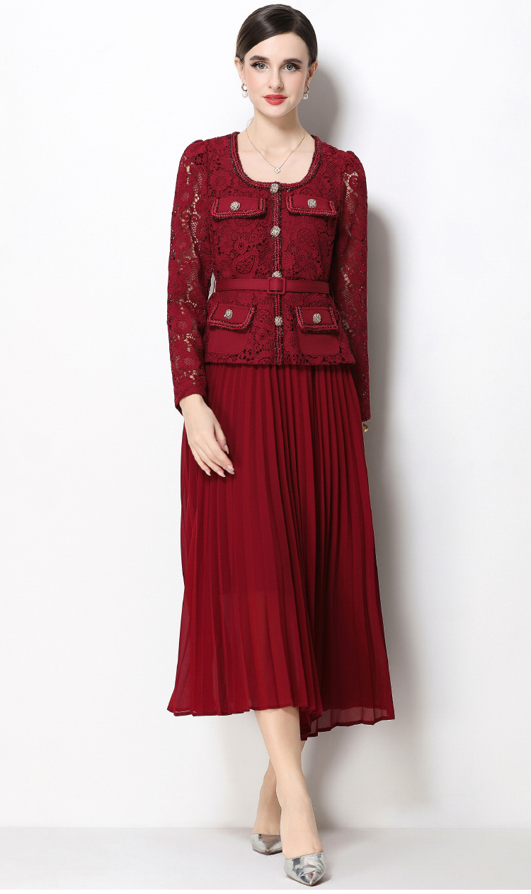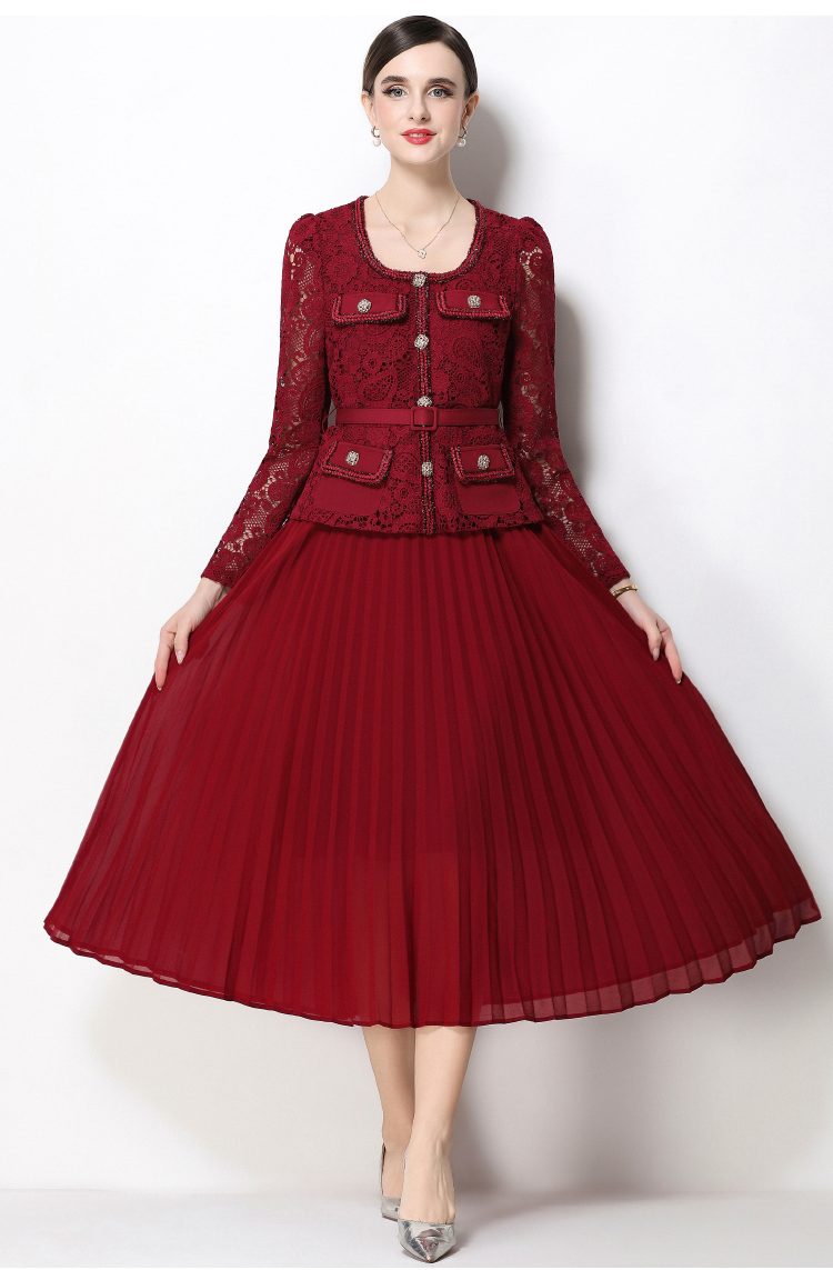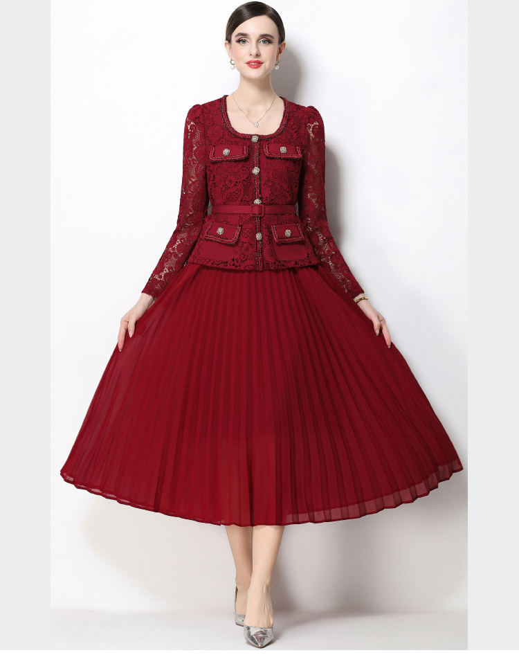 RY1747# 实拍法式小香风新款轻奢修身显瘦方领蕾丝拼接中长百褶裙