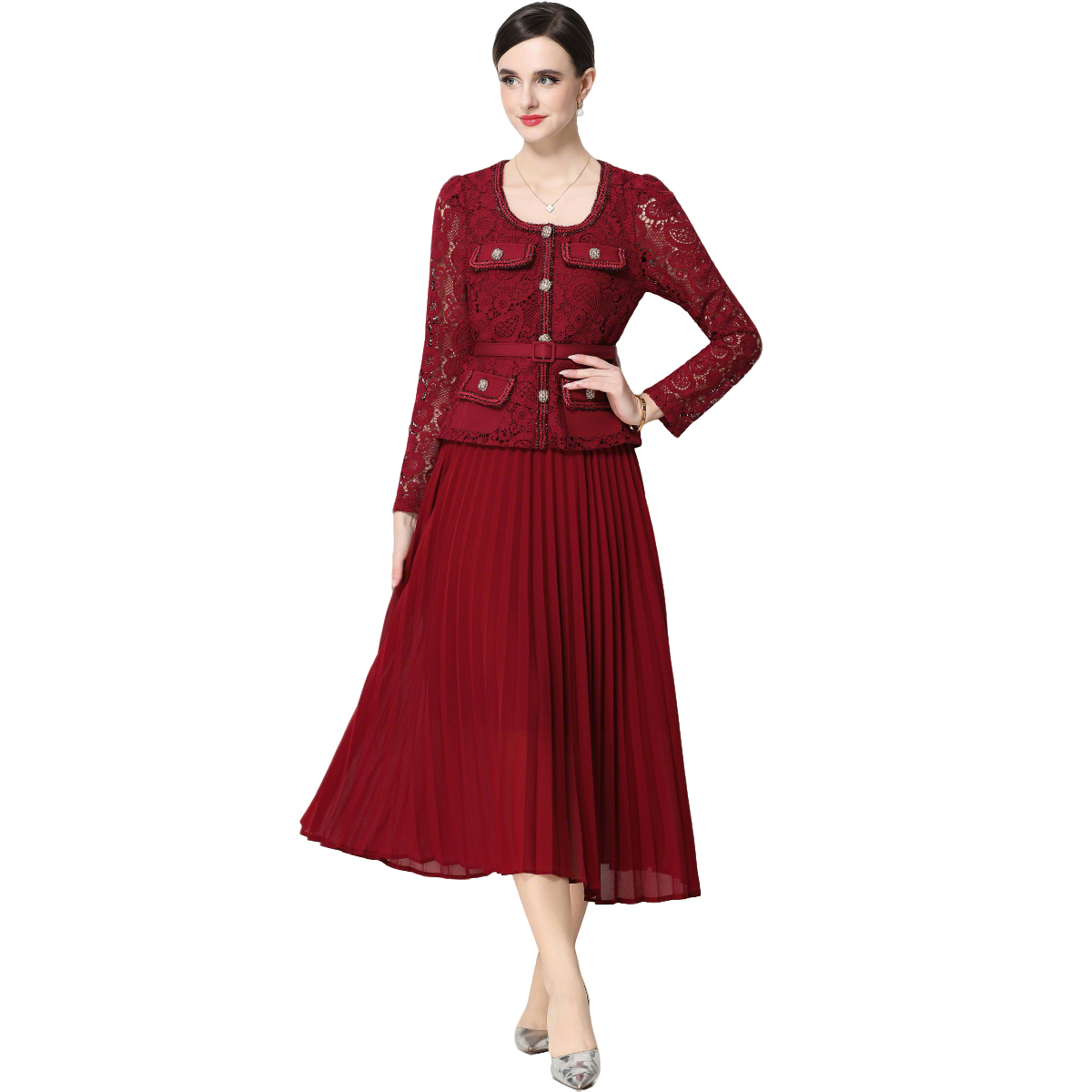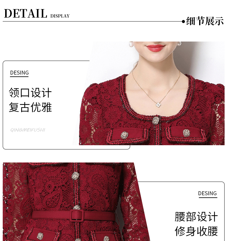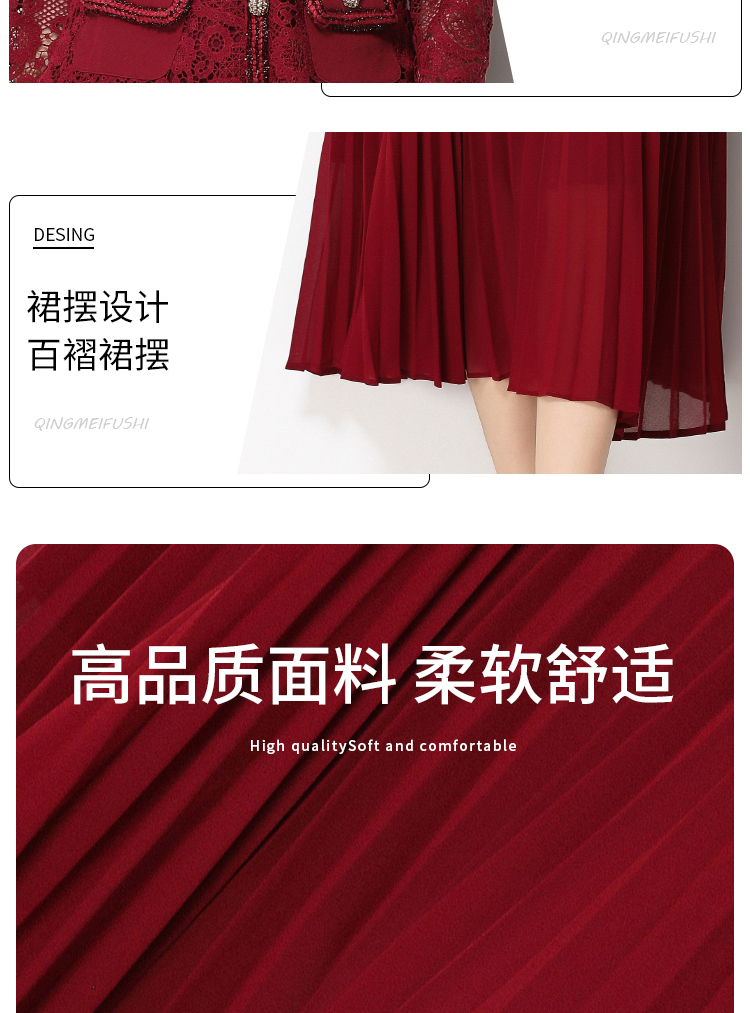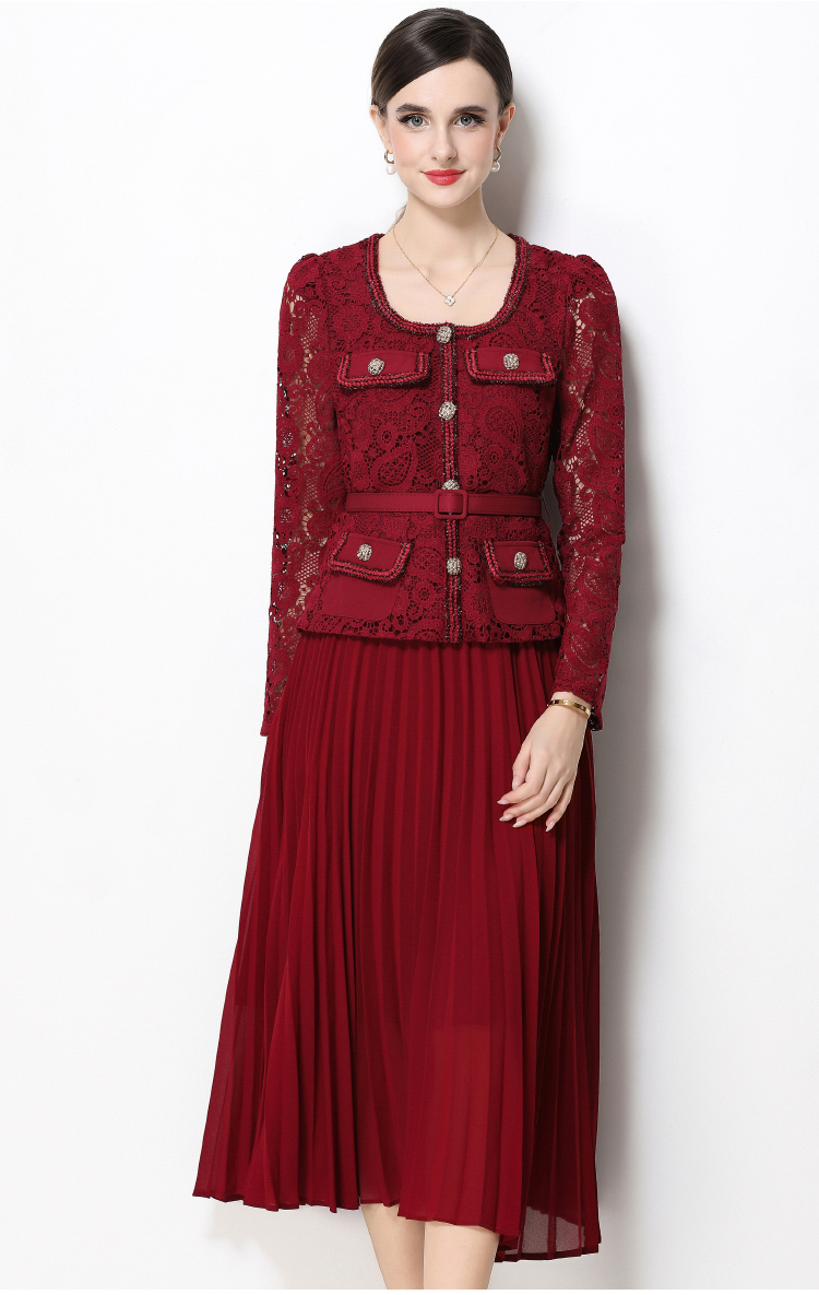 RY1747# 实拍法式小香风新款轻奢修身显瘦方领蕾丝拼接中长百褶裙