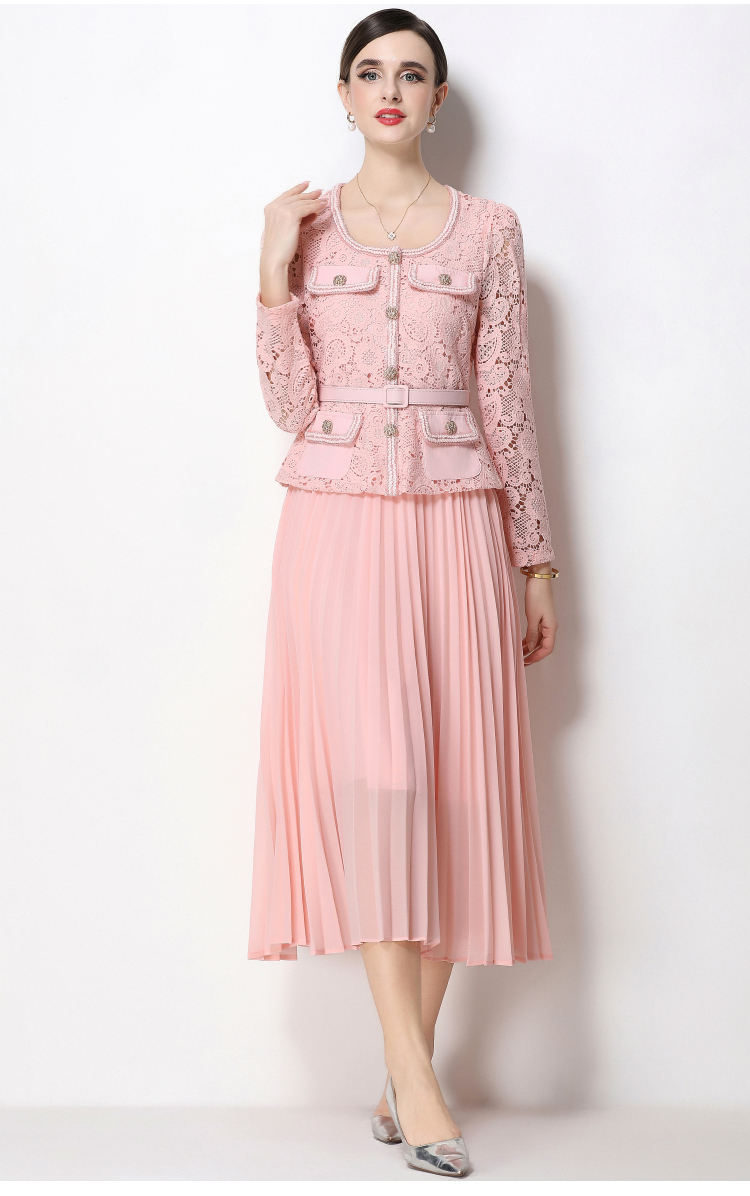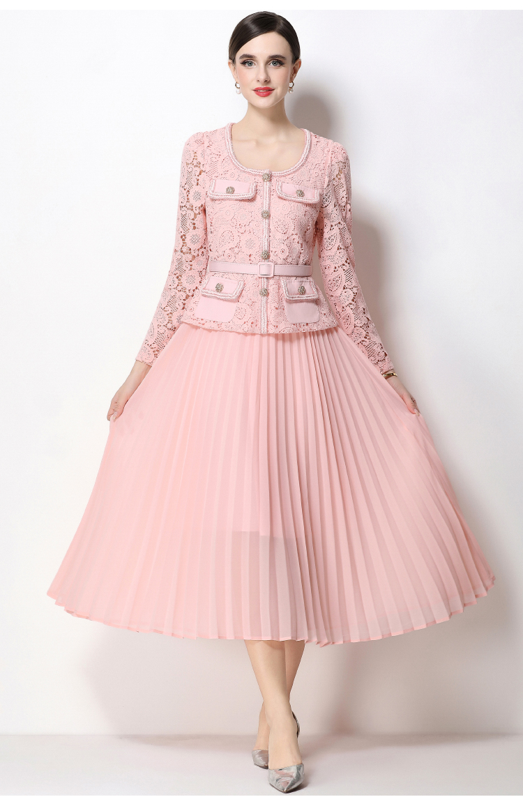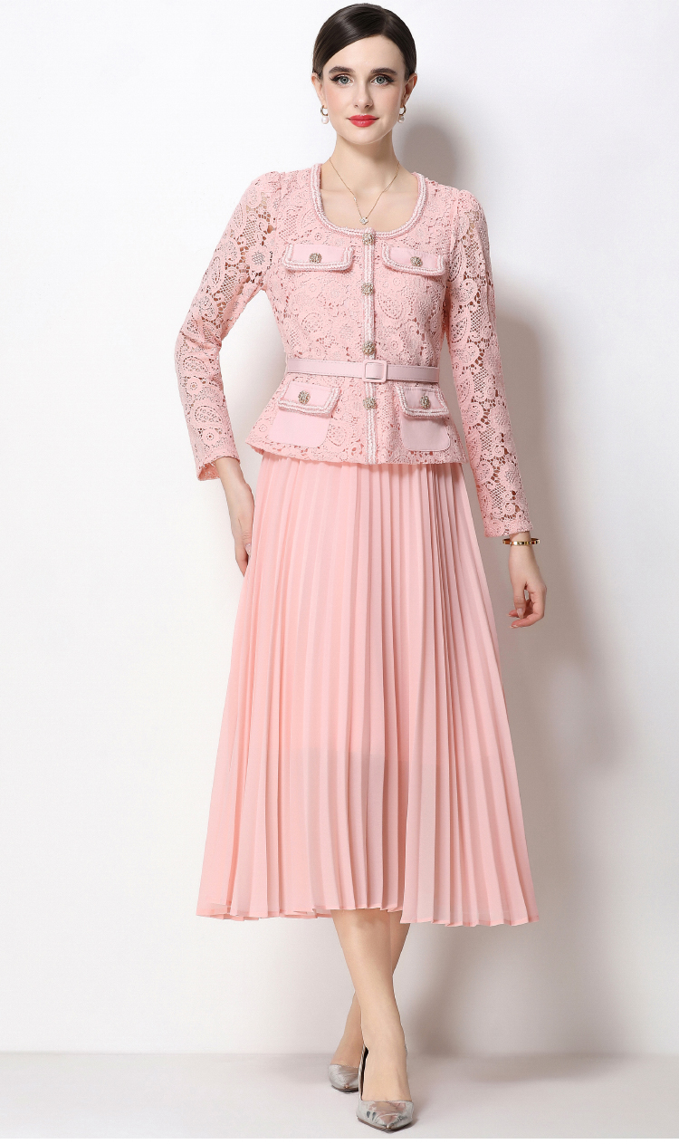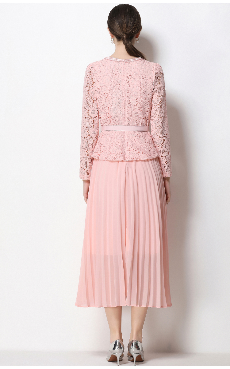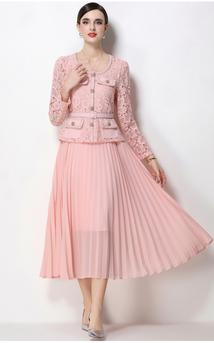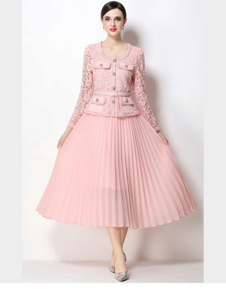 RY1749# 实拍法式小香风新款轻奢修身显瘦方领蕾丝拼接中长百褶裙