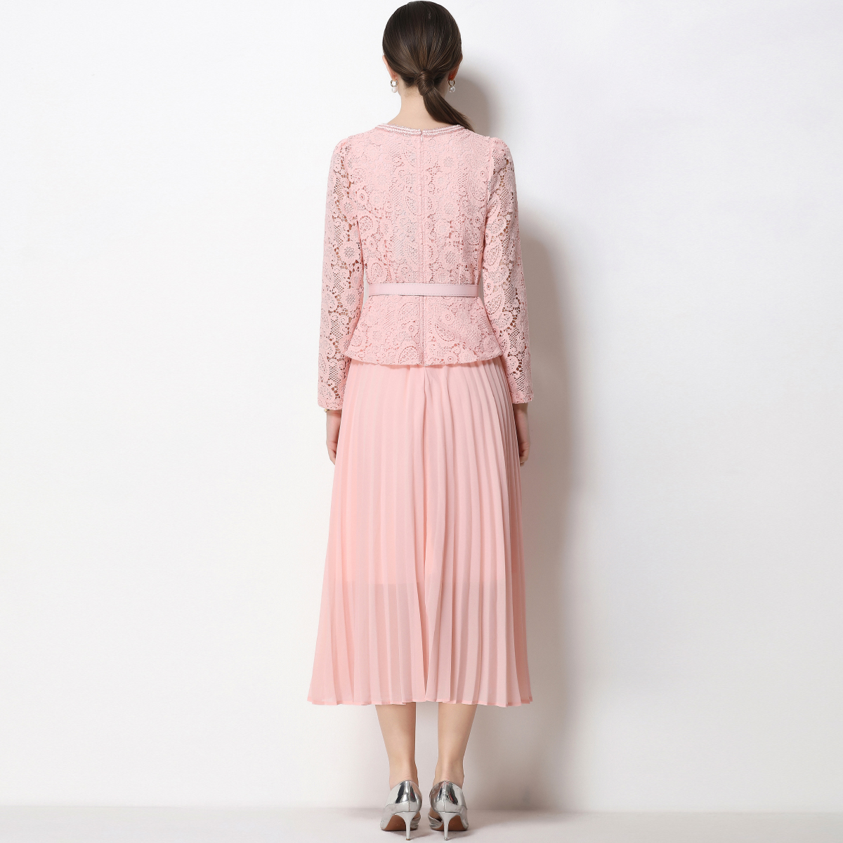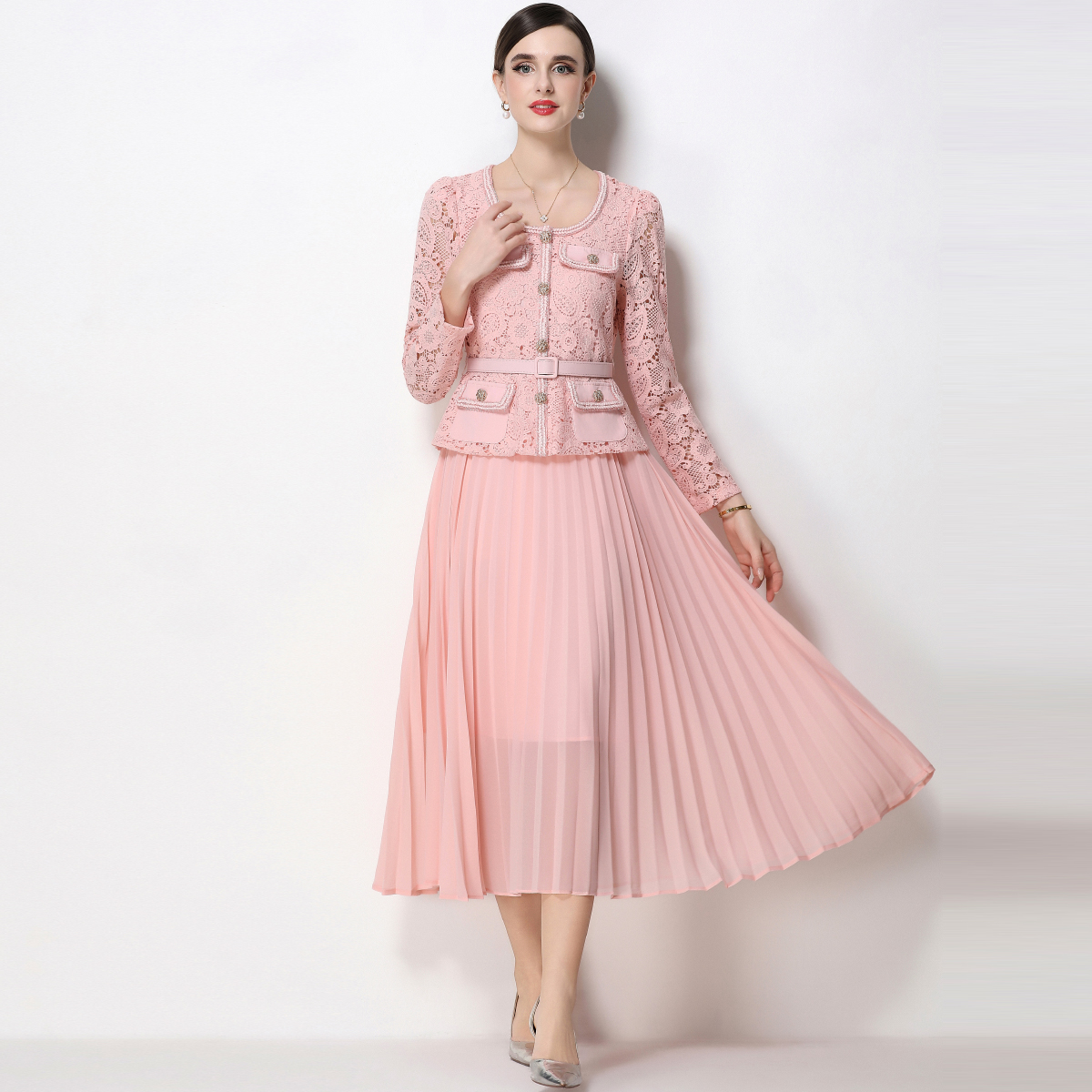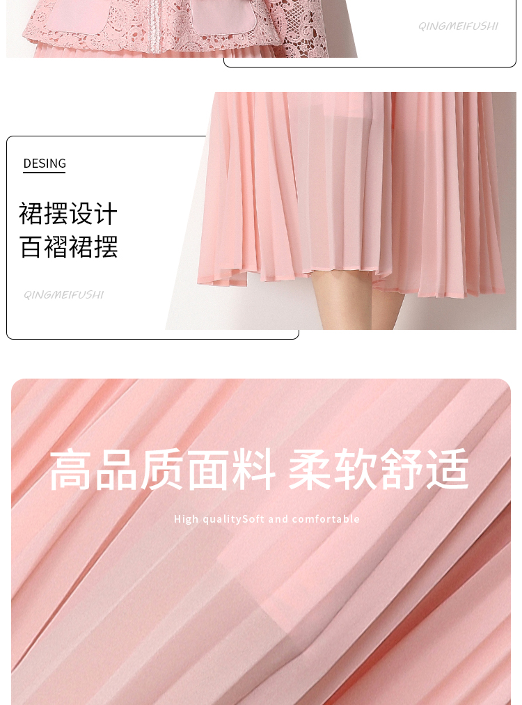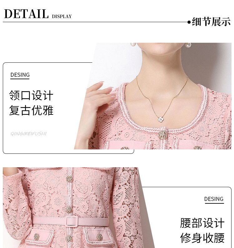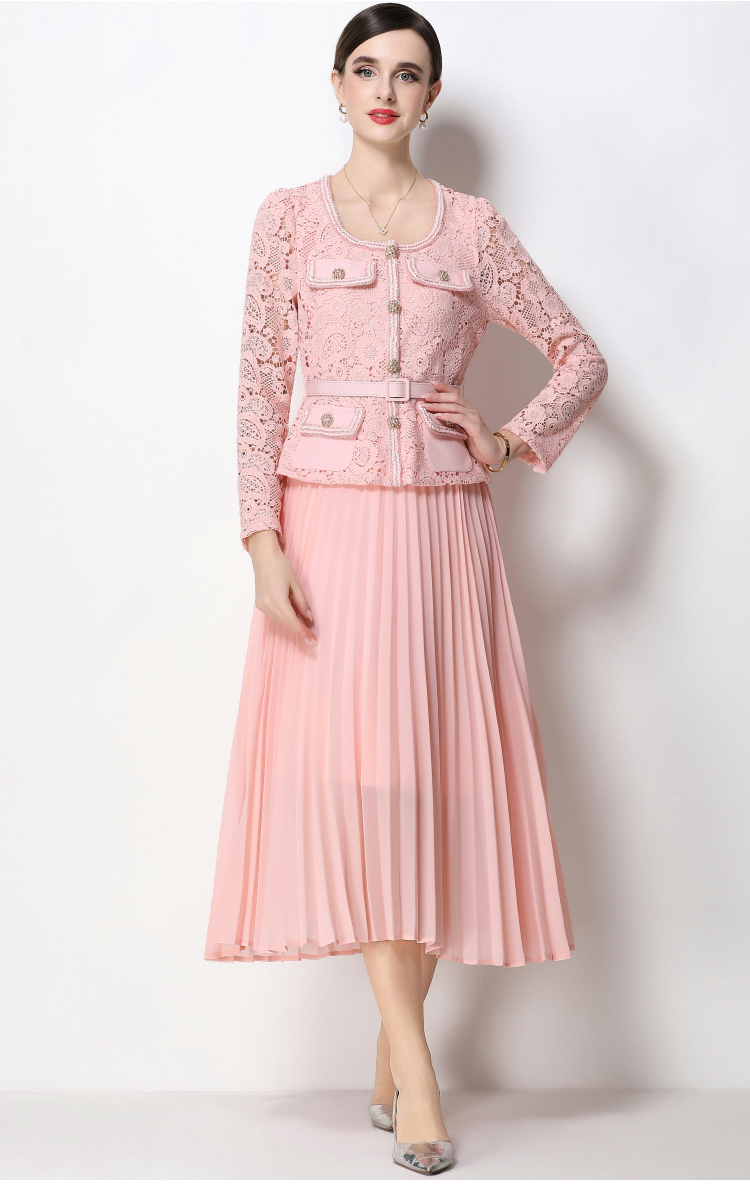 RY1749# 实拍法式小香风新款轻奢修身显瘦方领蕾丝拼接中长百褶裙
