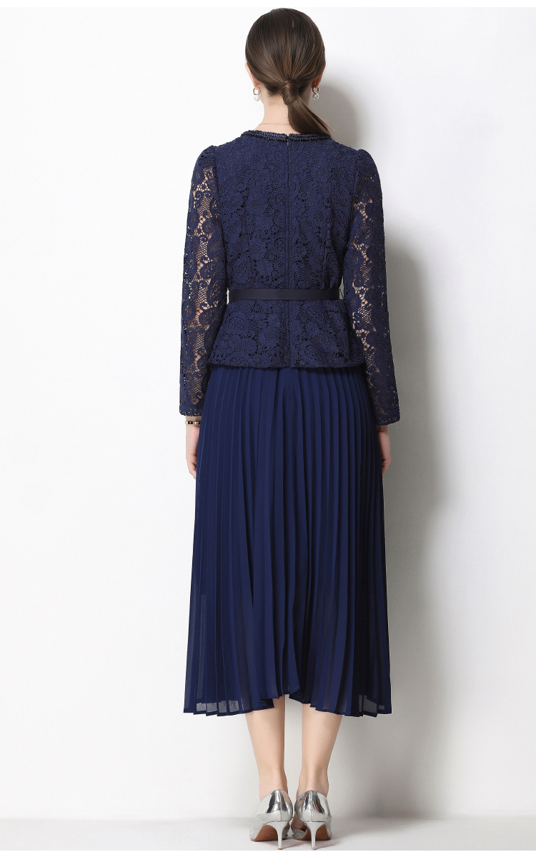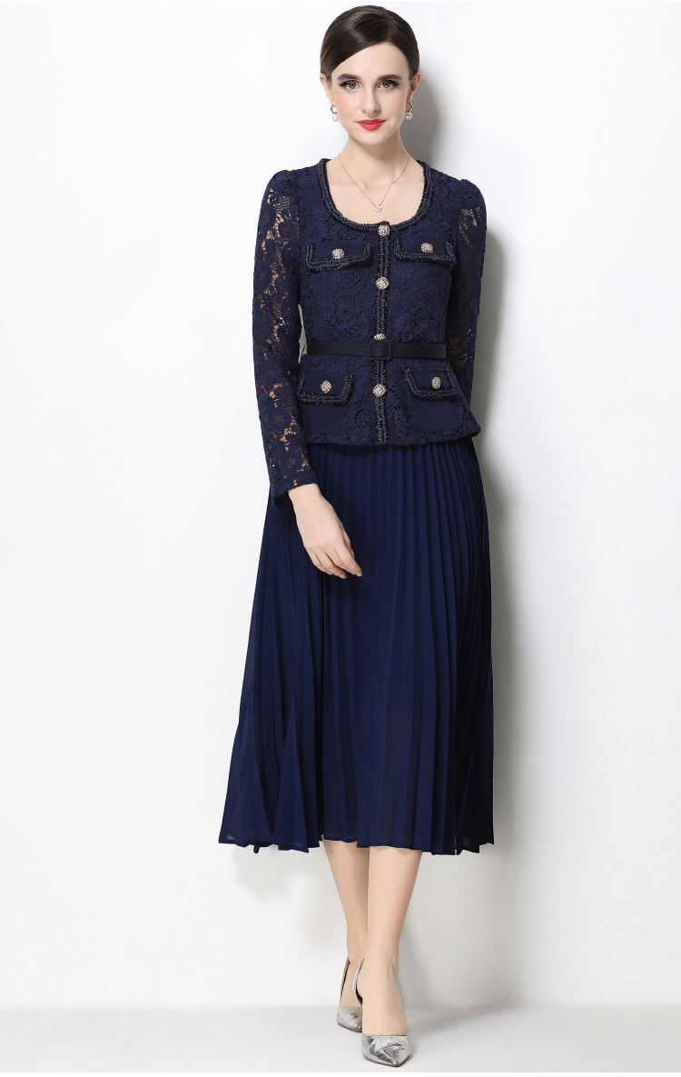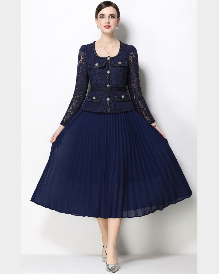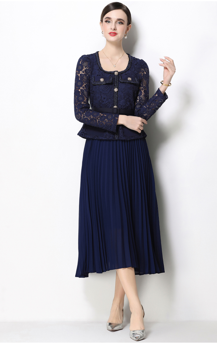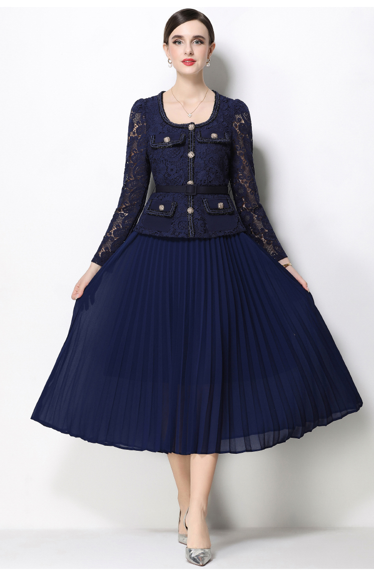 RY1751# 实拍法式小香风新款轻奢修身显瘦方领蕾丝拼接中长百褶裙