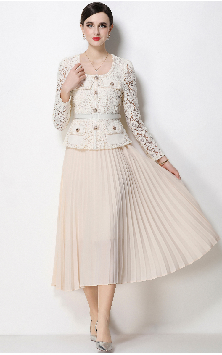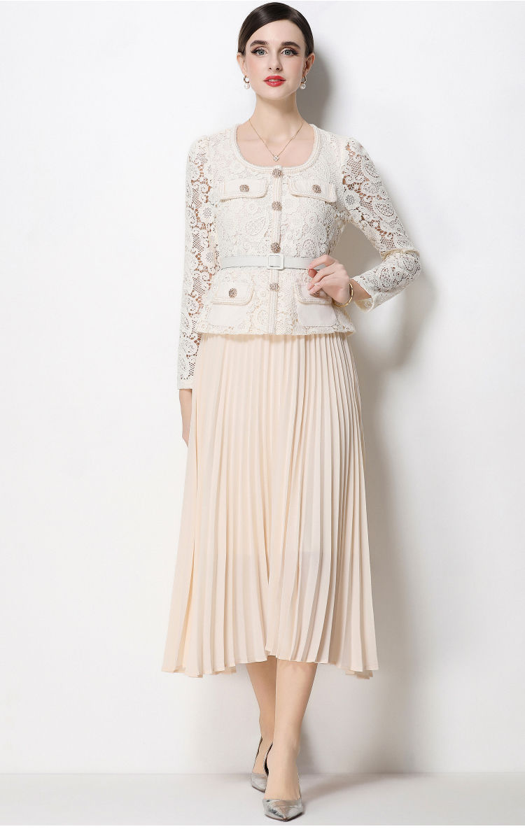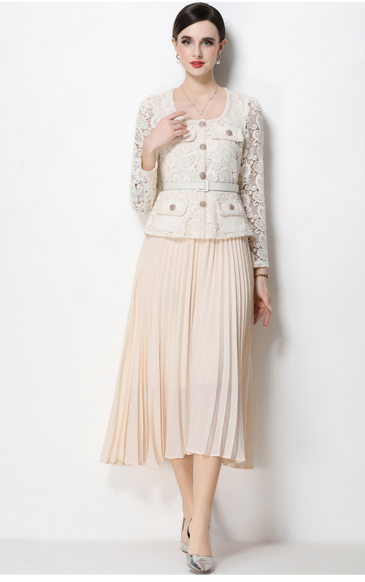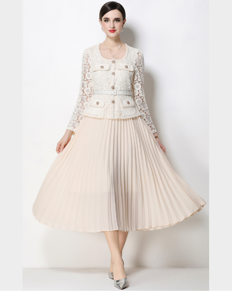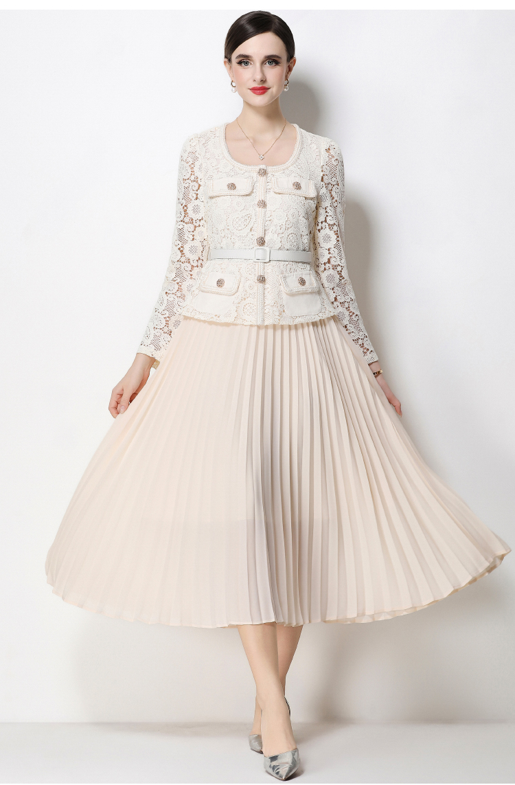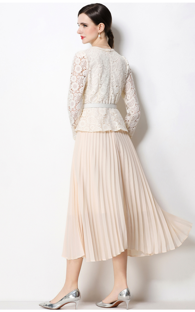 RY1752# 实拍法式小香风新款轻奢修身显瘦方领蕾丝拼接中长百褶裙