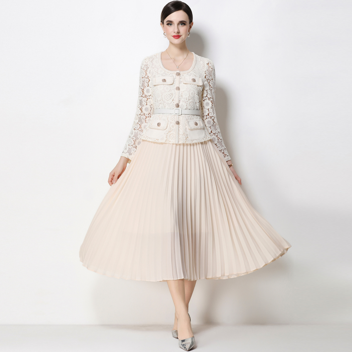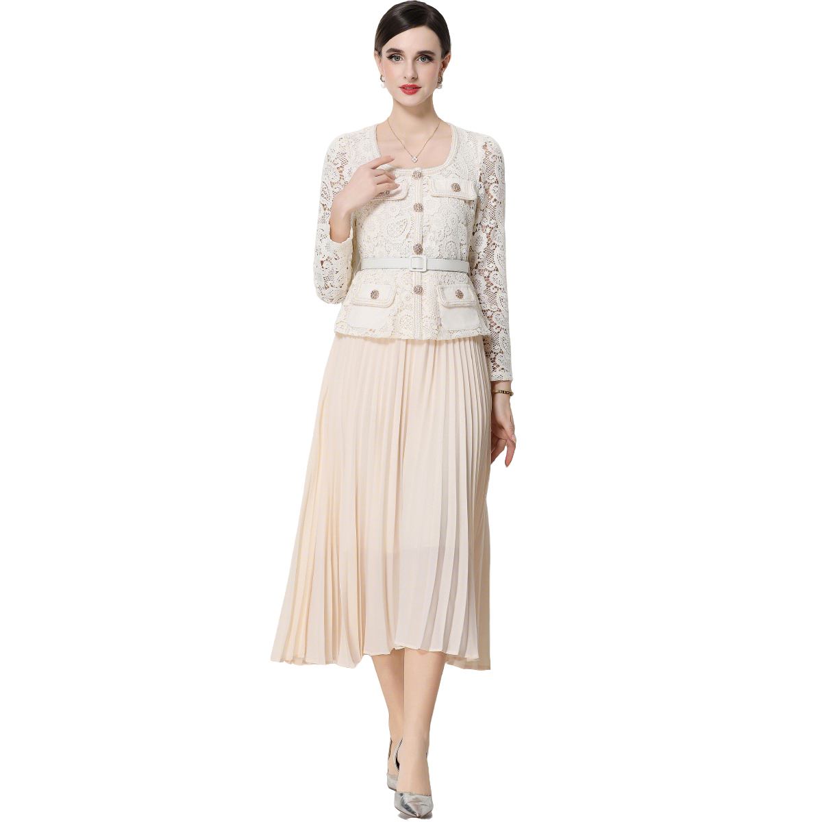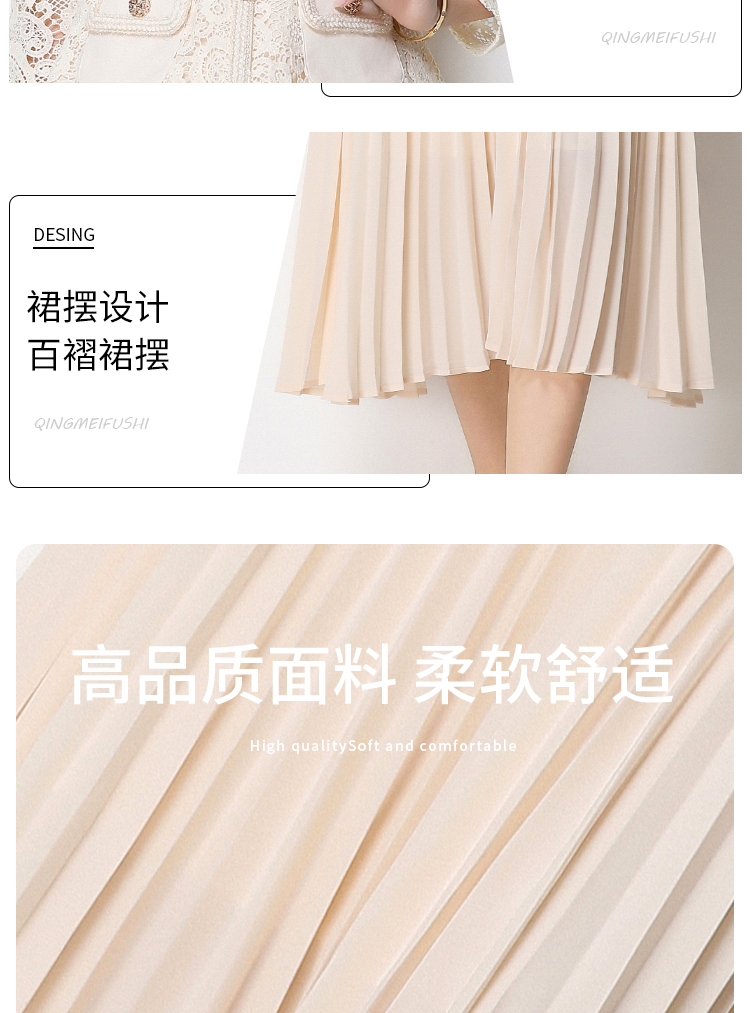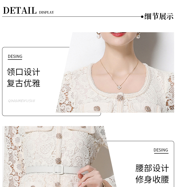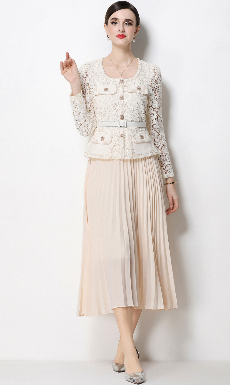 RY1752# 实拍法式小香风新款轻奢修身显瘦方领蕾丝拼接中长百褶裙