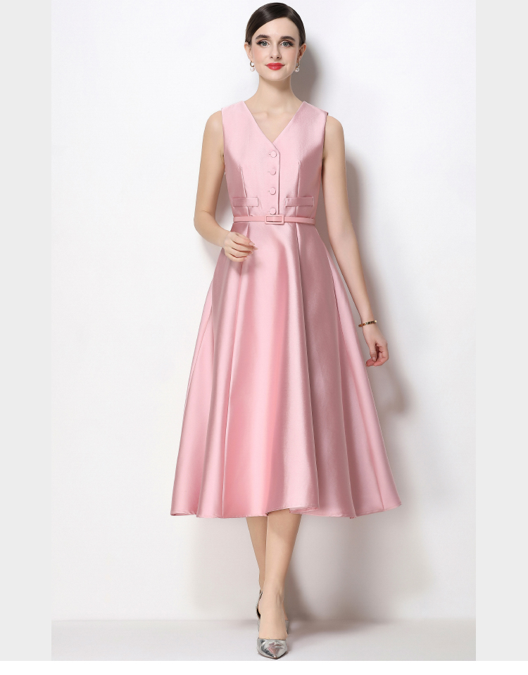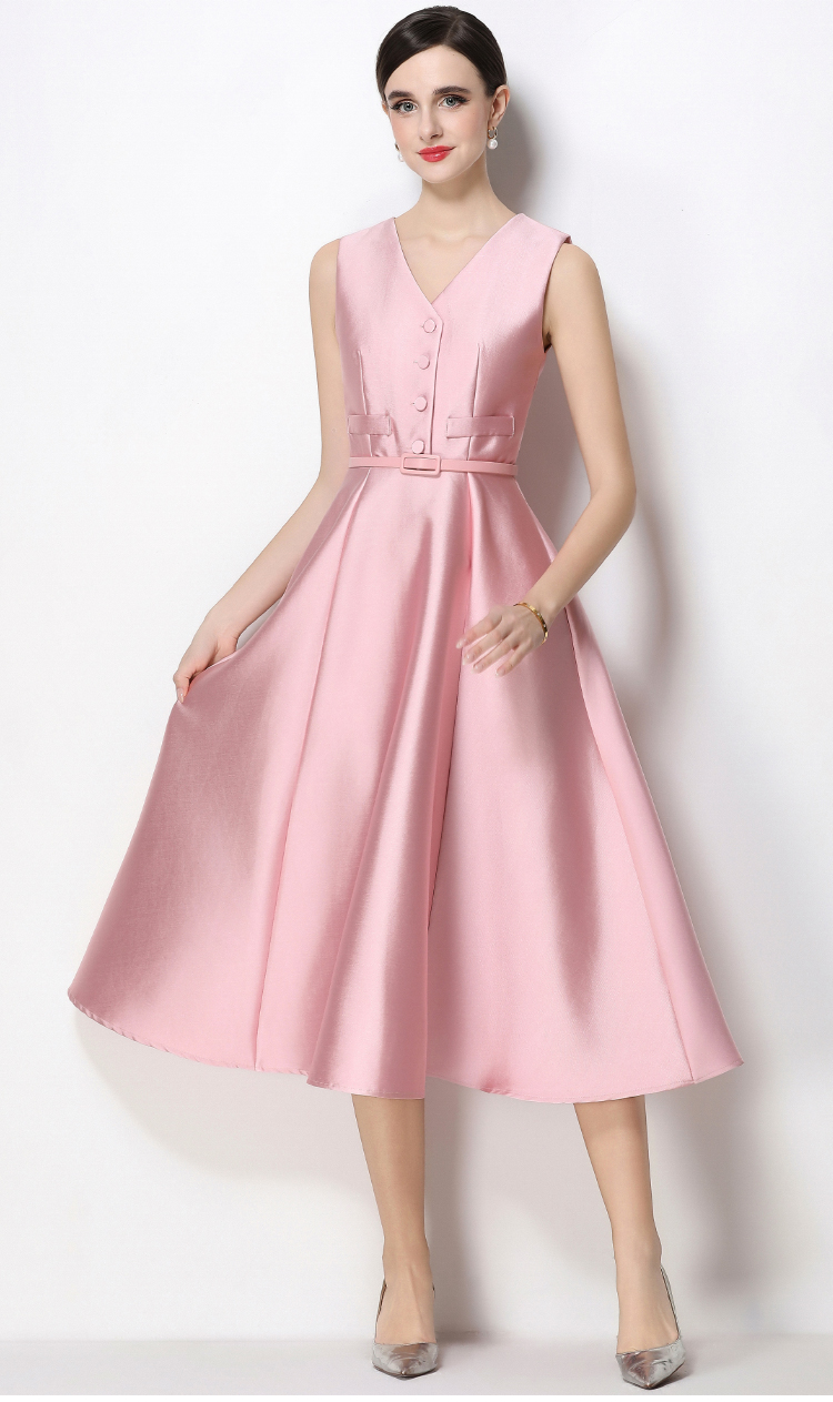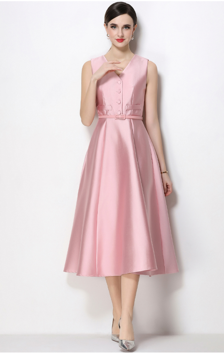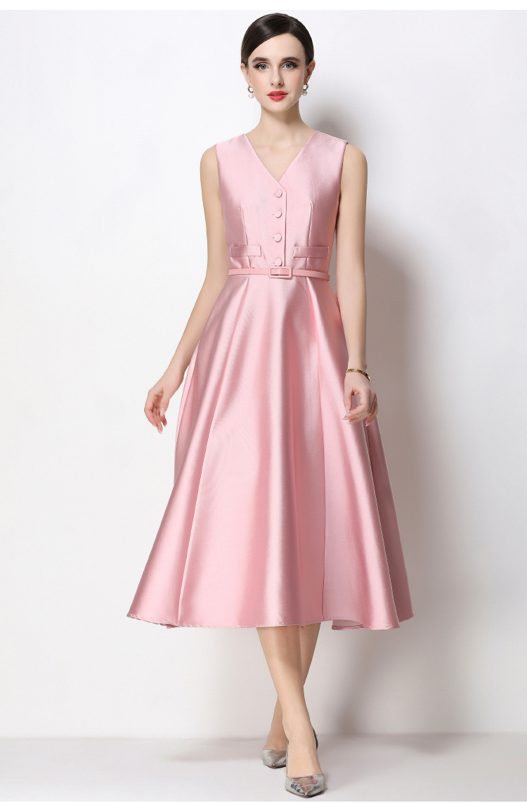 RY1755# 实拍优雅气质高级感V领无袖连衣裙女收腰显瘦单排扣中长款送腰带
