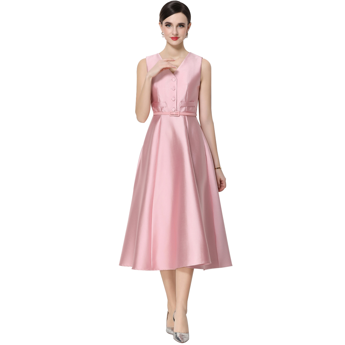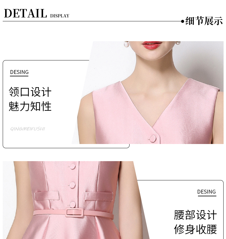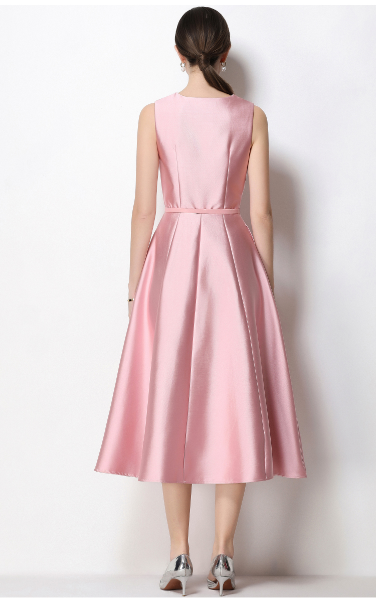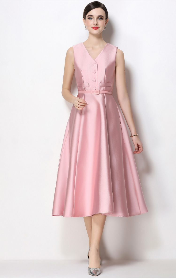 RY1755# 实拍优雅气质高级感V领无袖连衣裙女收腰显瘦单排扣中长款送腰带