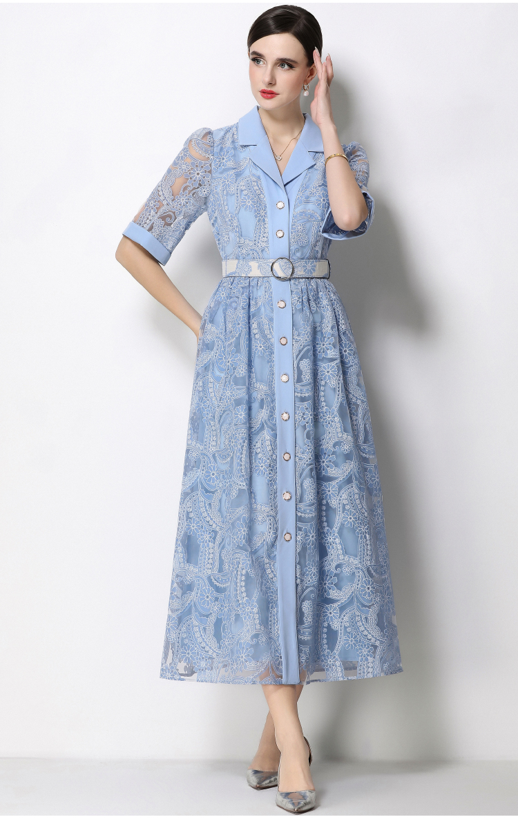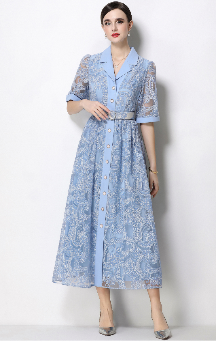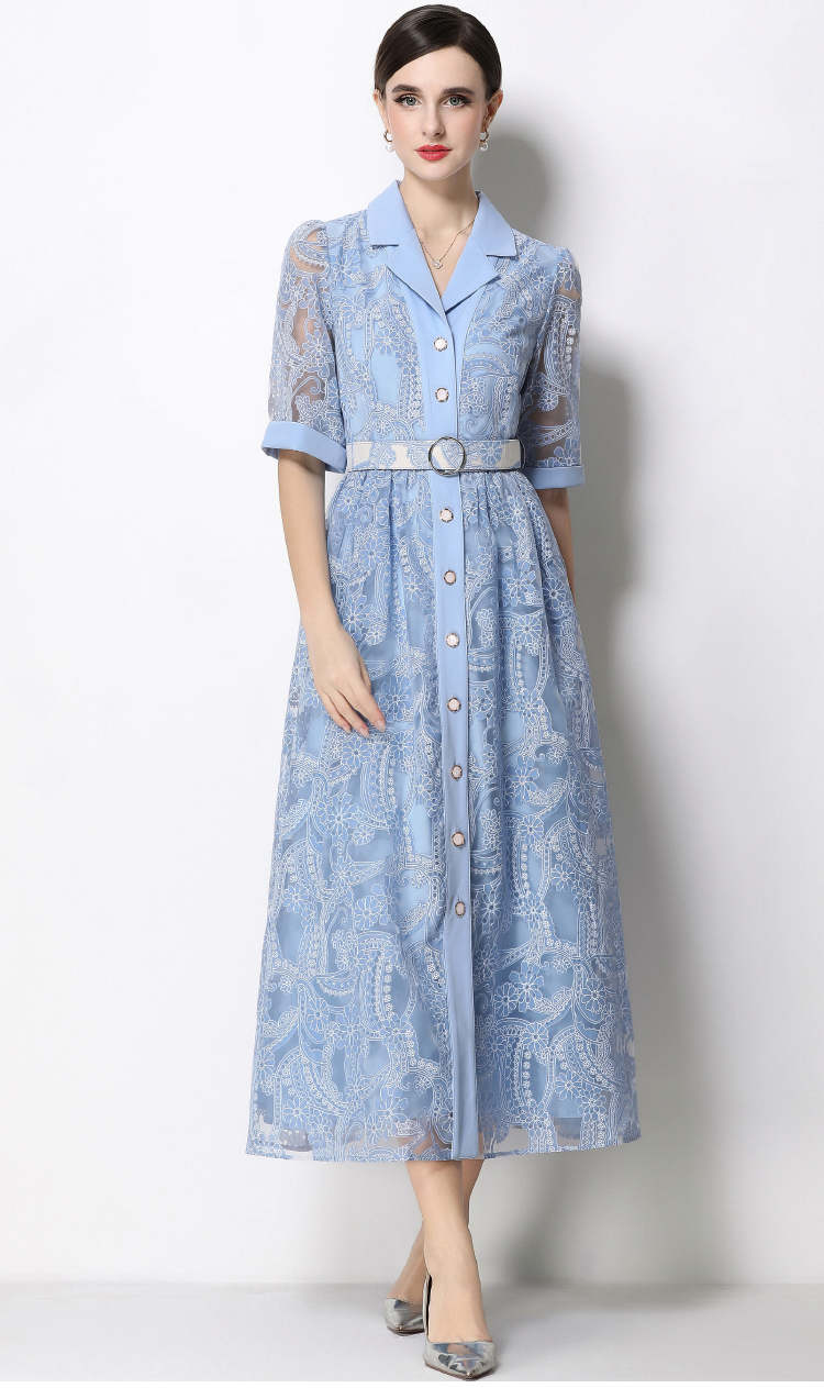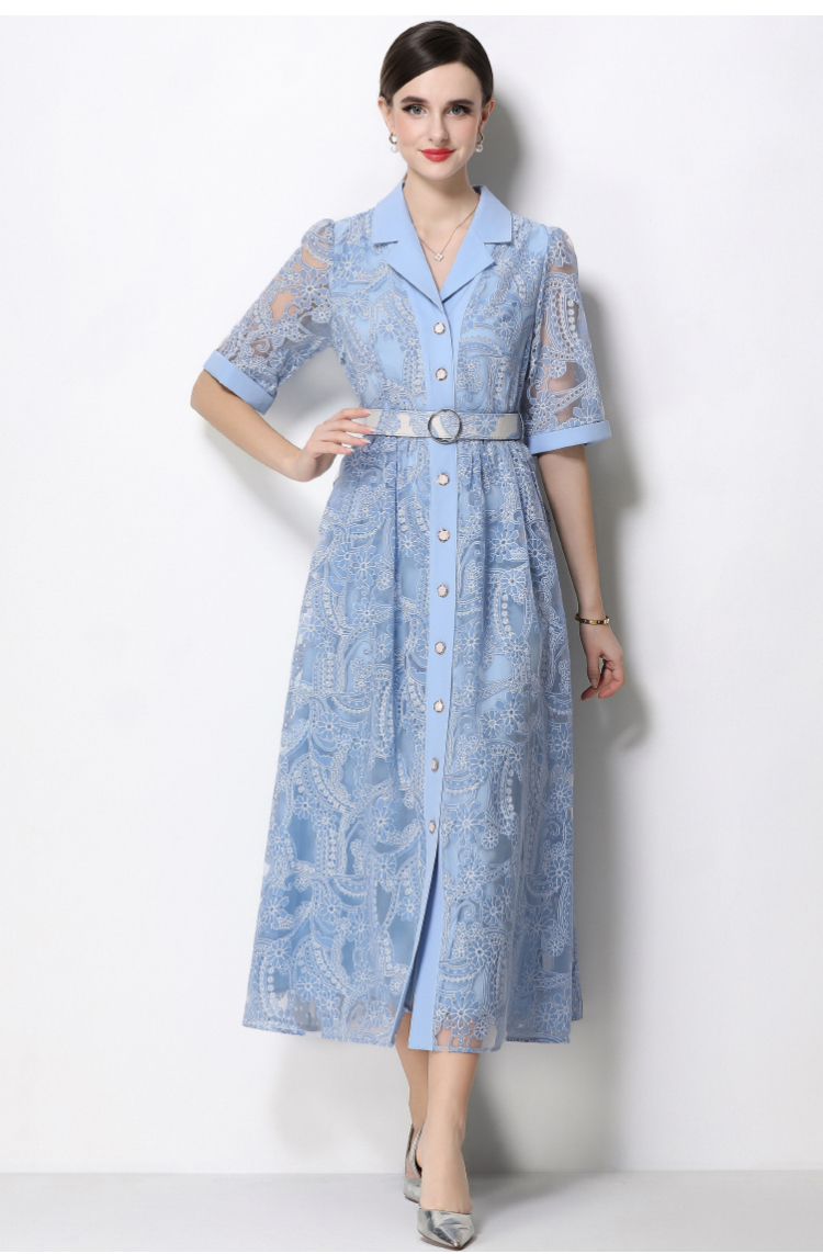 RY1757# 实拍法式轻奢重工蕾丝连衣裙女西装领收腰镂空显瘦中长裙送腰带
