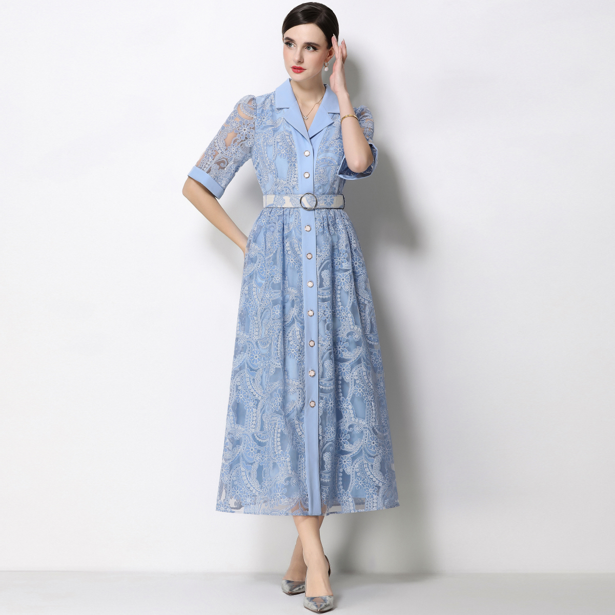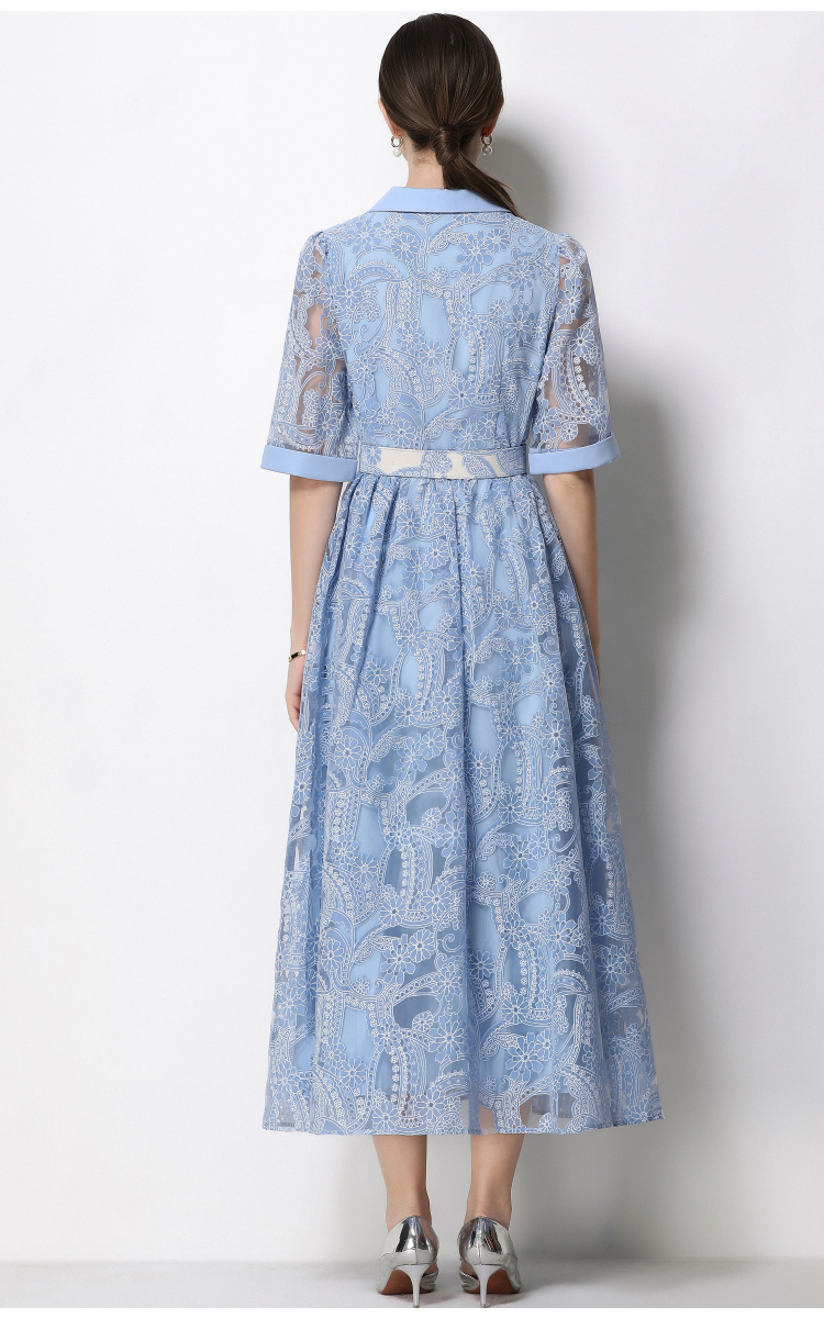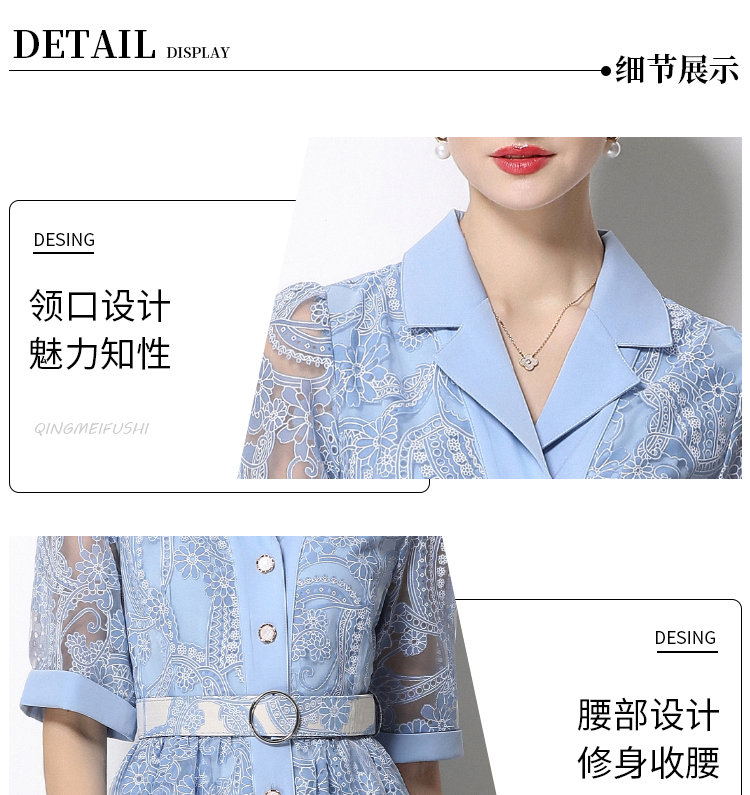 RY1757# 实拍法式轻奢重工蕾丝连衣裙女西装领收腰镂空显瘦中长裙送腰带