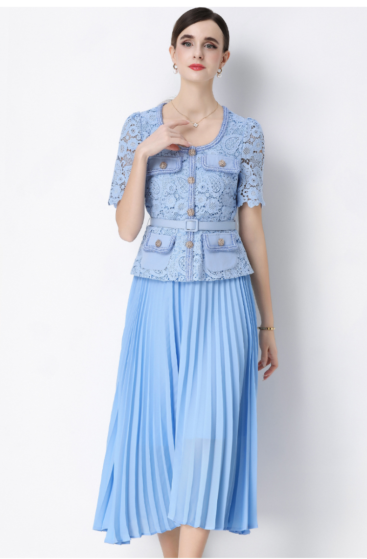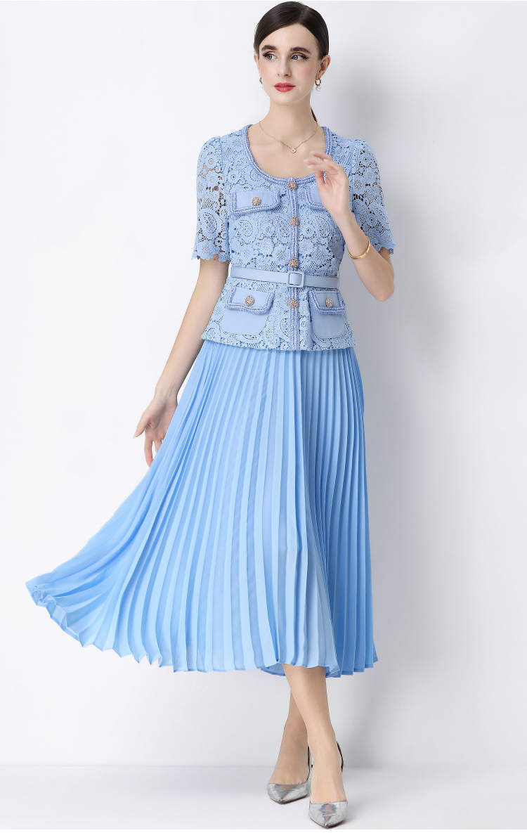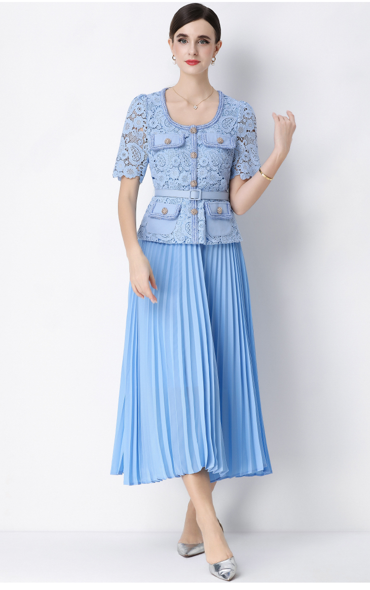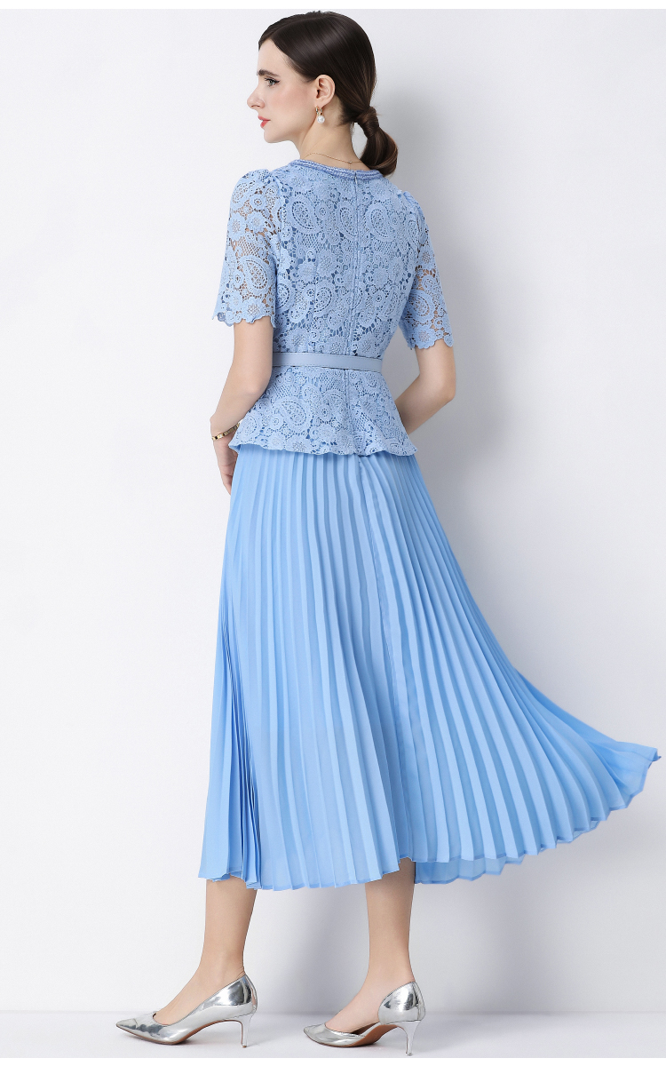 RY1761# 实拍法式名媛轻奢修身显瘦蕾丝拼接假两件中长百褶连衣裙