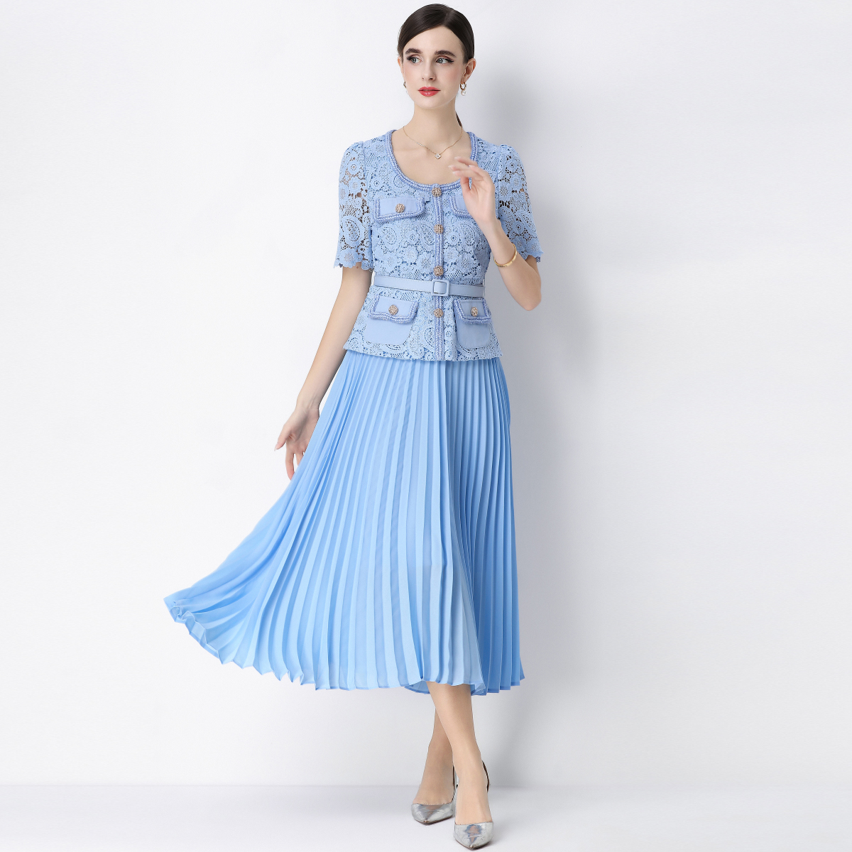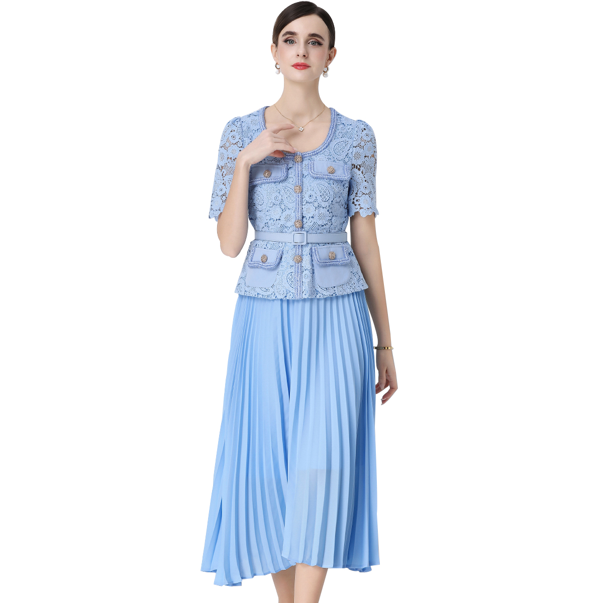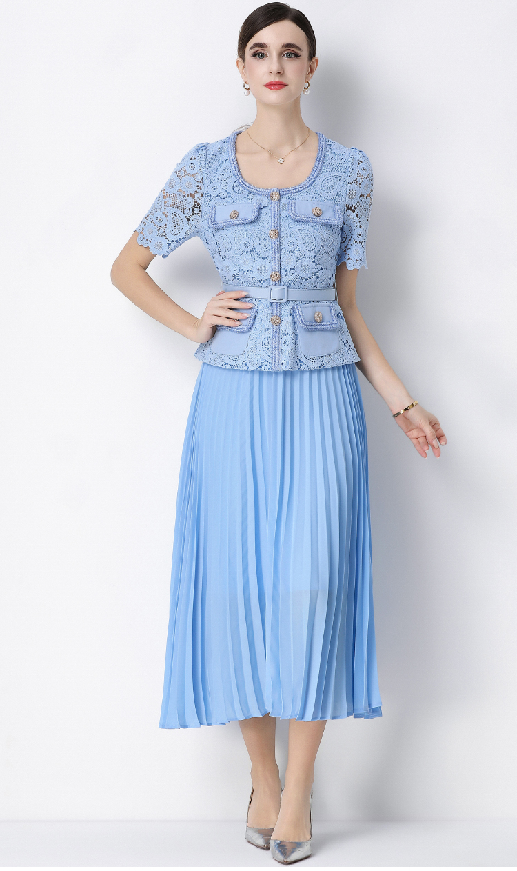 RY1761# 实拍法式名媛轻奢修身显瘦蕾丝拼接假两件中长百褶连衣裙