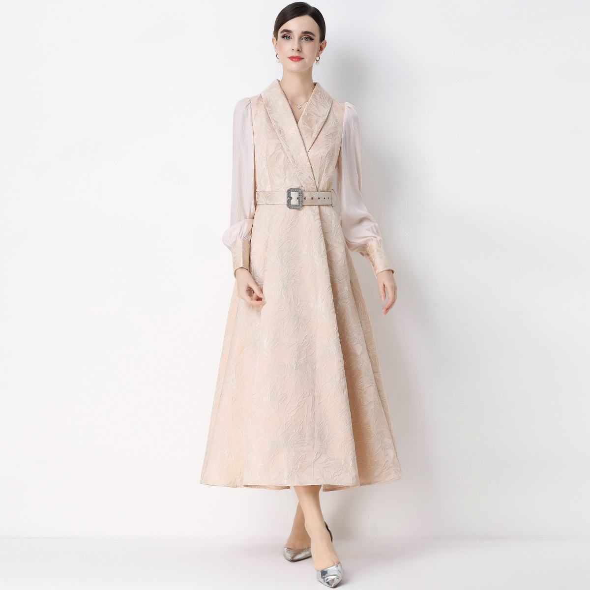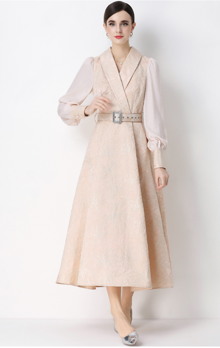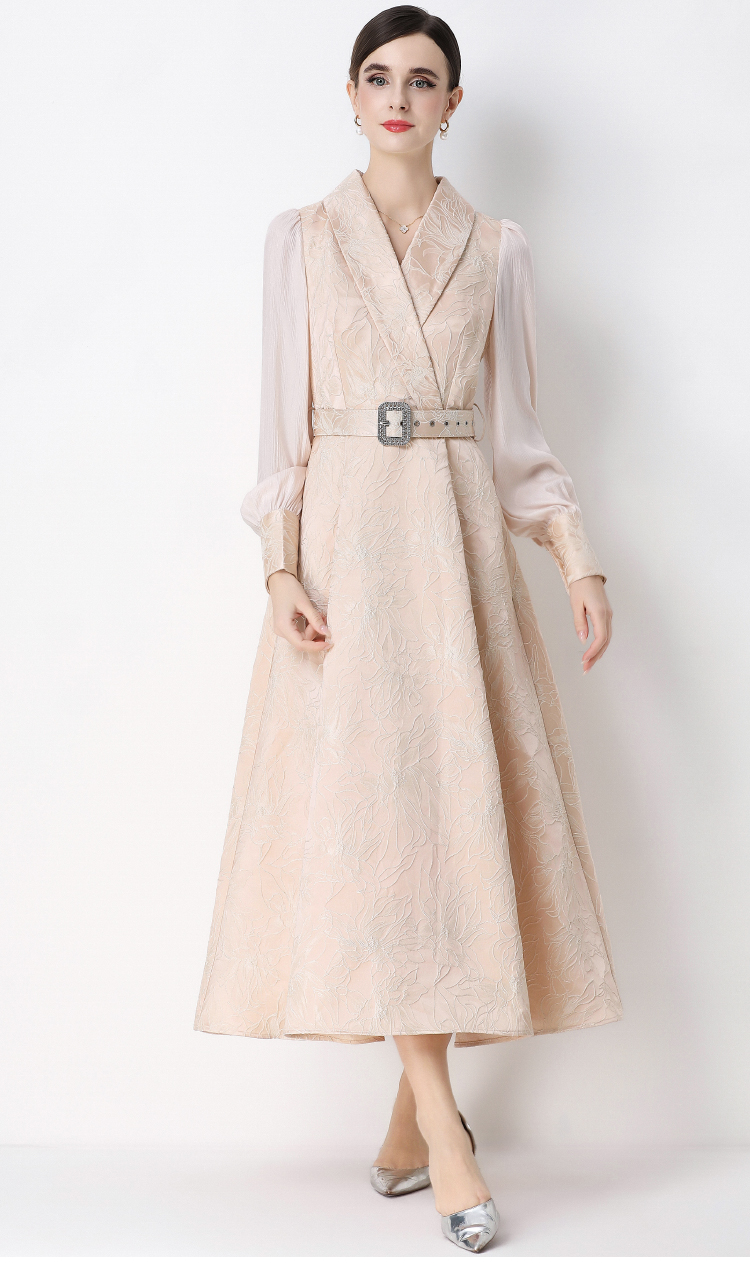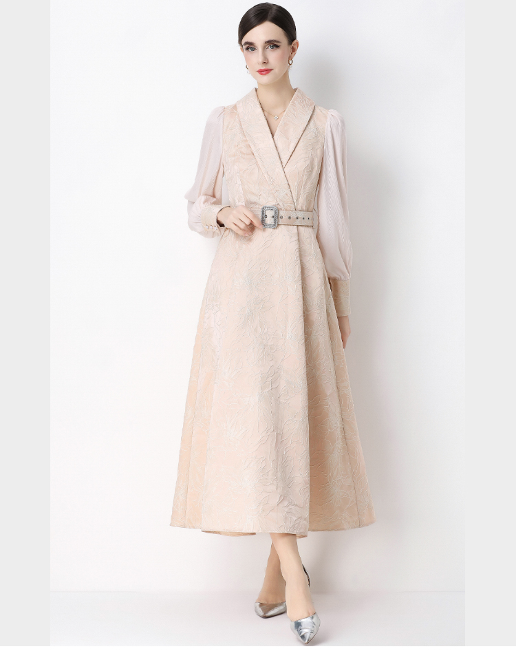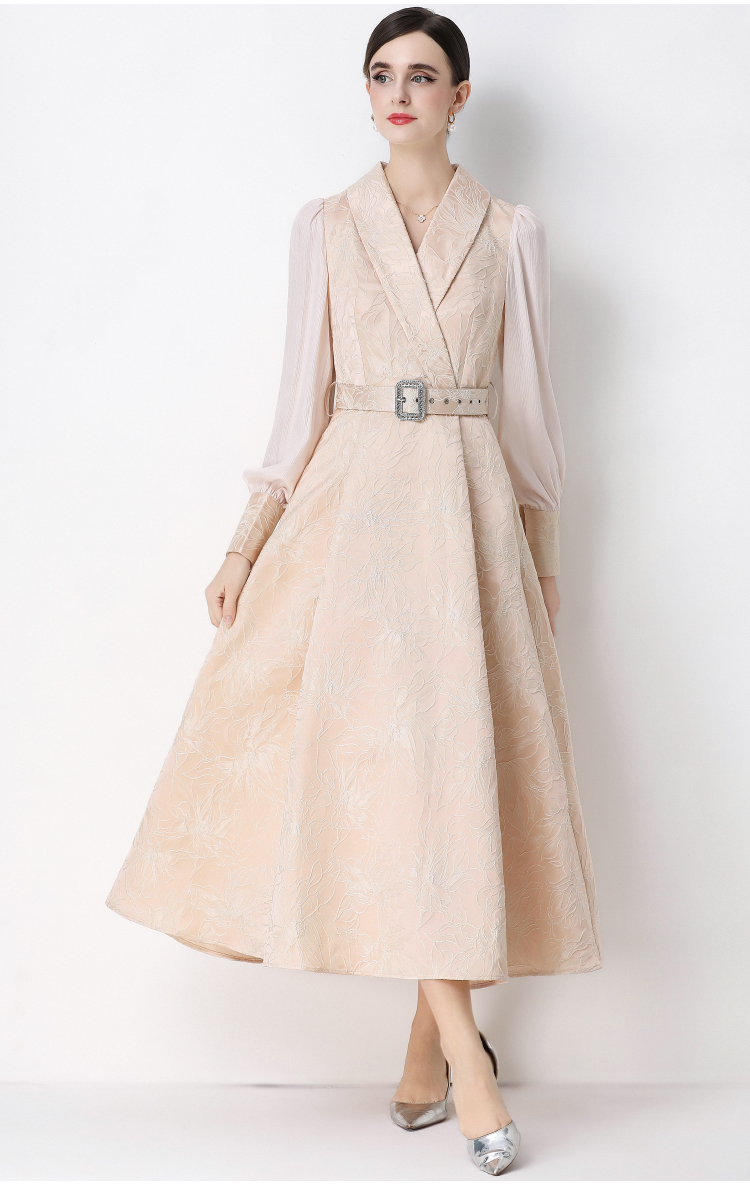RY1767# 实拍气质优雅通勤提花灯笼袖连衣裙西装领大摆长裙送腰带