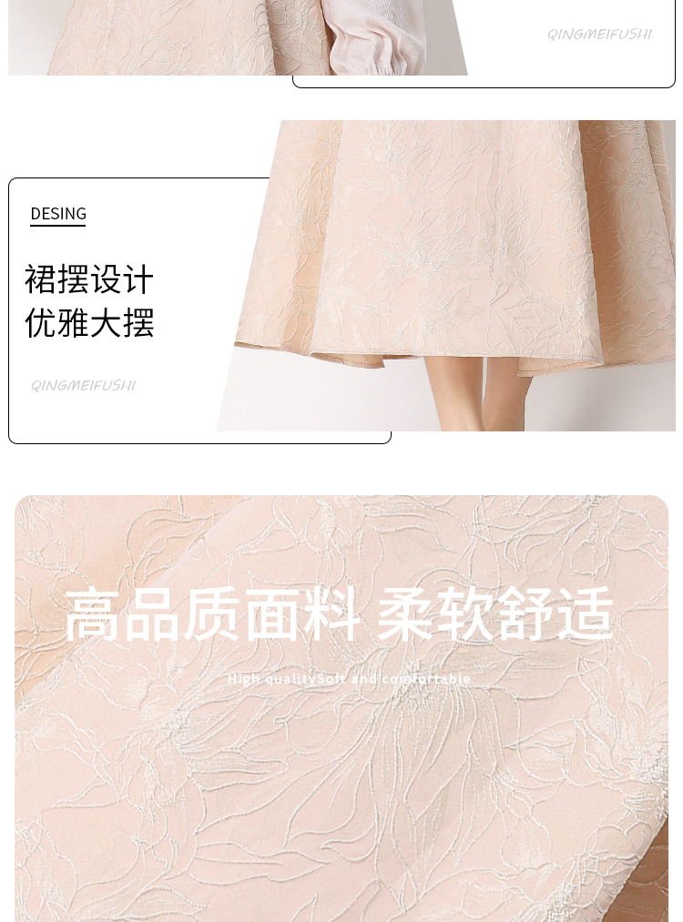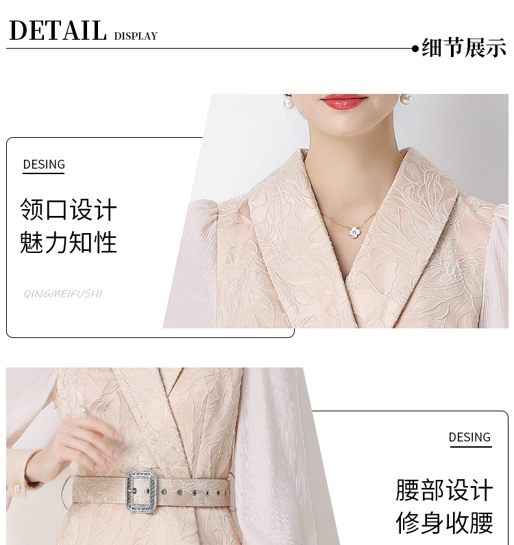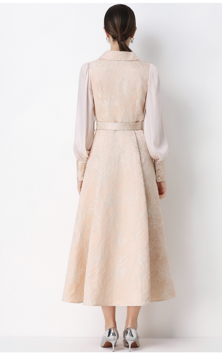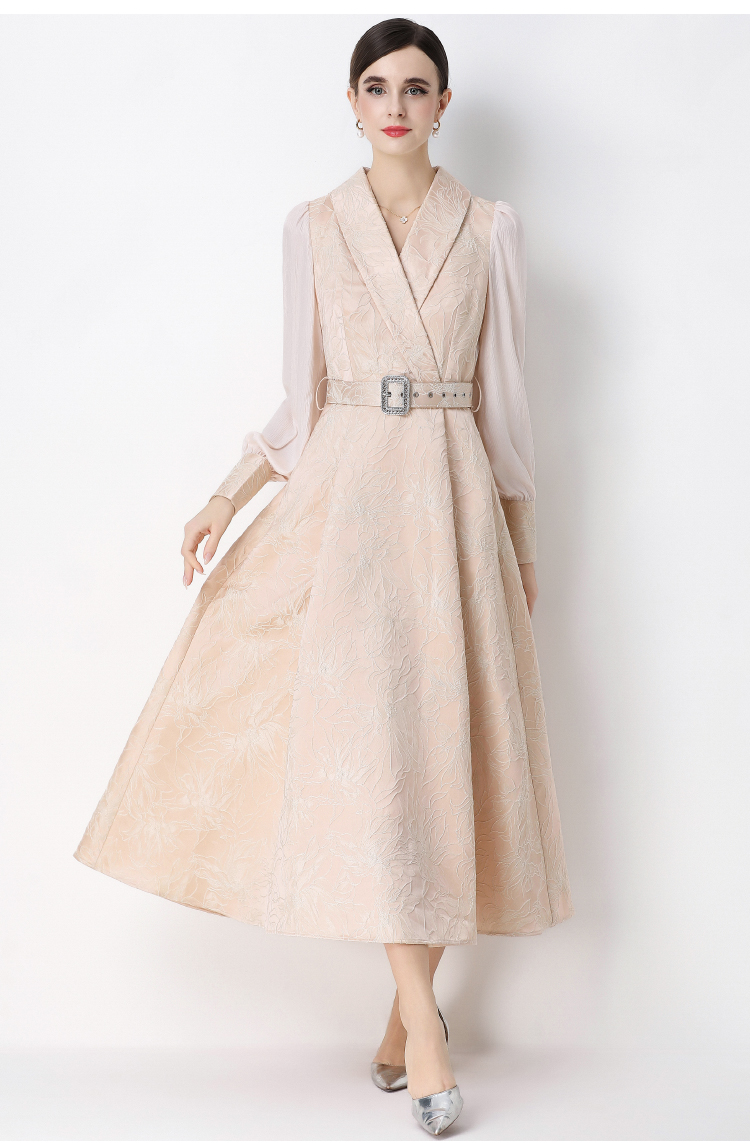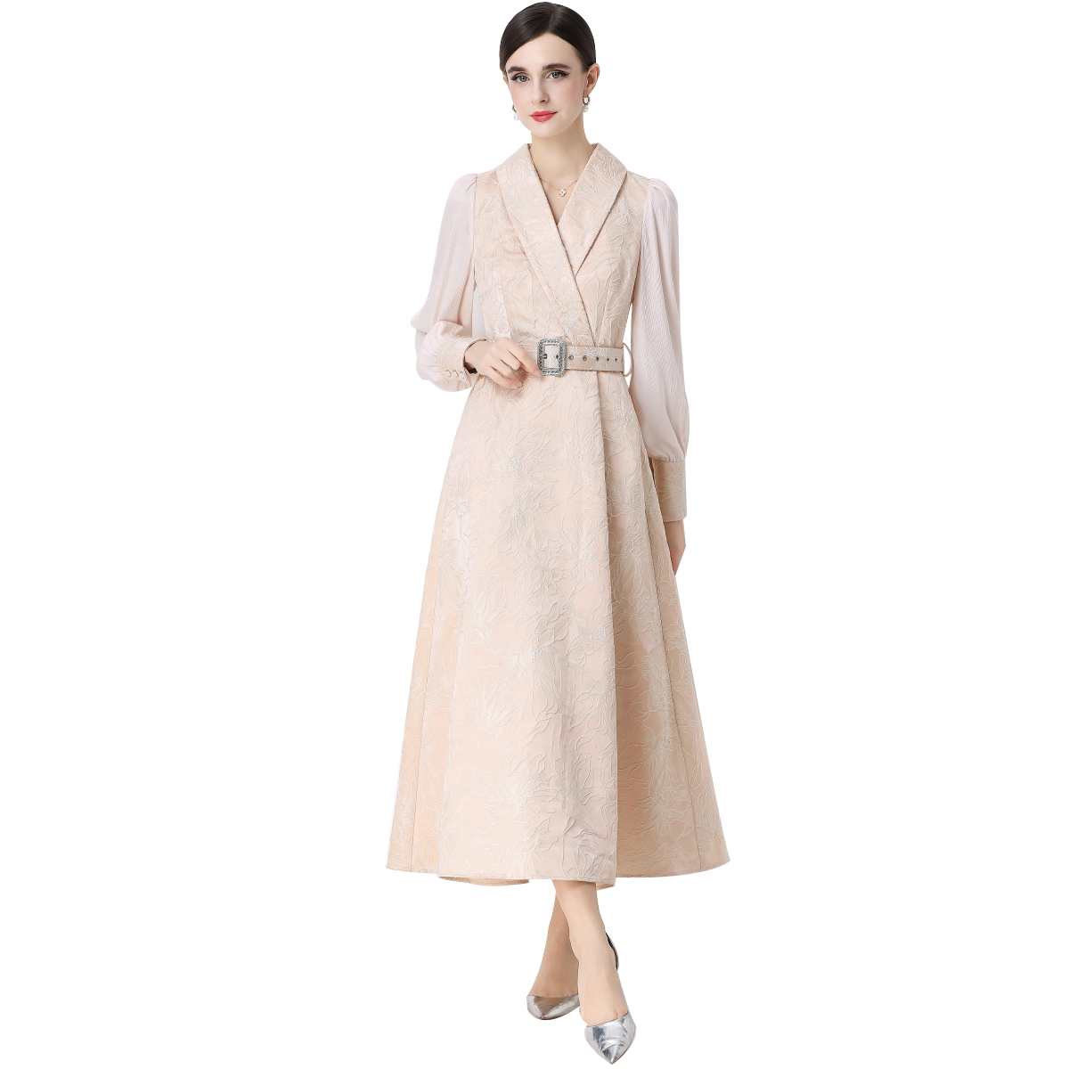 RY1767# 实拍气质优雅通勤提花灯笼袖连衣裙西装领大摆长裙送腰带