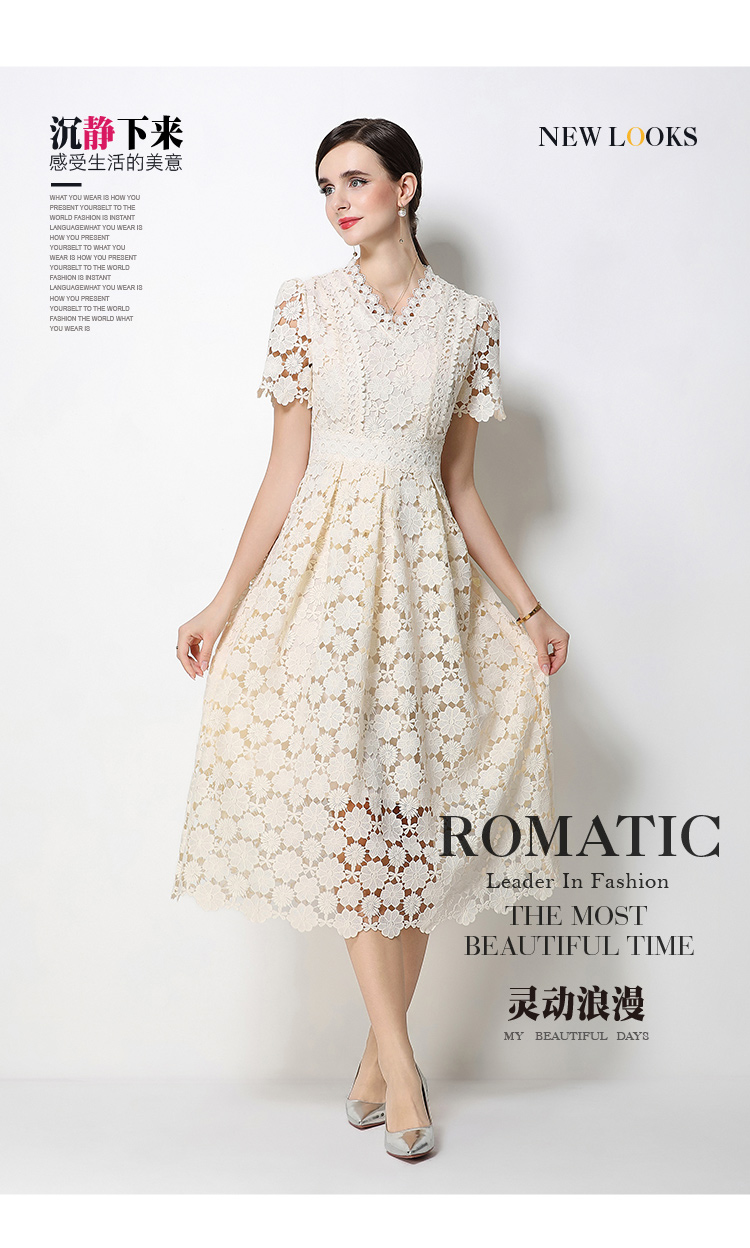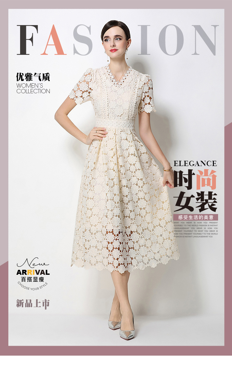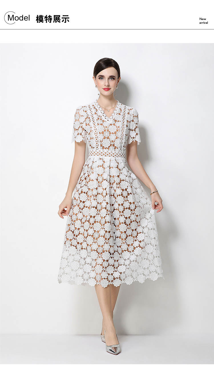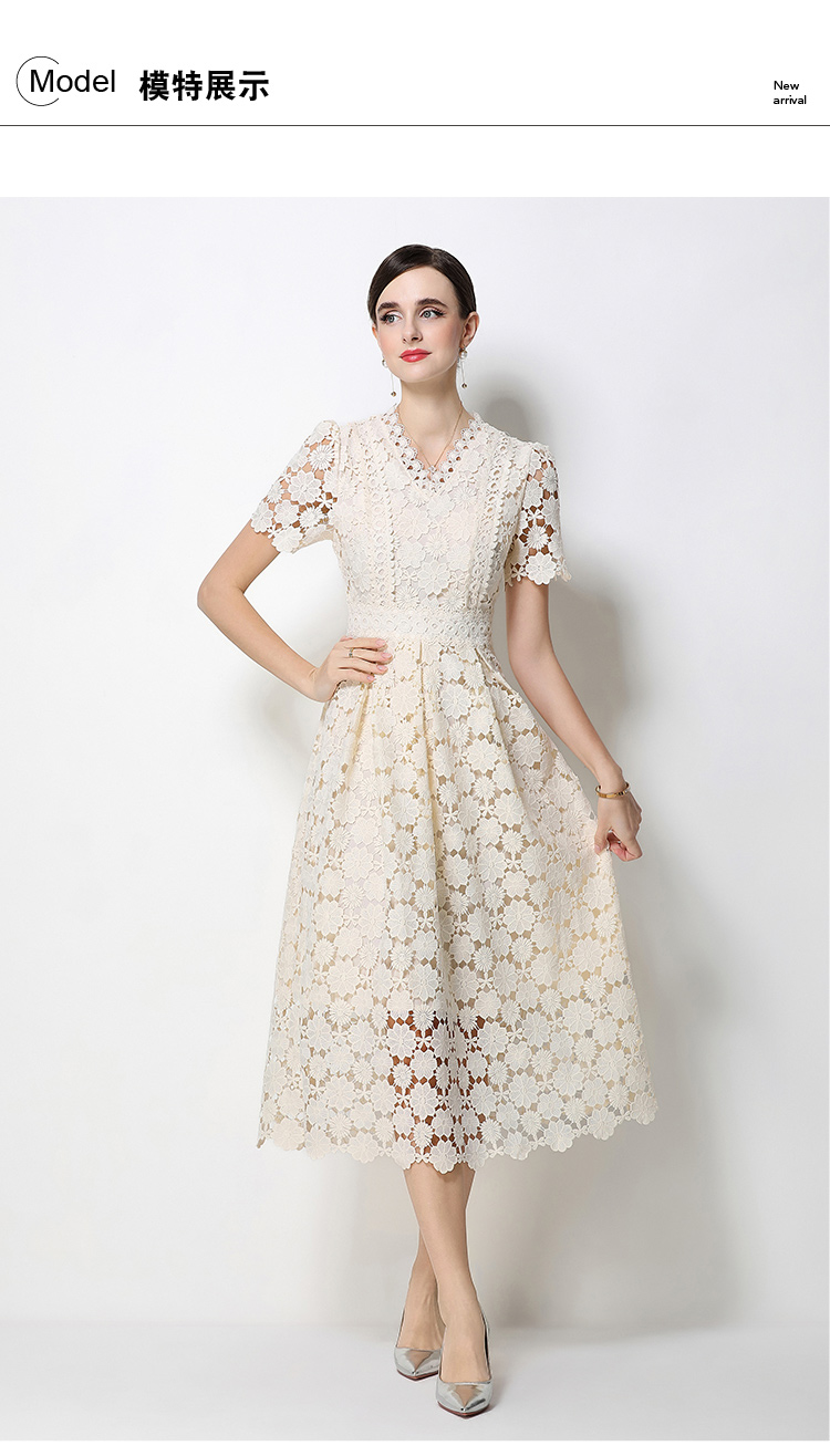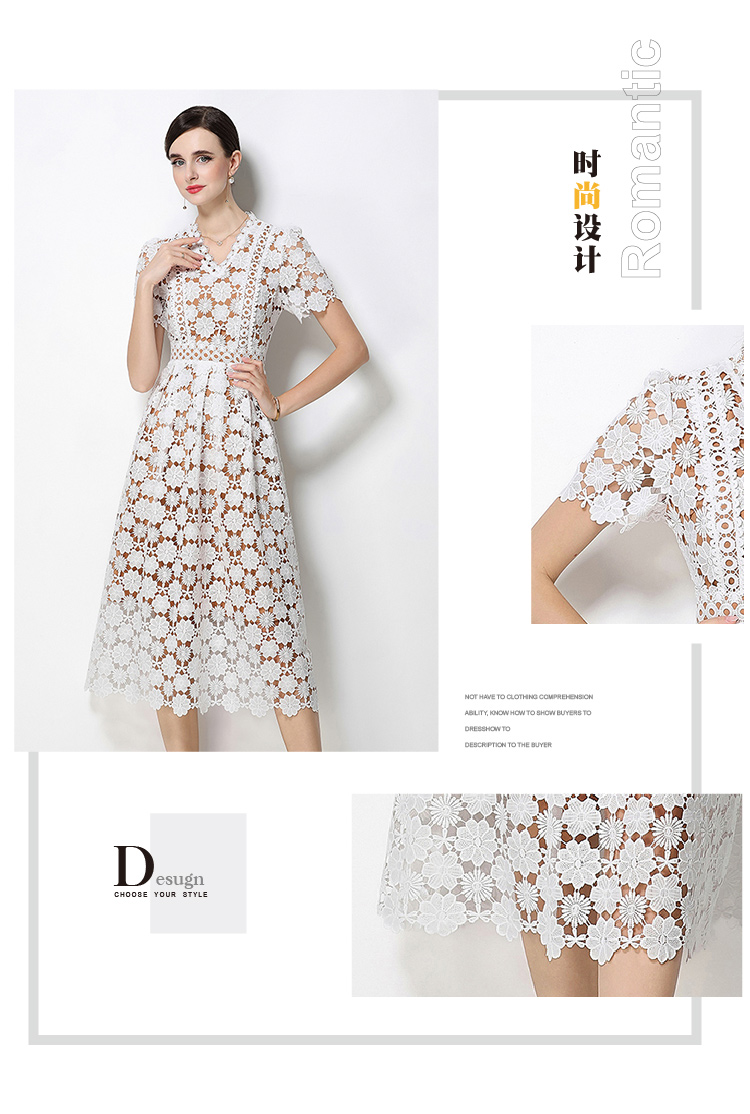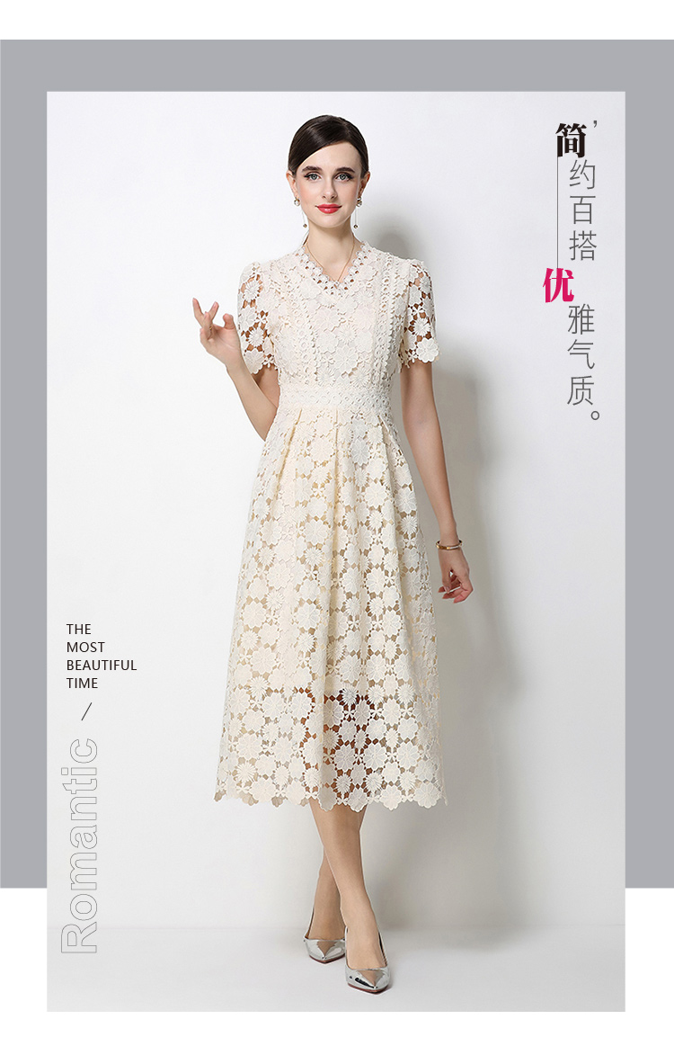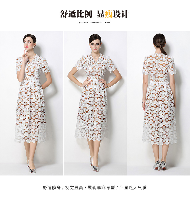 RY1772# 实拍原创V领时尚显瘦镂空水溶蕾丝定位中长款连衣裙