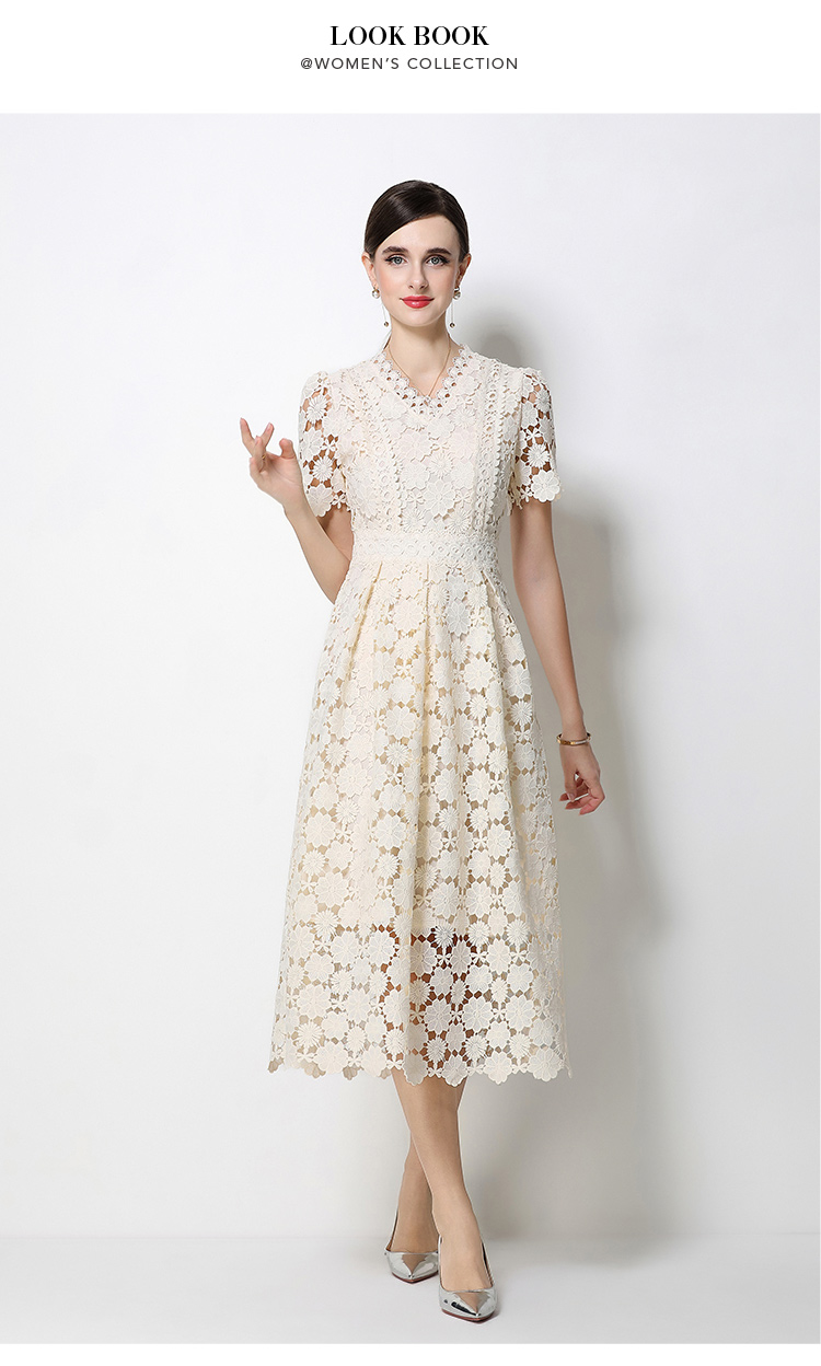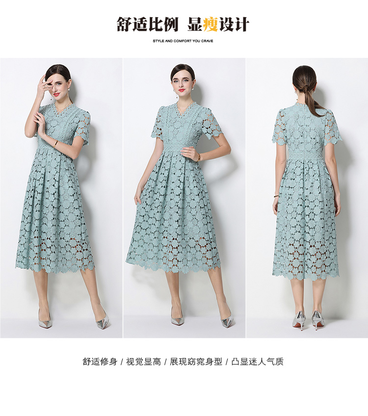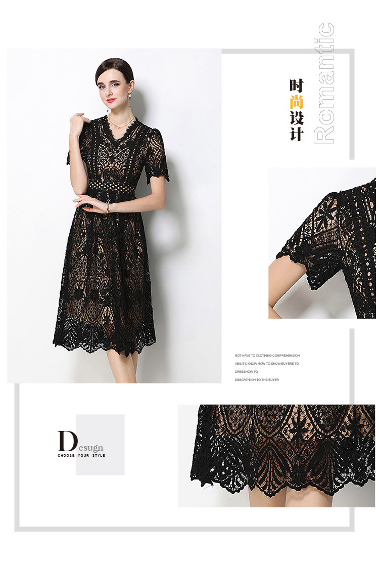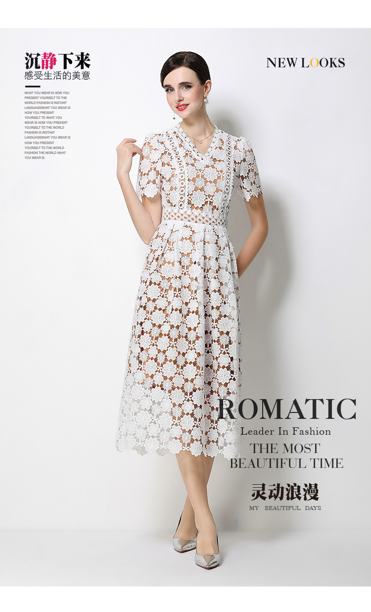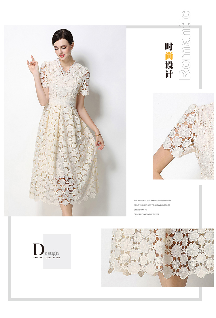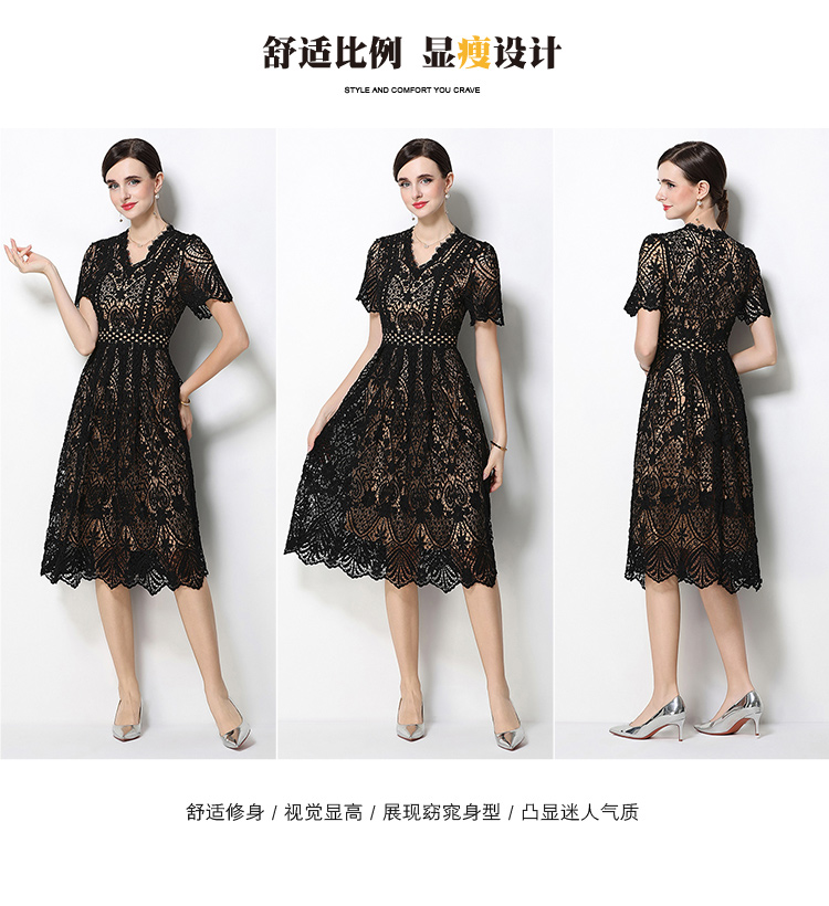 RY1772# 实拍原创V领时尚显瘦镂空水溶蕾丝定位中长款连衣裙
