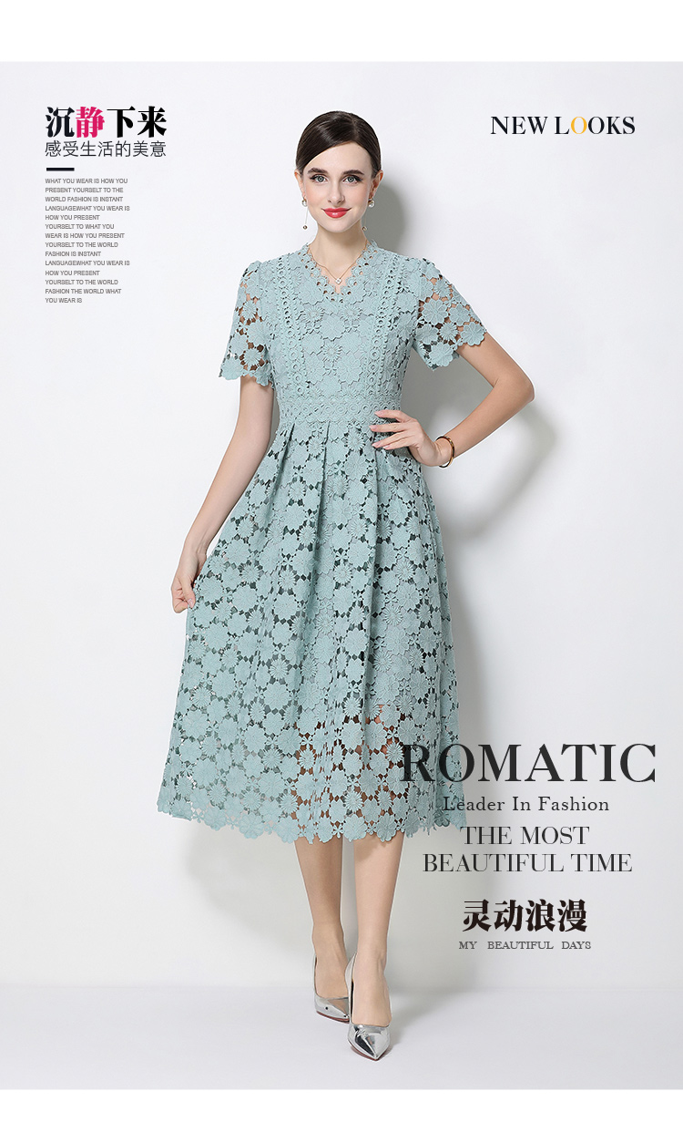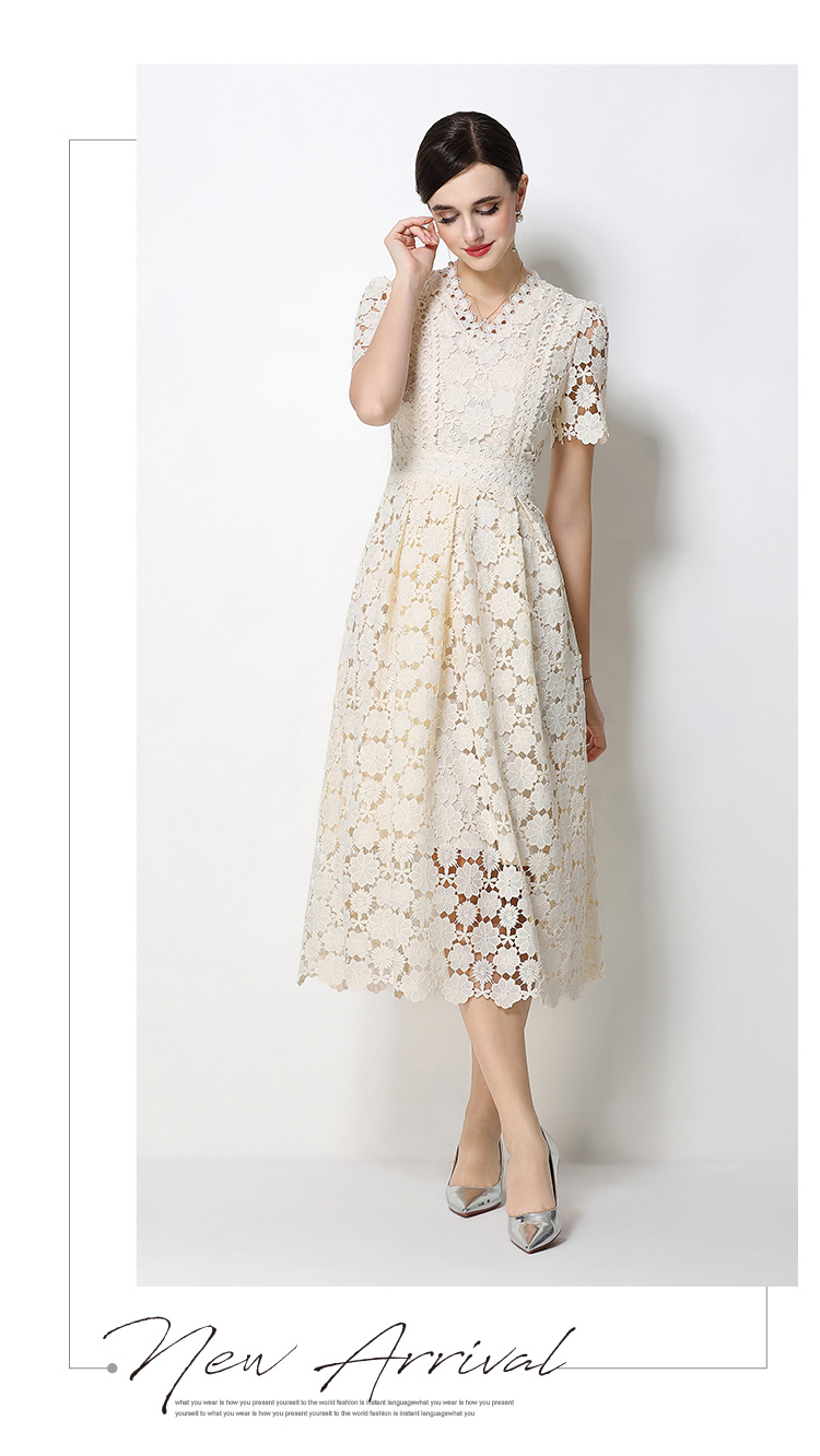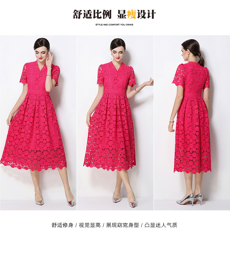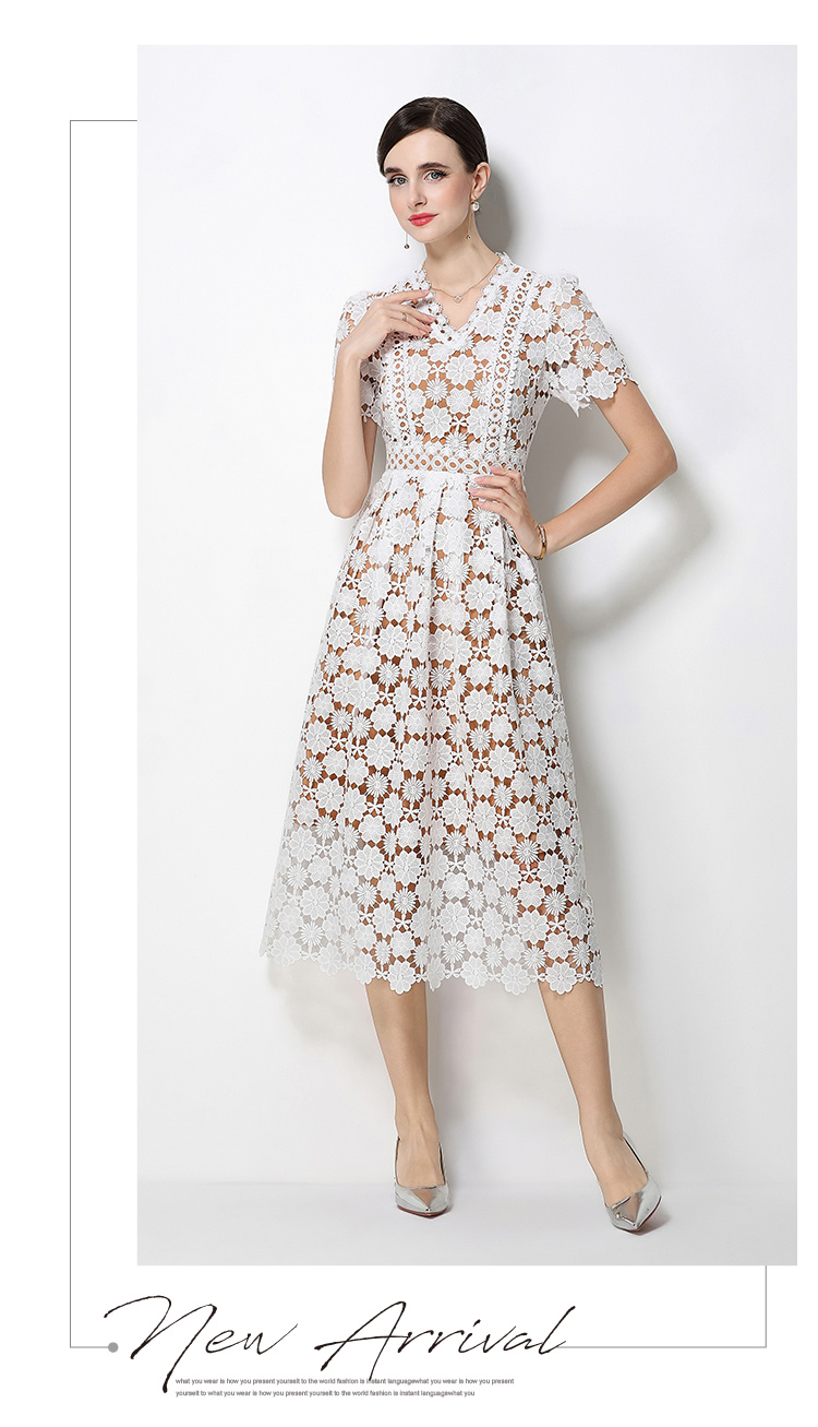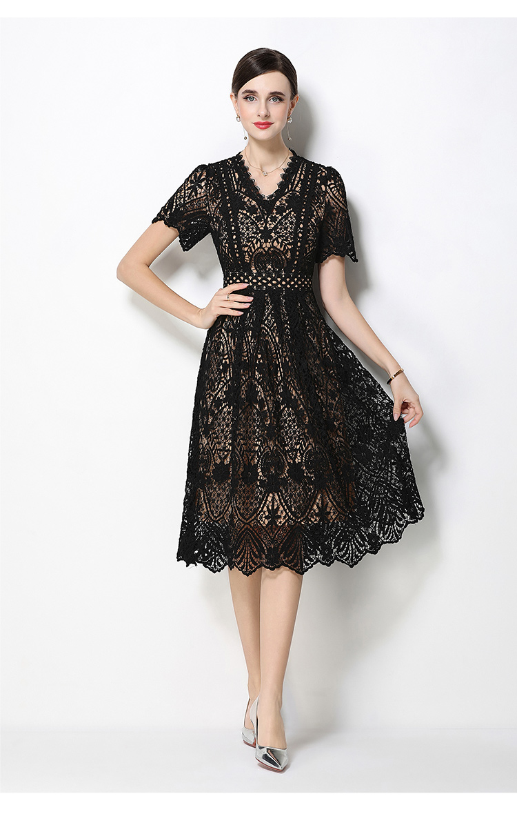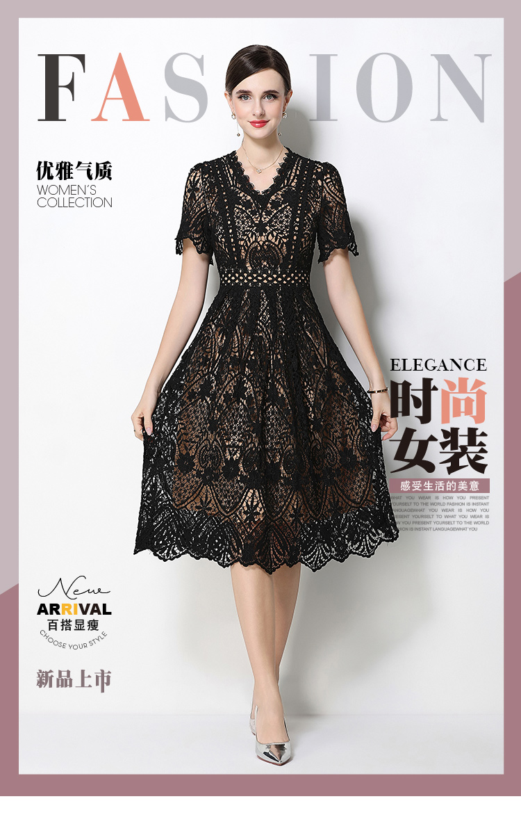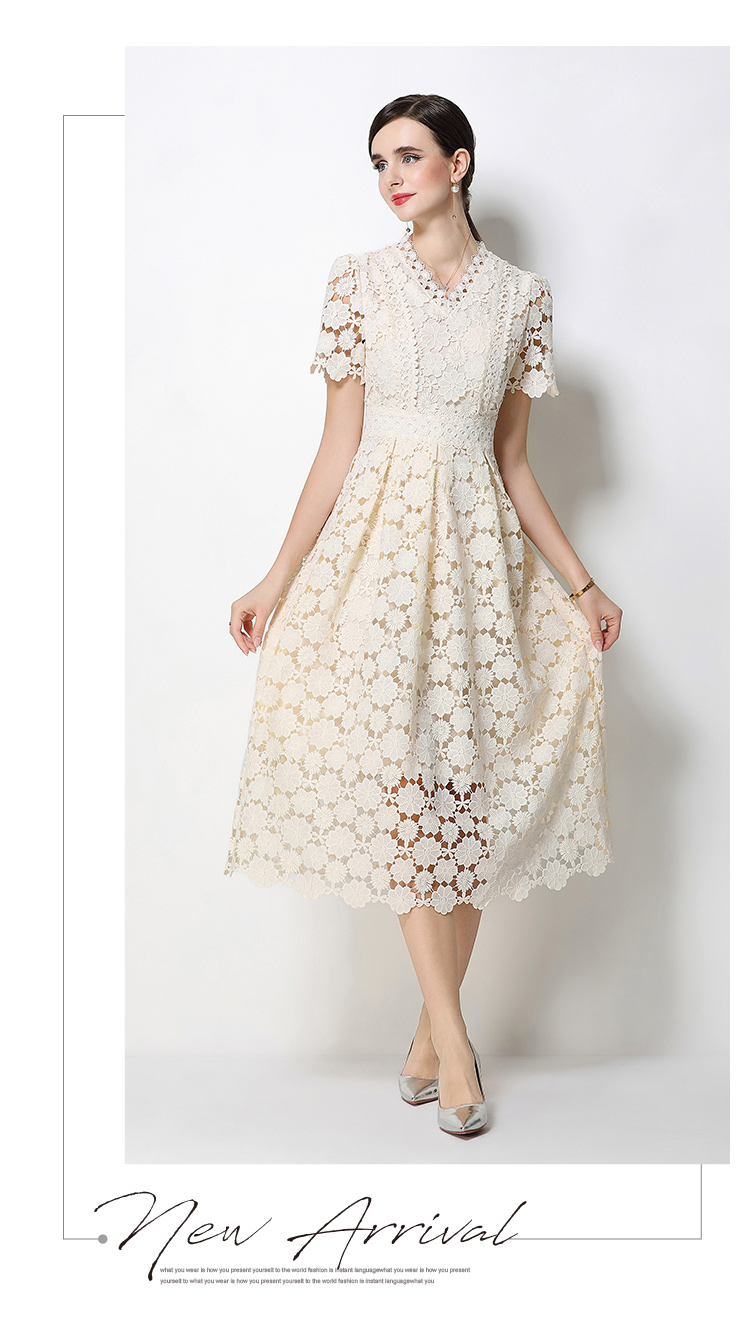 RY1772# 实拍原创V领时尚显瘦镂空水溶蕾丝定位中长款连衣裙