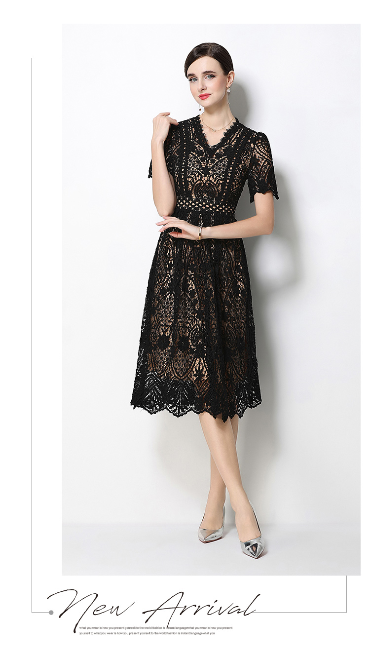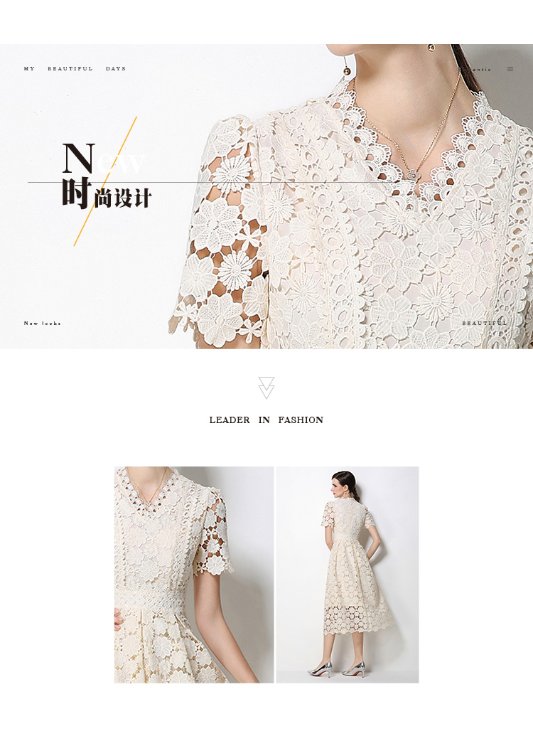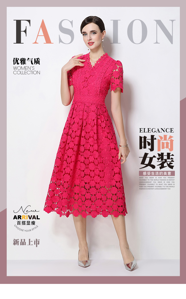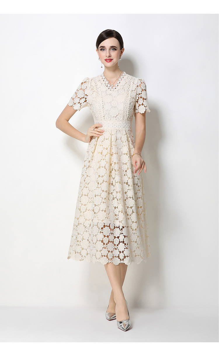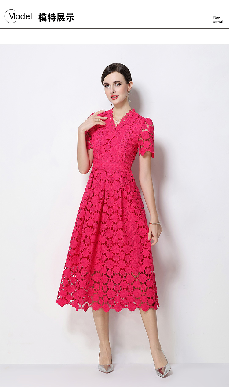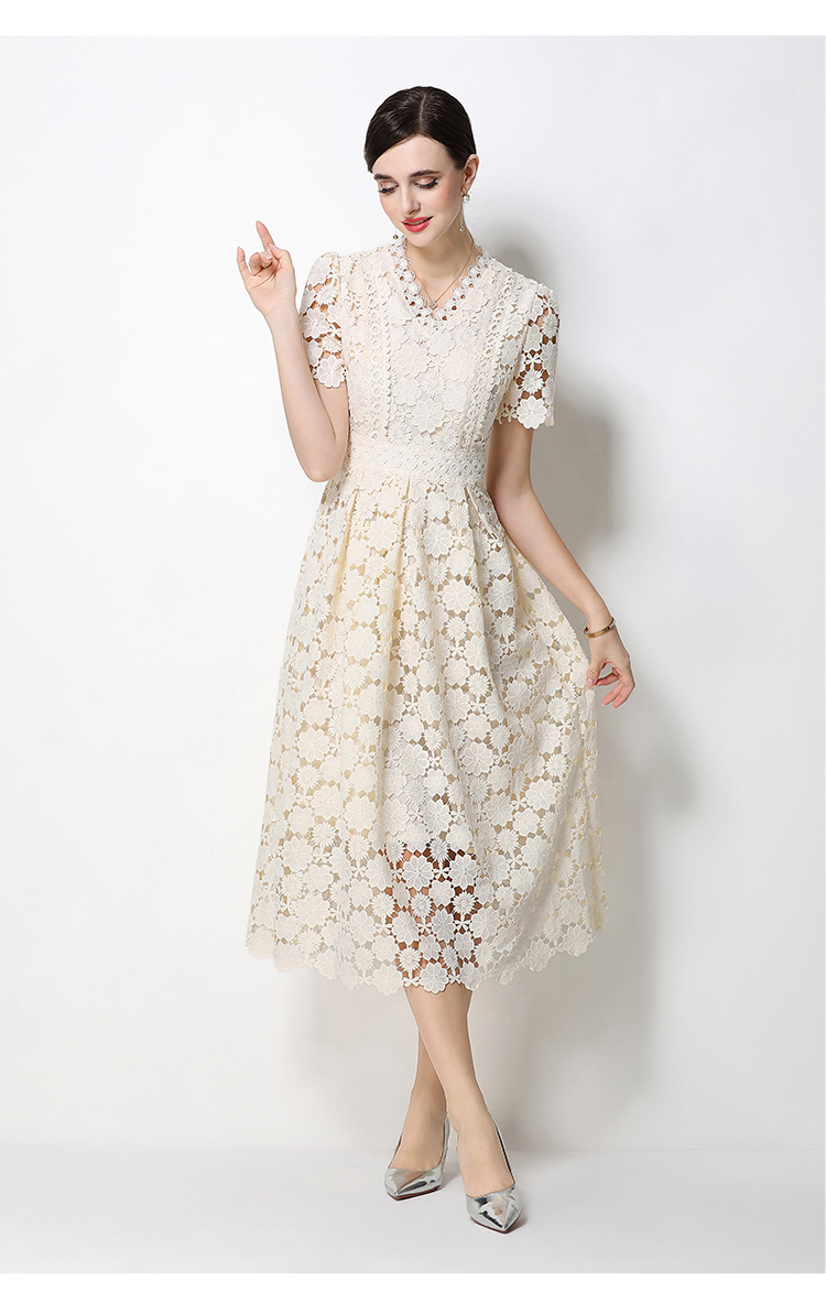 RY1772# 实拍原创V领时尚显瘦镂空水溶蕾丝定位中长款连衣裙