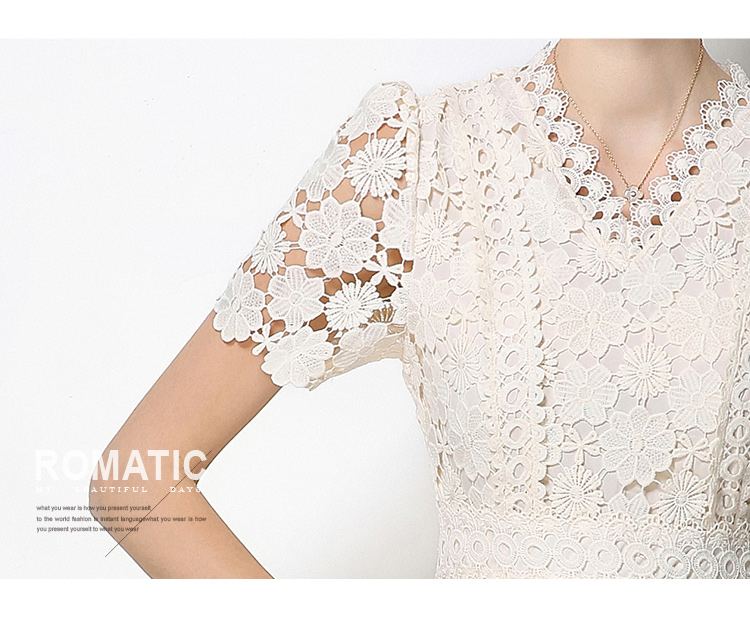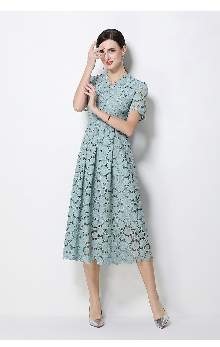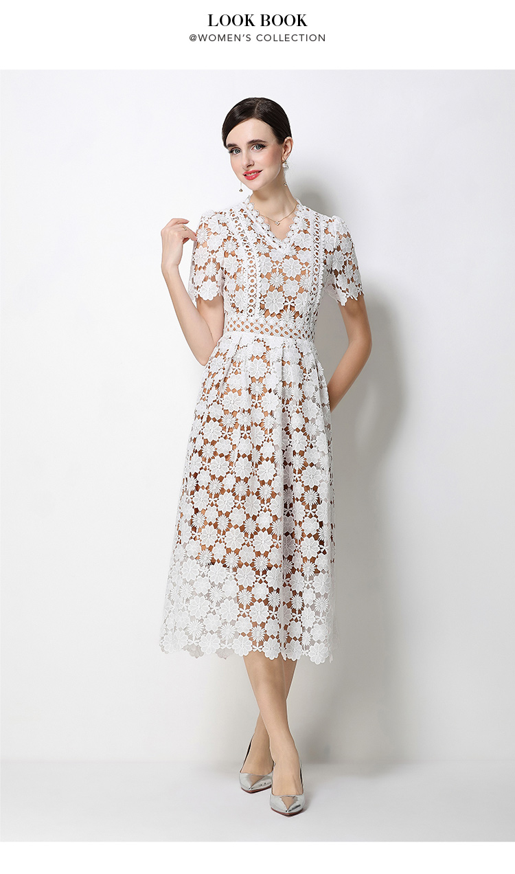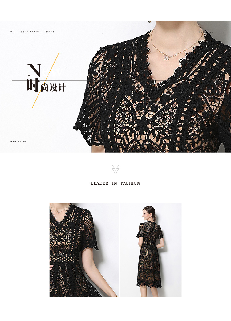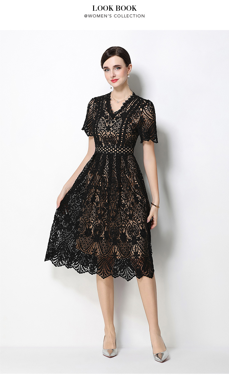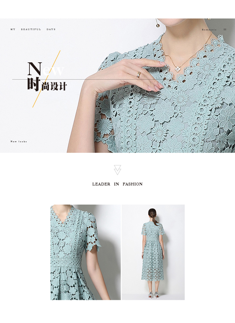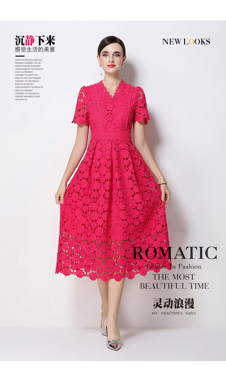 RY1772# 实拍原创V领时尚显瘦镂空水溶蕾丝定位中长款连衣裙