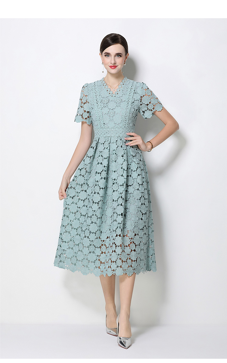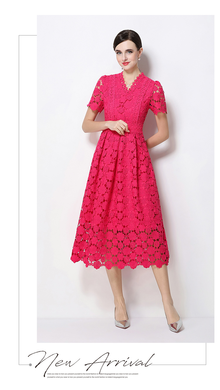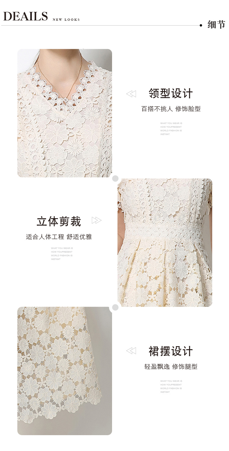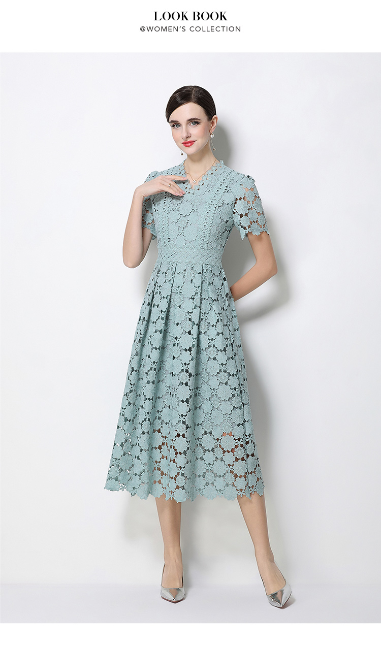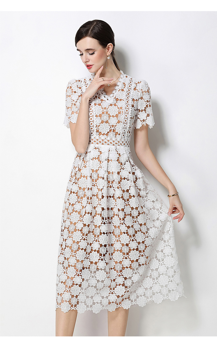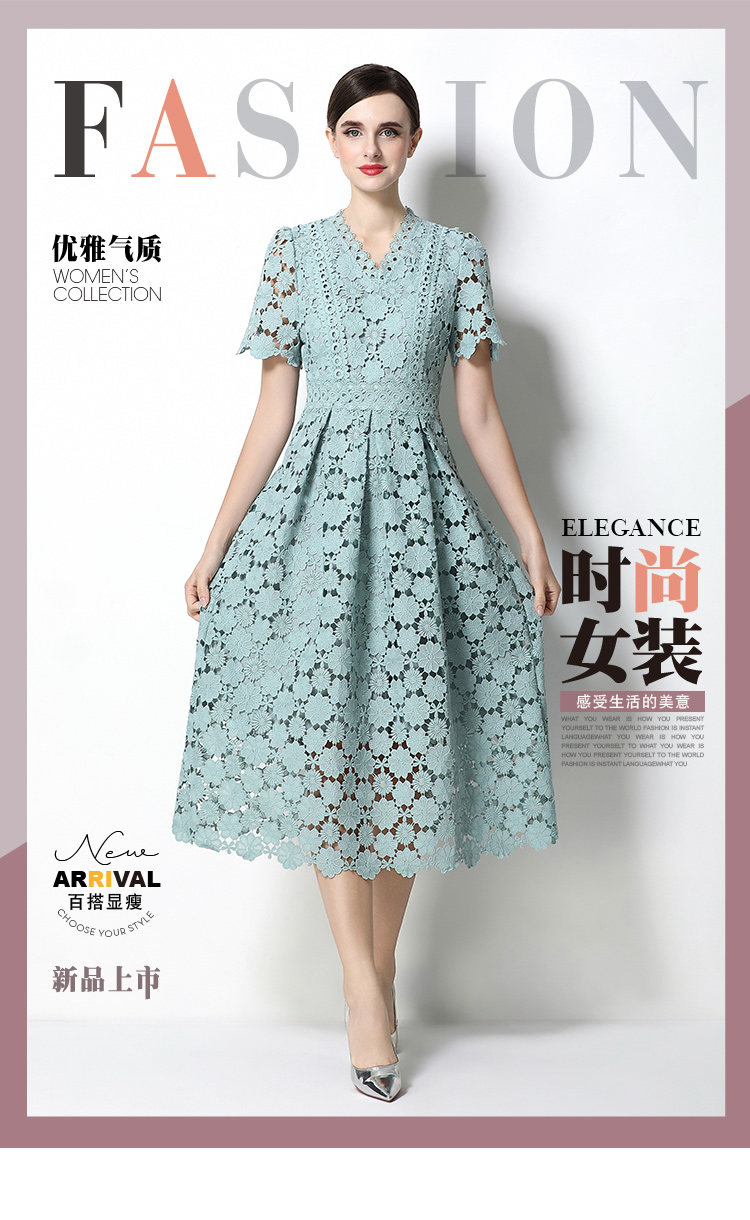 RY1772# 实拍原创V领时尚显瘦镂空水溶蕾丝定位中长款连衣裙