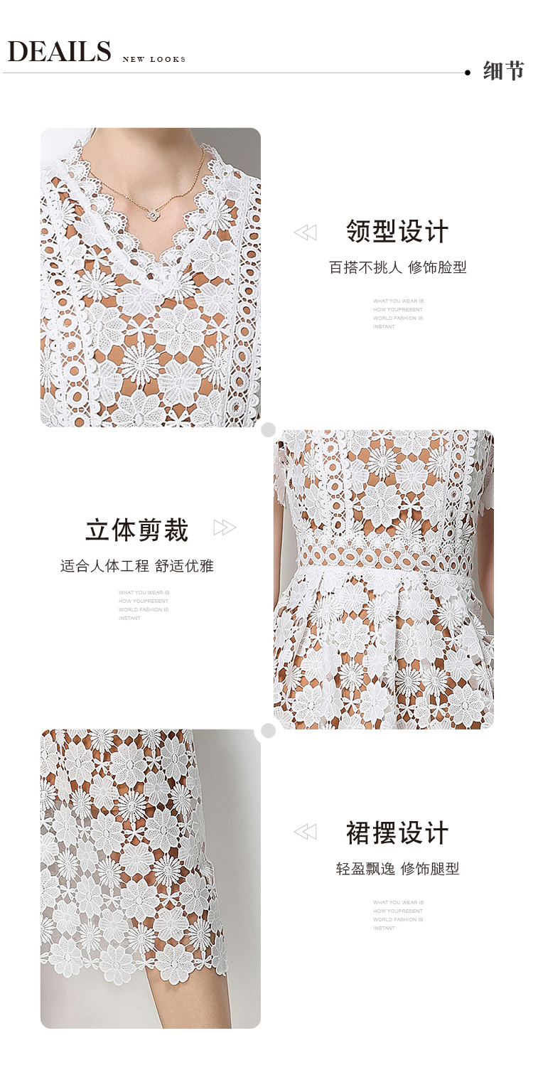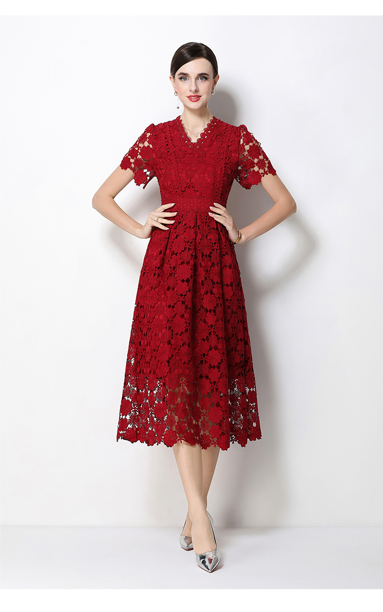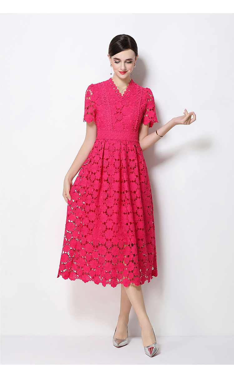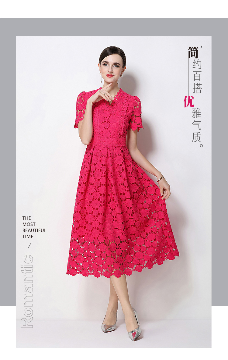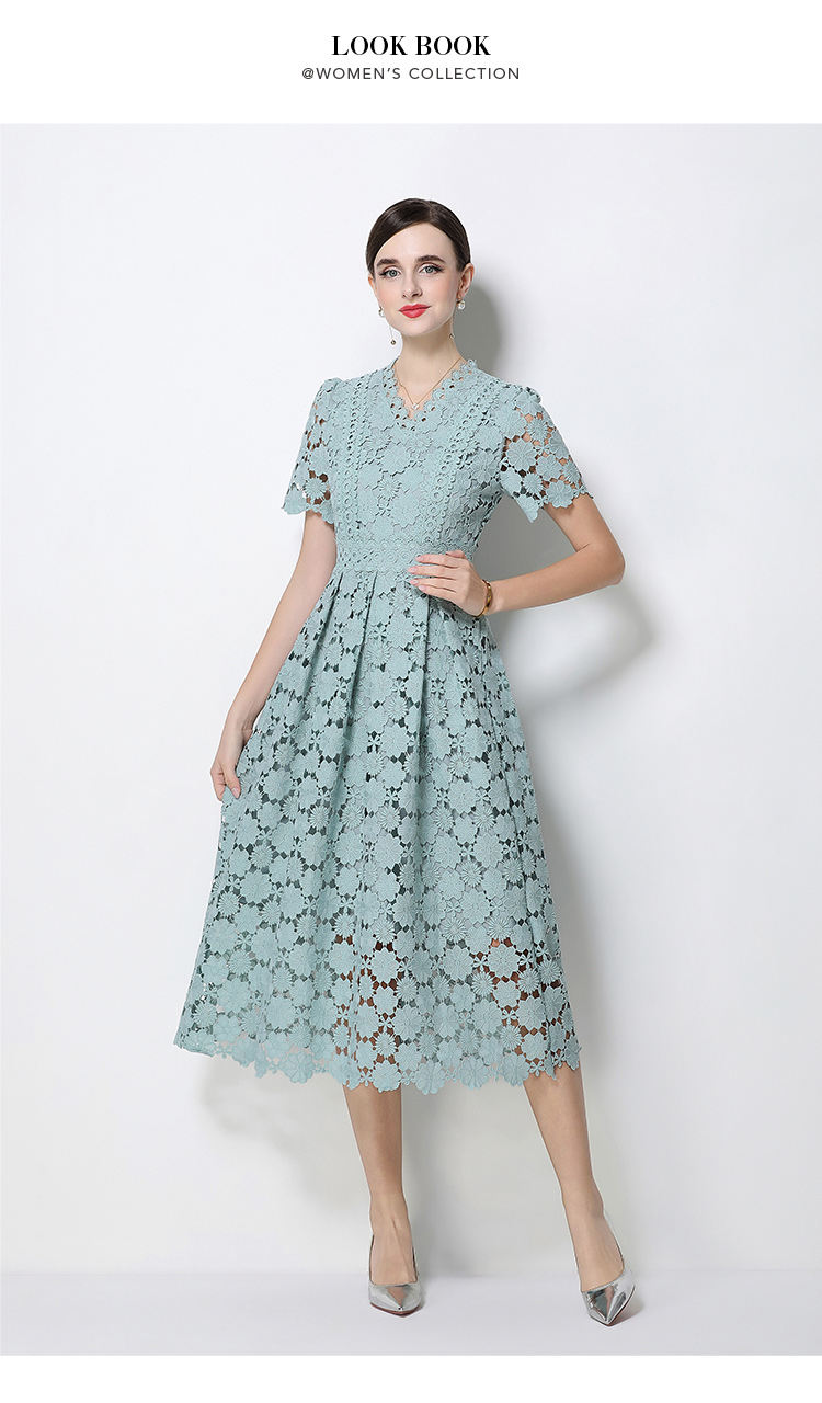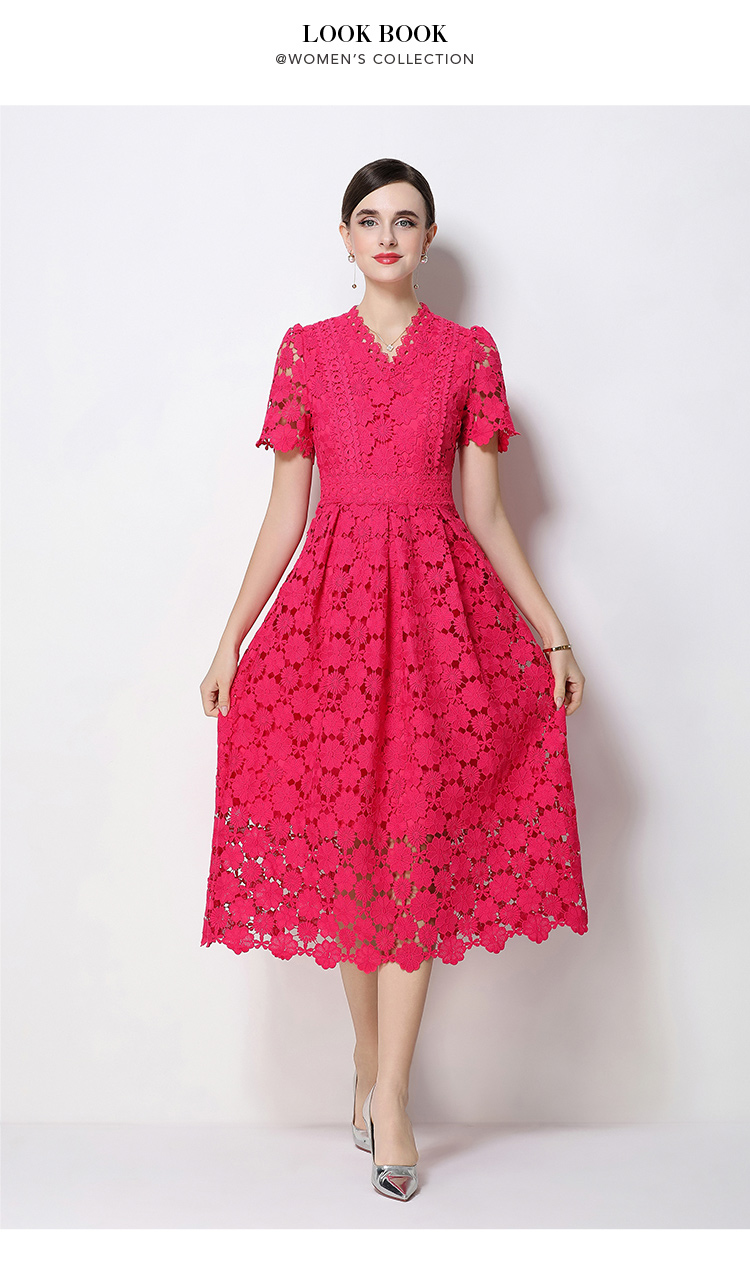 RY1772# 实拍原创V领时尚显瘦镂空水溶蕾丝定位中长款连衣裙