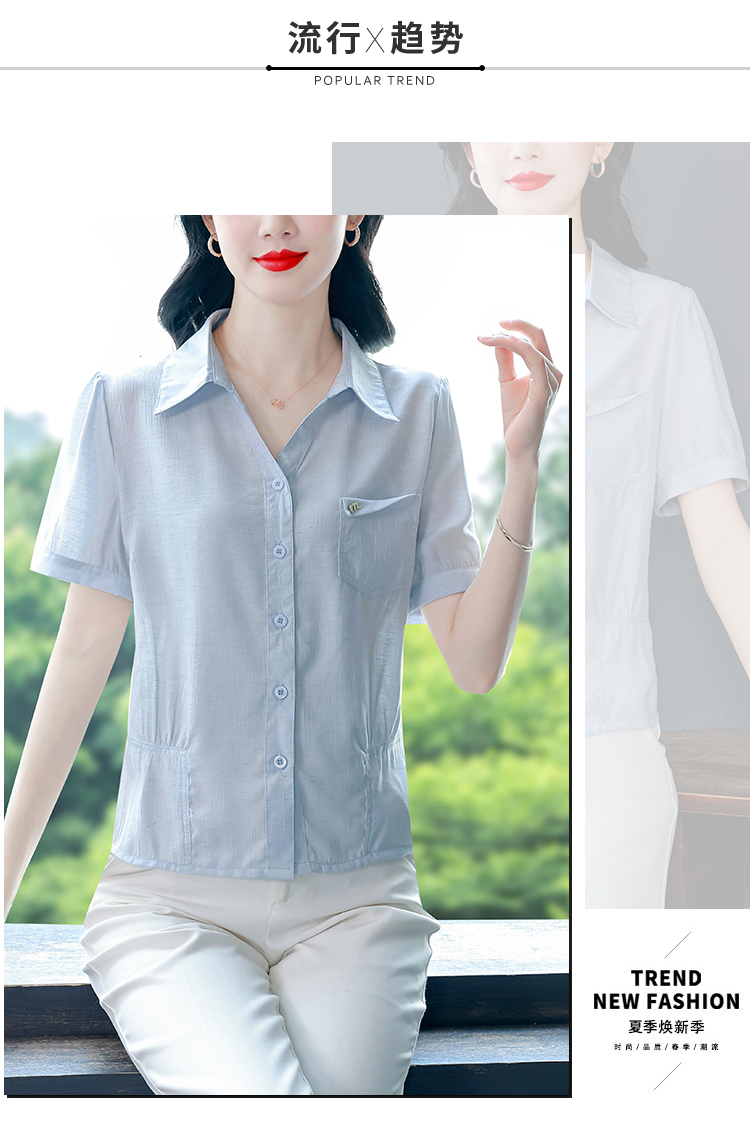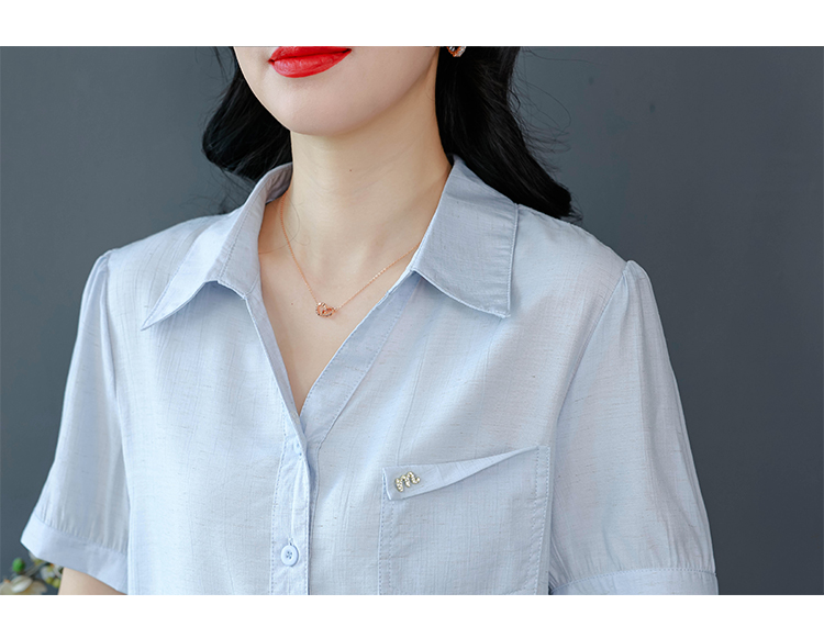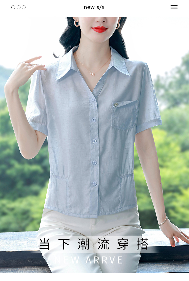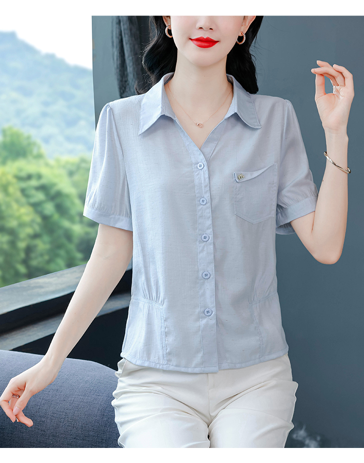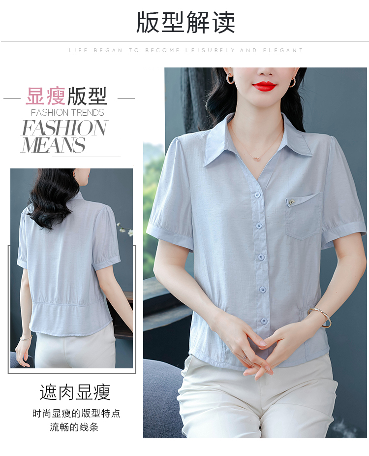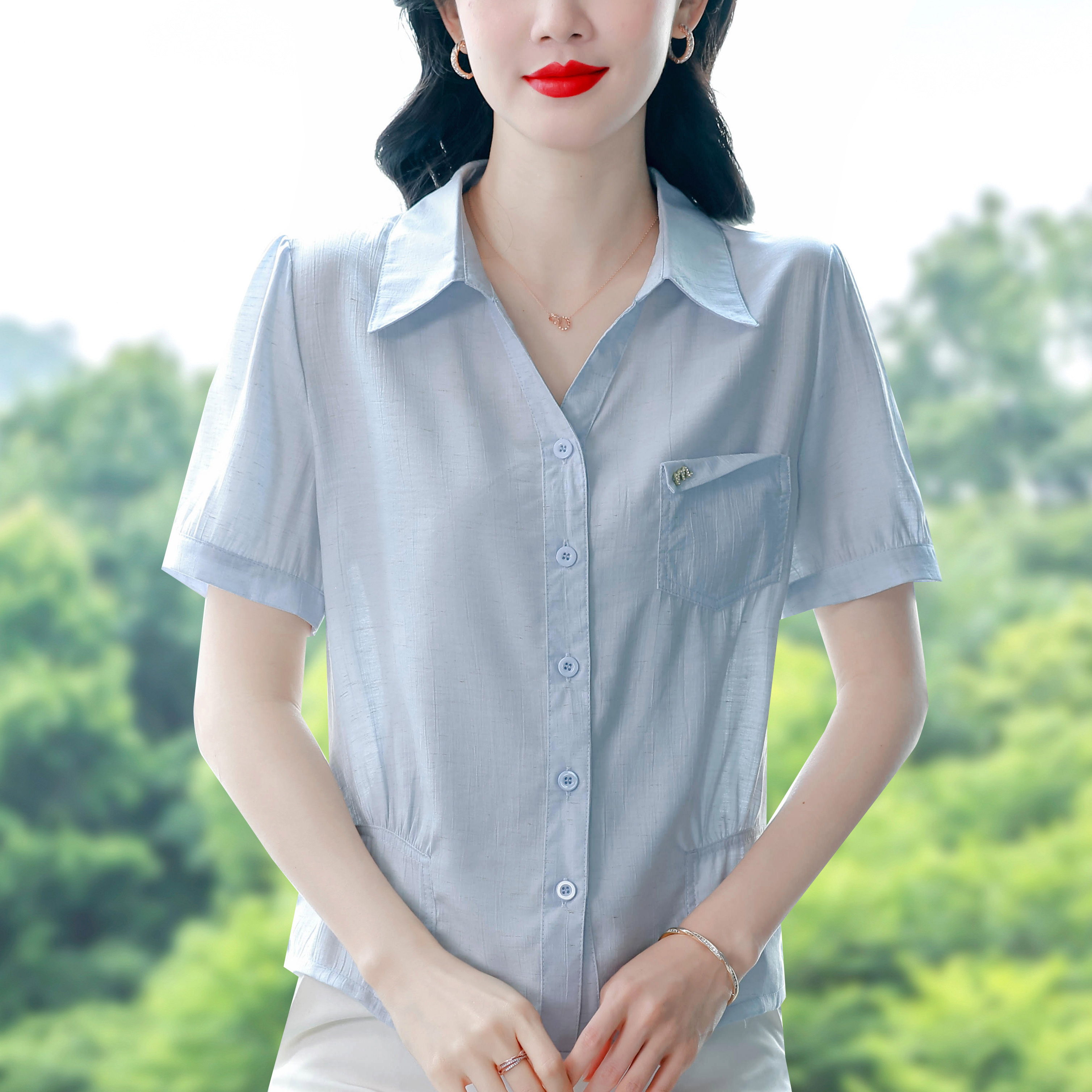 RY1807# 2026夏季新款洋气减龄纯色V领短袖衬衫女收腰显瘦气质百搭上衣