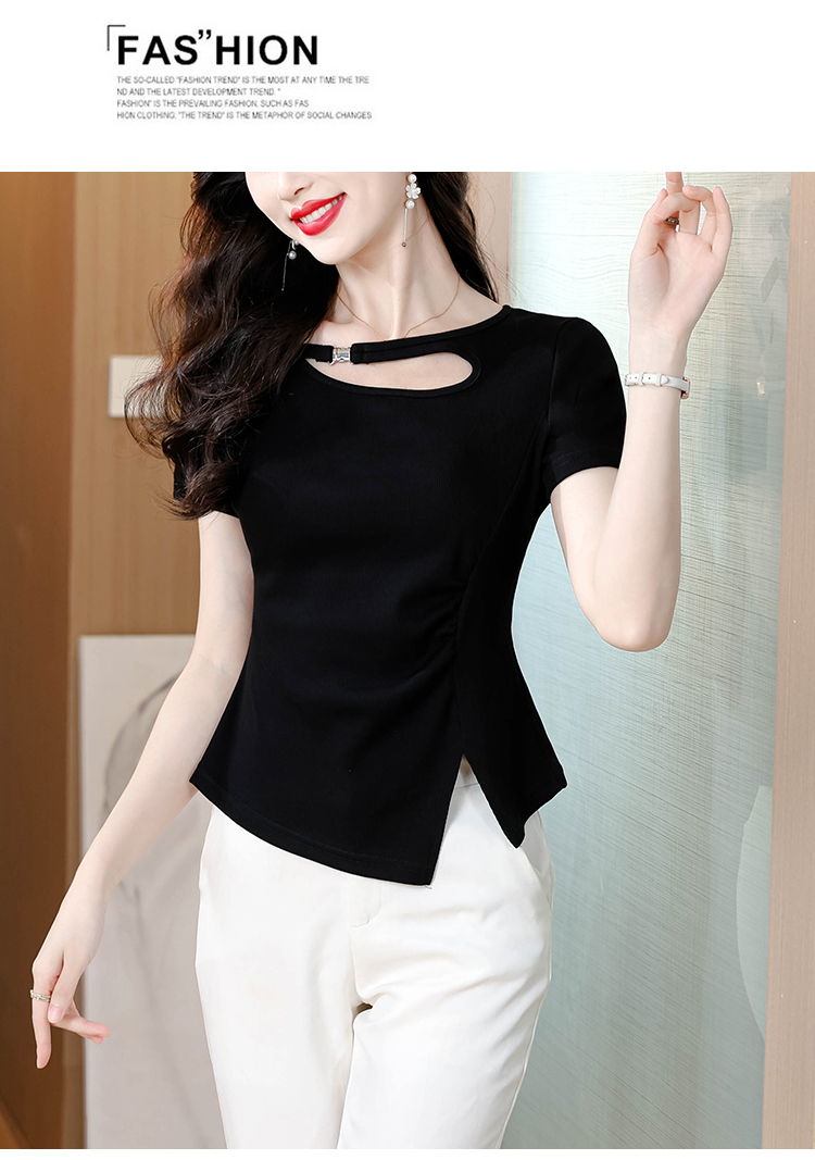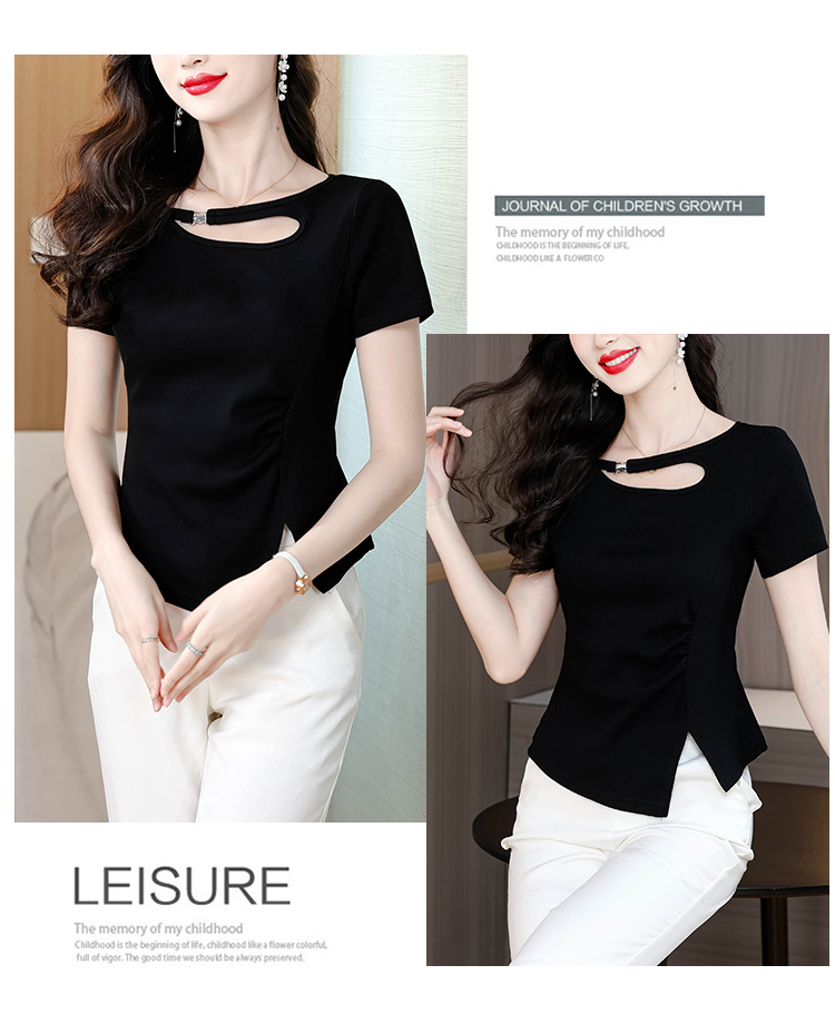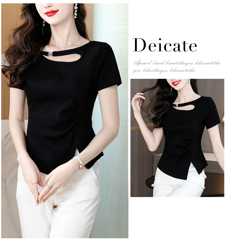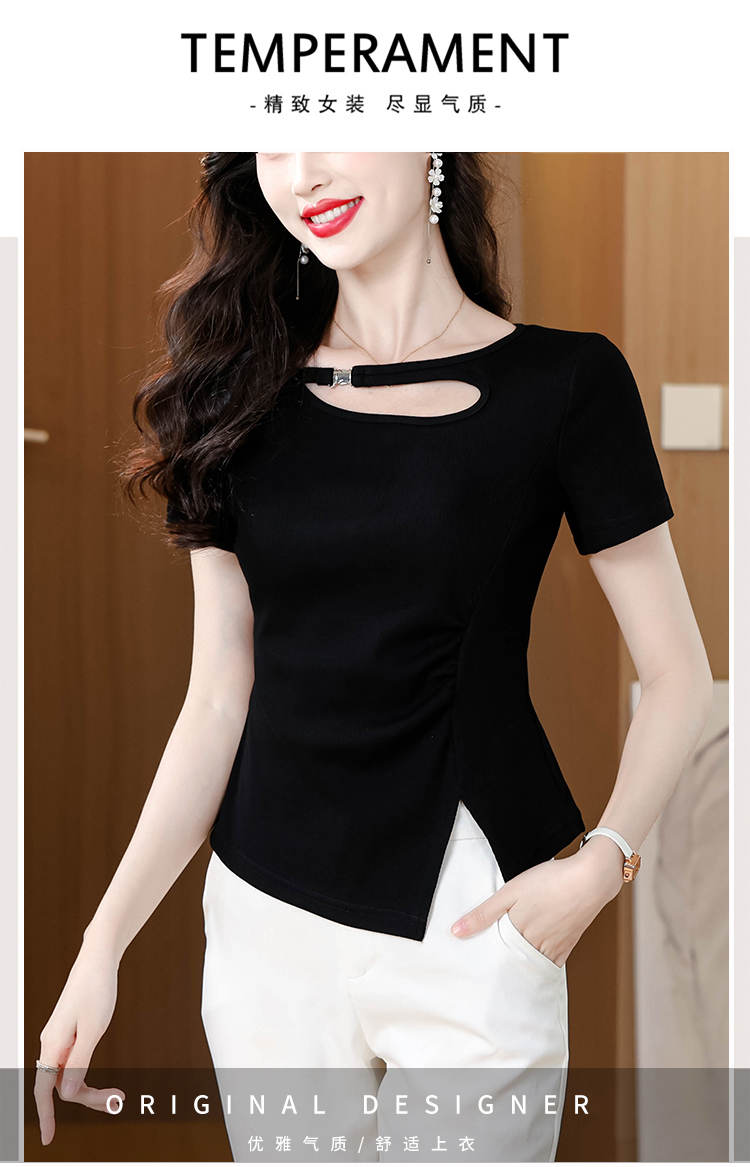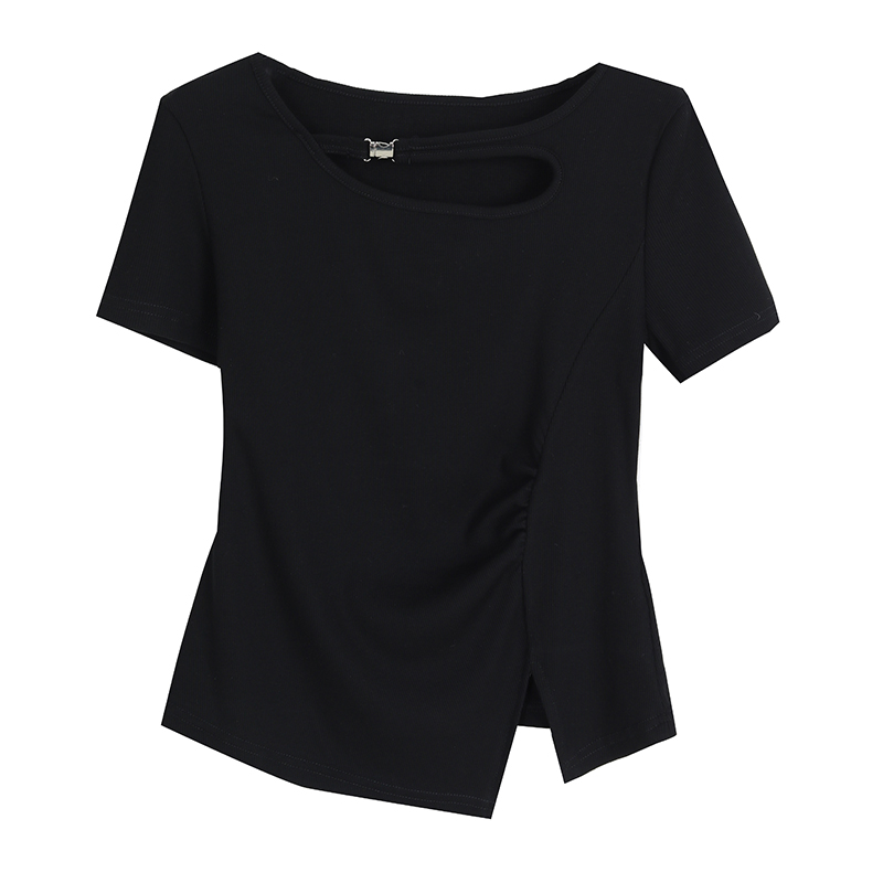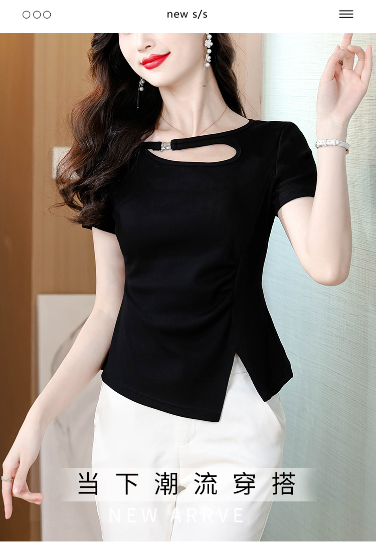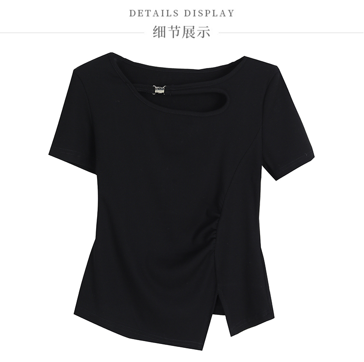 RY1808# 2026夏季新款圆领镂空短袖T恤女不规则开叉收腰显瘦百搭洋气上衣