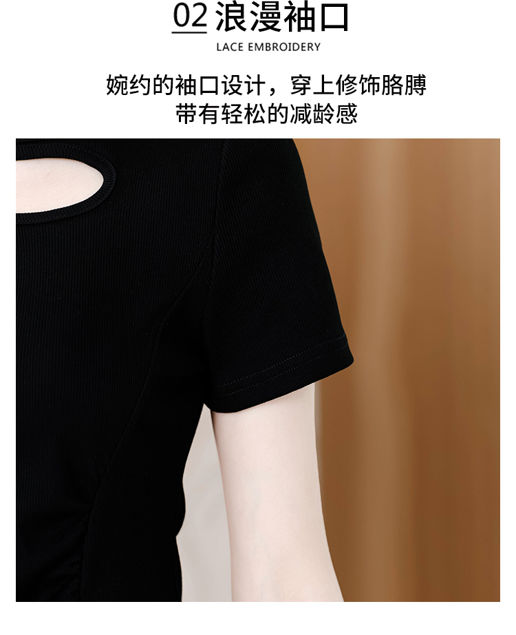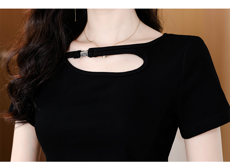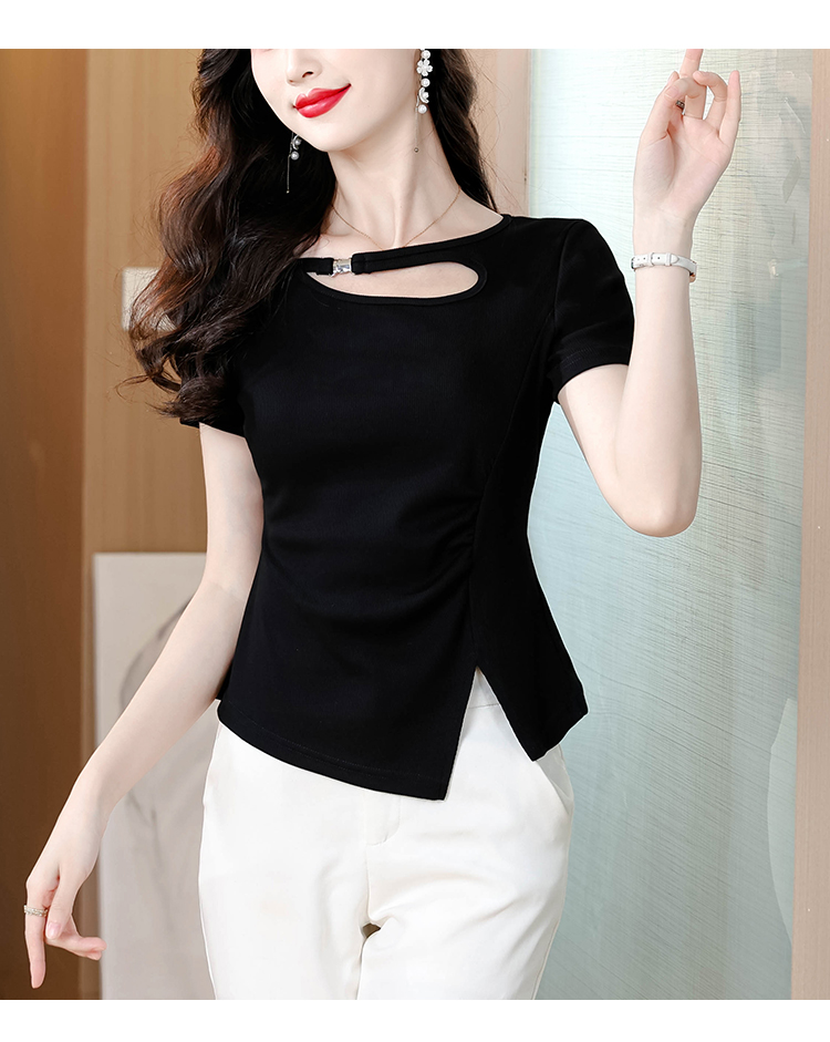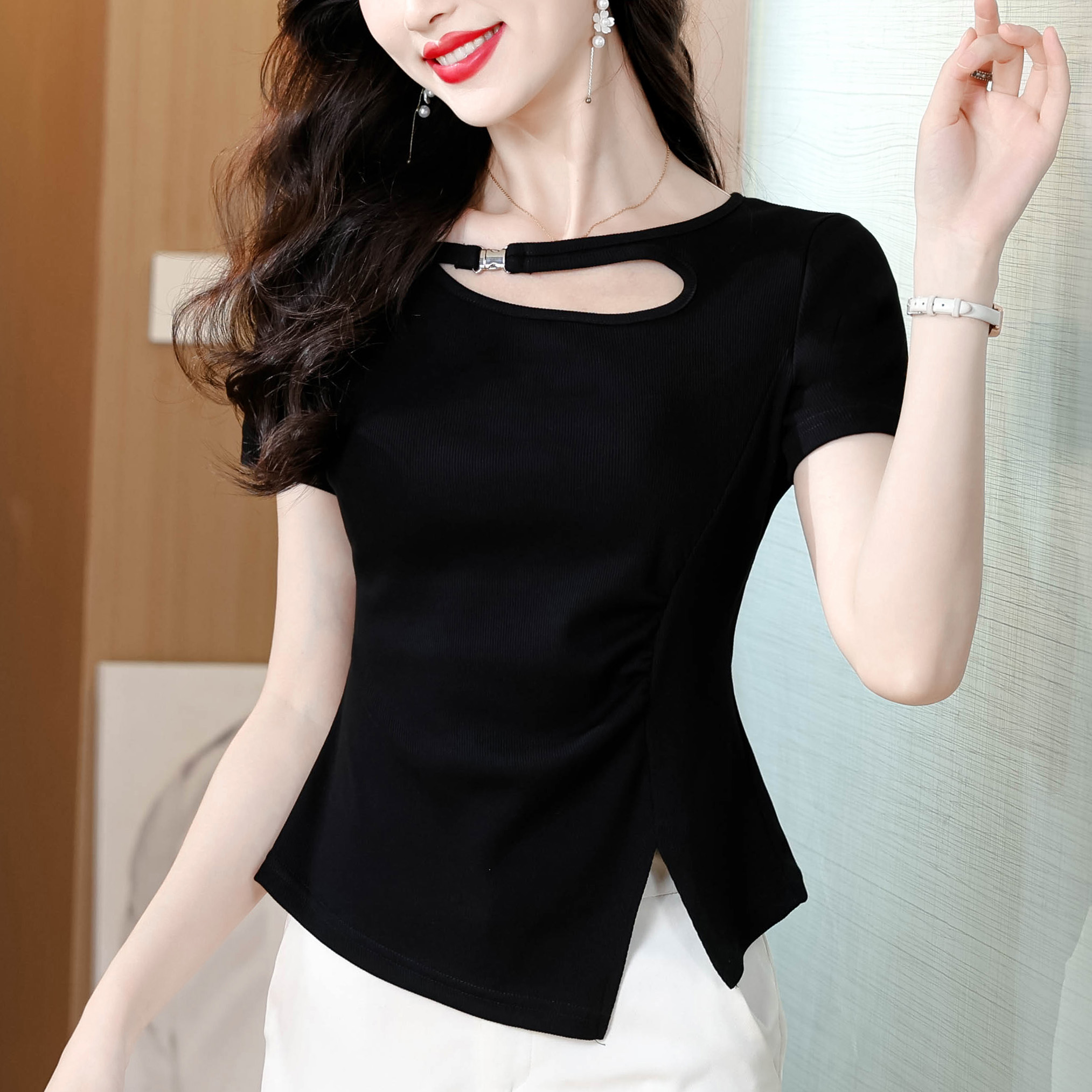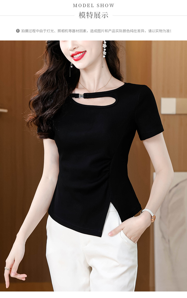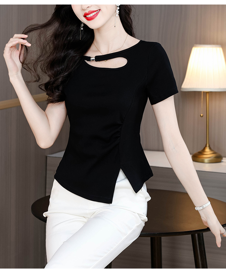 RY1808# 2026夏季新款圆领镂空短袖T恤女不规则开叉收腰显瘦百搭洋气上衣