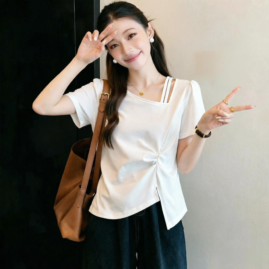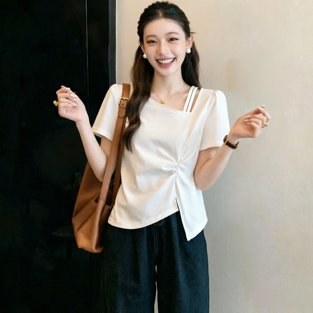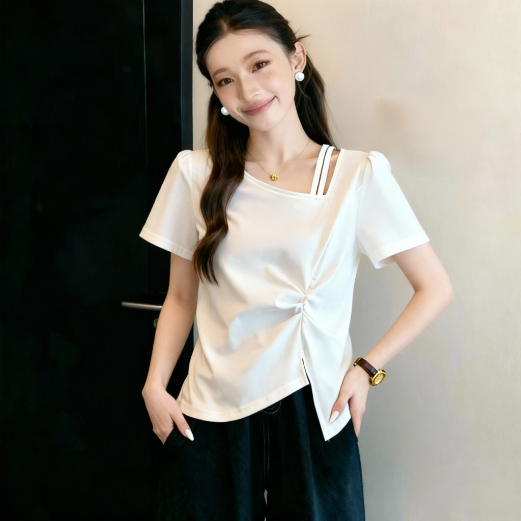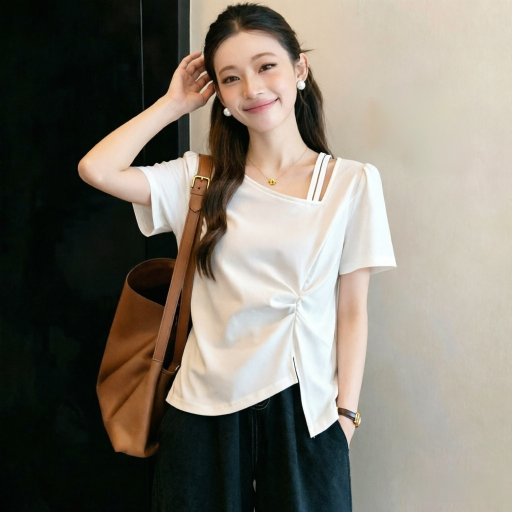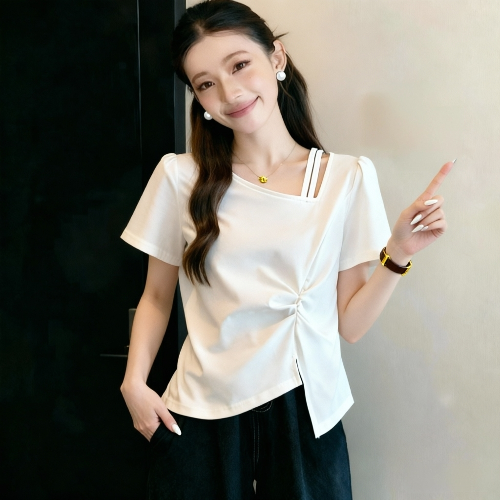 RY1814# 2026夏季新款不规则褶皱设计收腰遮肚独特白色短袖T恤上衣女