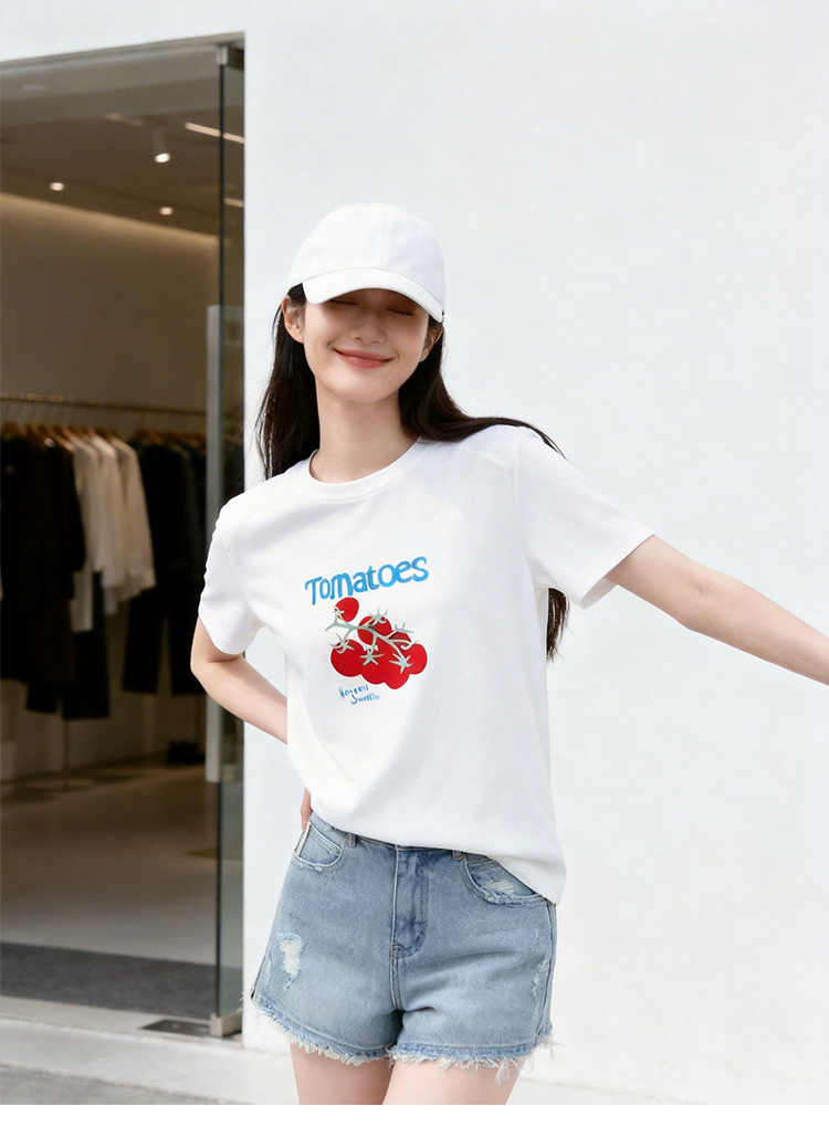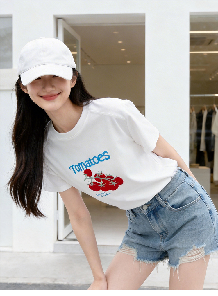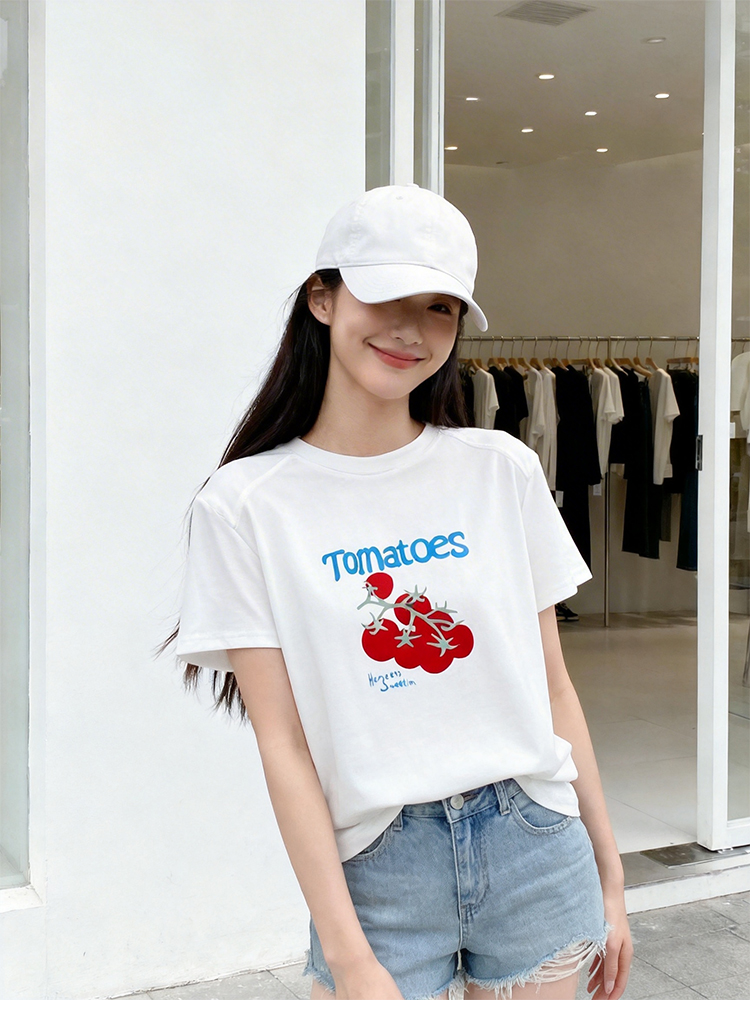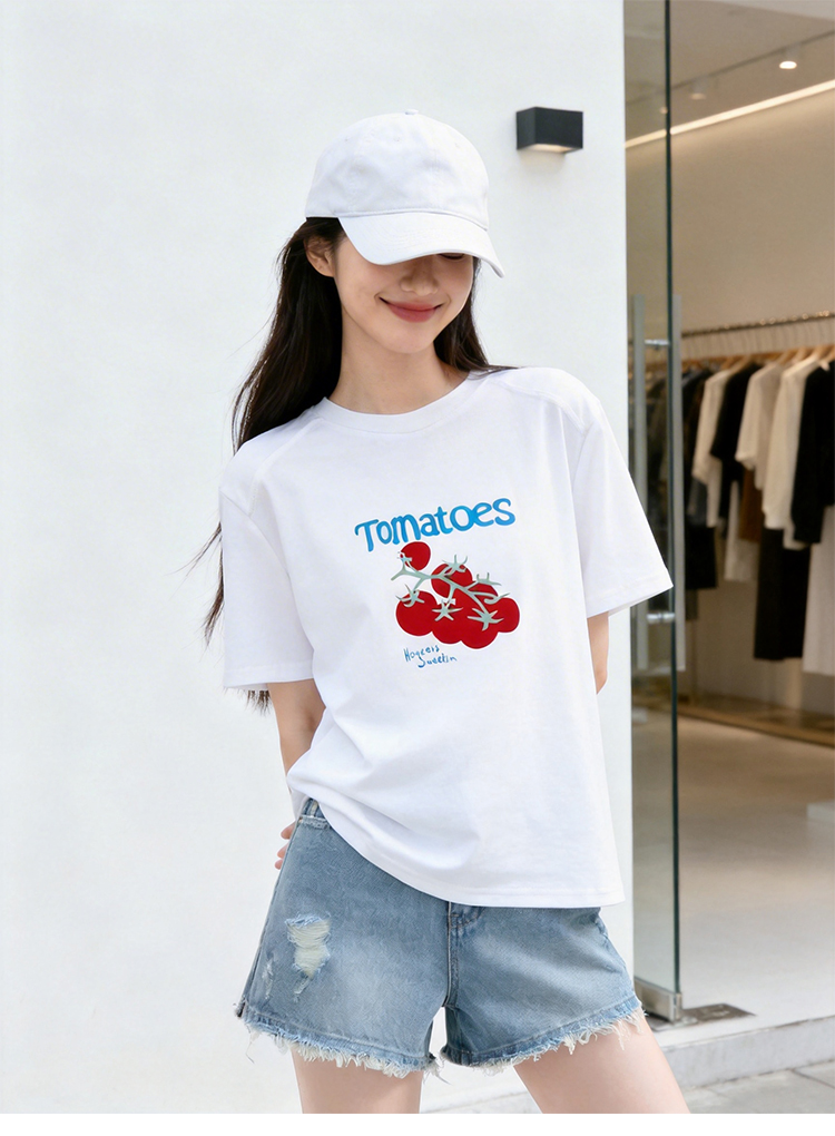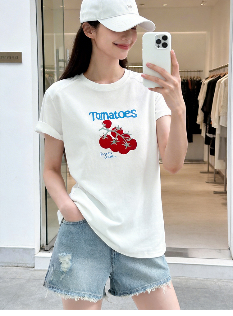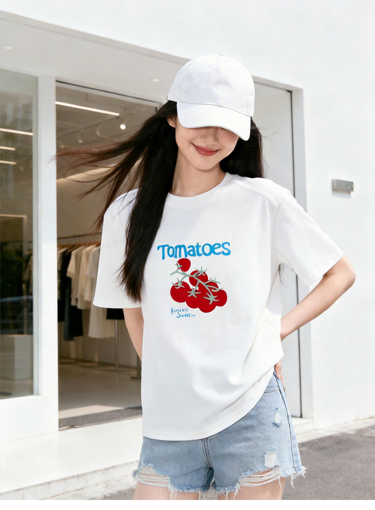 RY1824# 2026年植绒番茄印花白色T恤女夏 多巴胺撞色软糯亲肤宽松短袖上衣