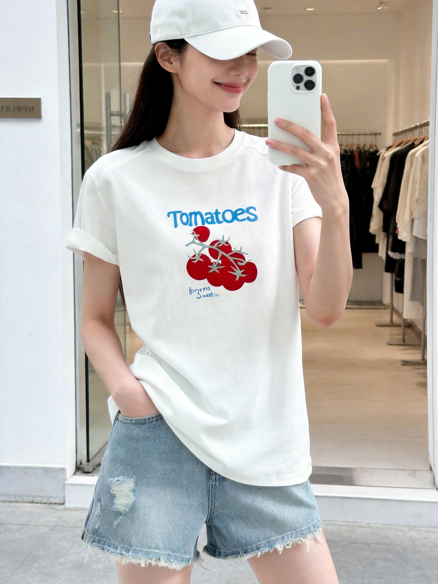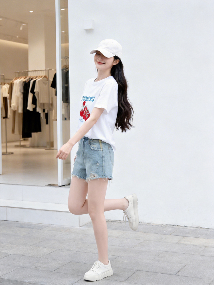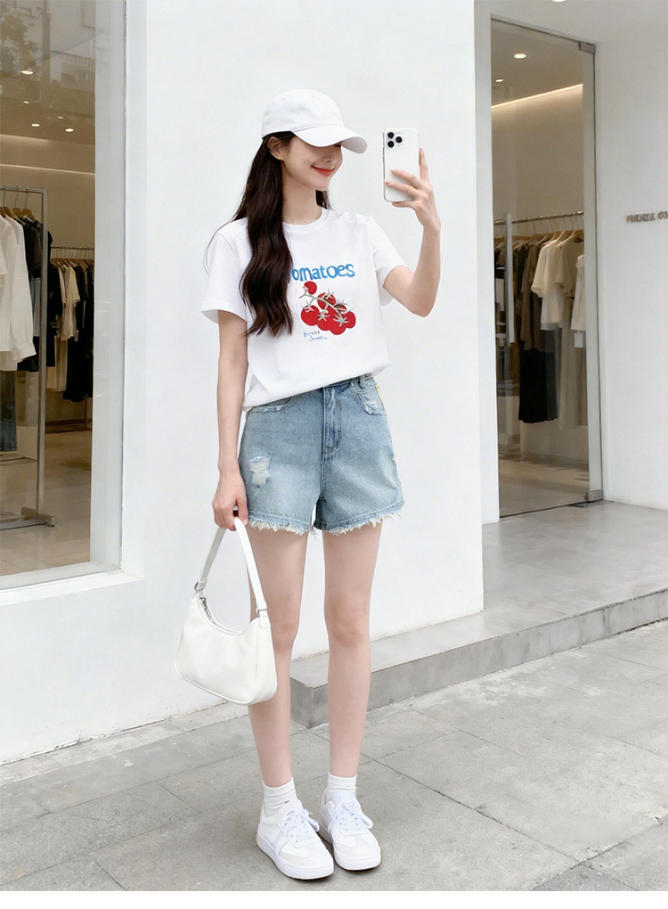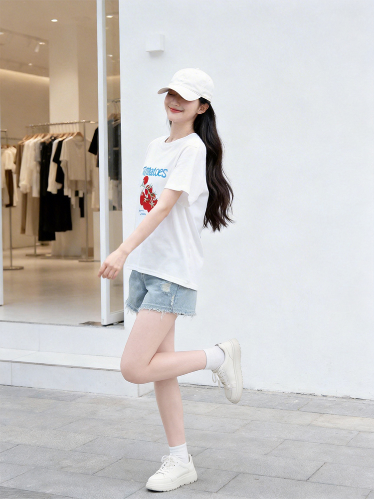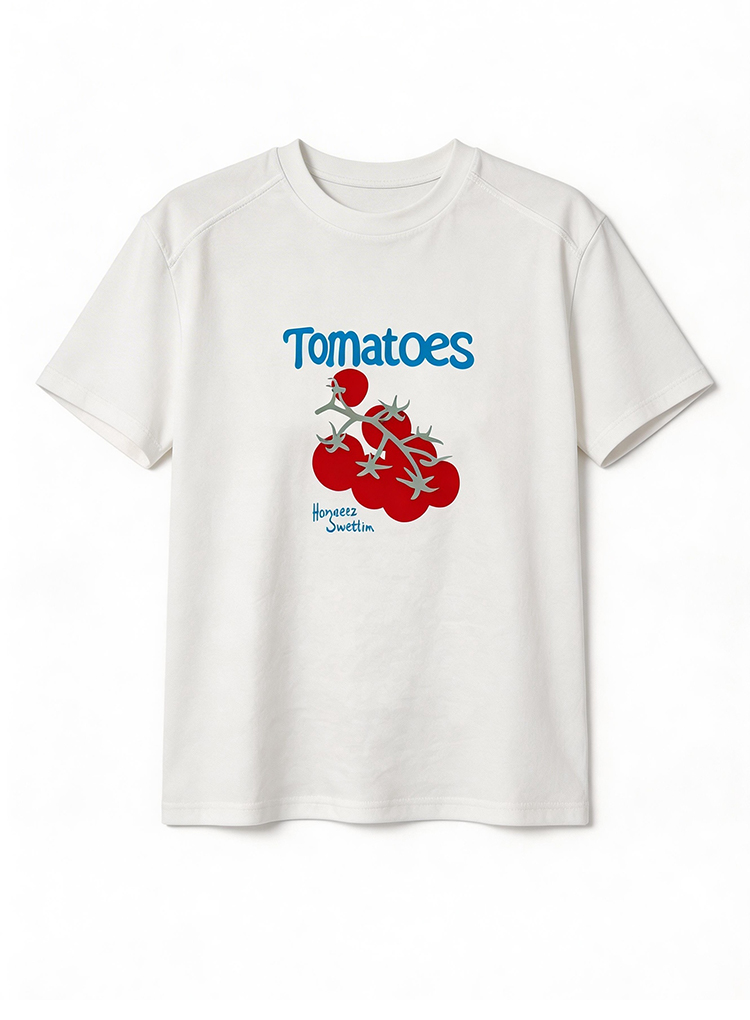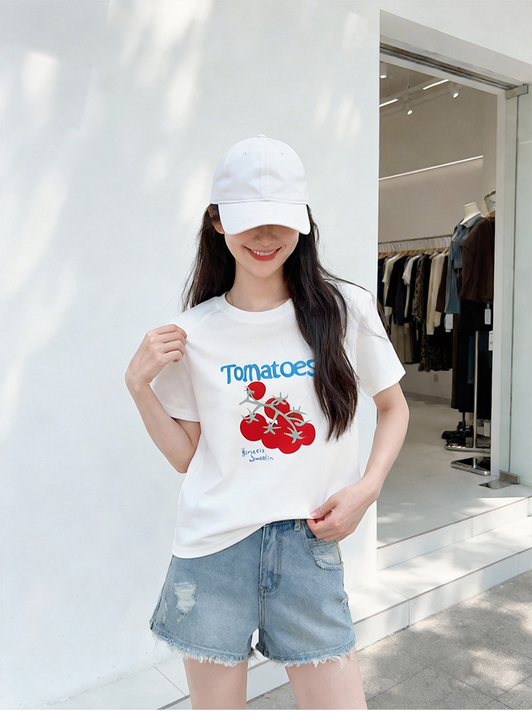 RY1824# 2026年植绒番茄印花白色T恤女夏 多巴胺撞色软糯亲肤宽松短袖上衣