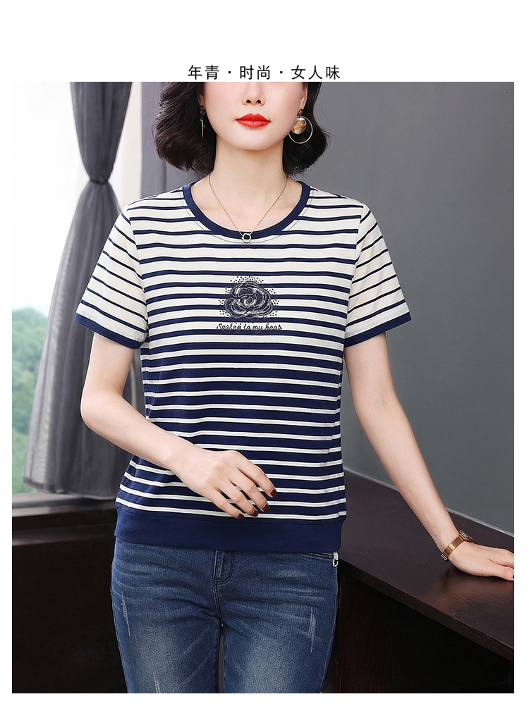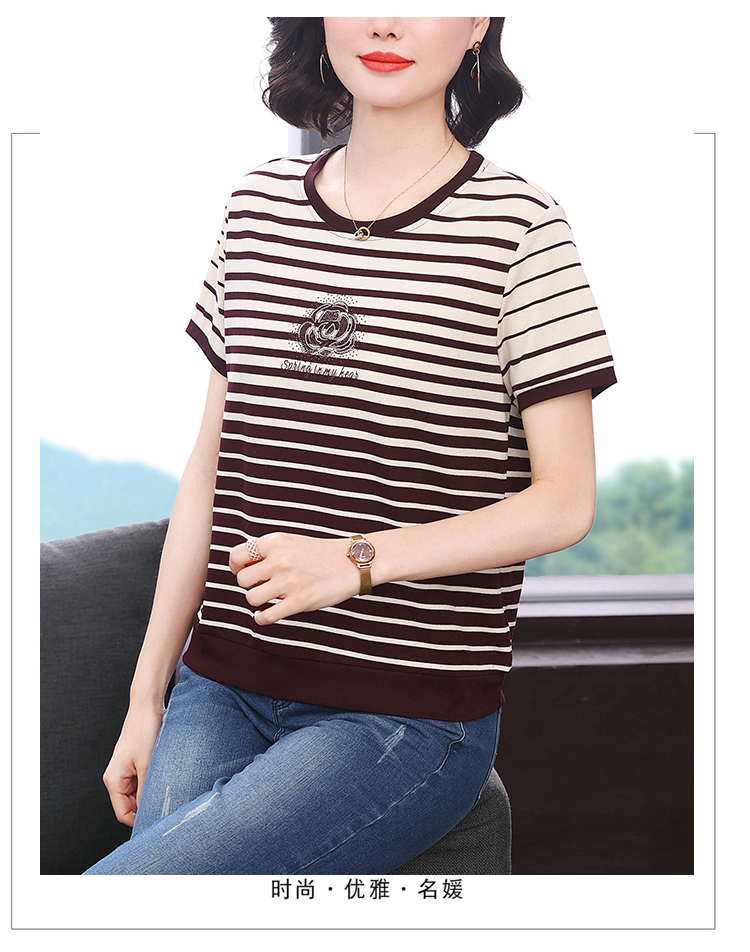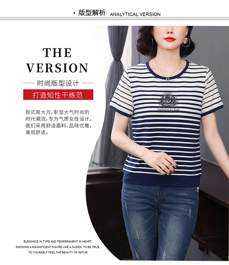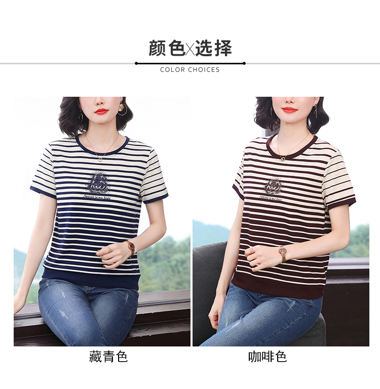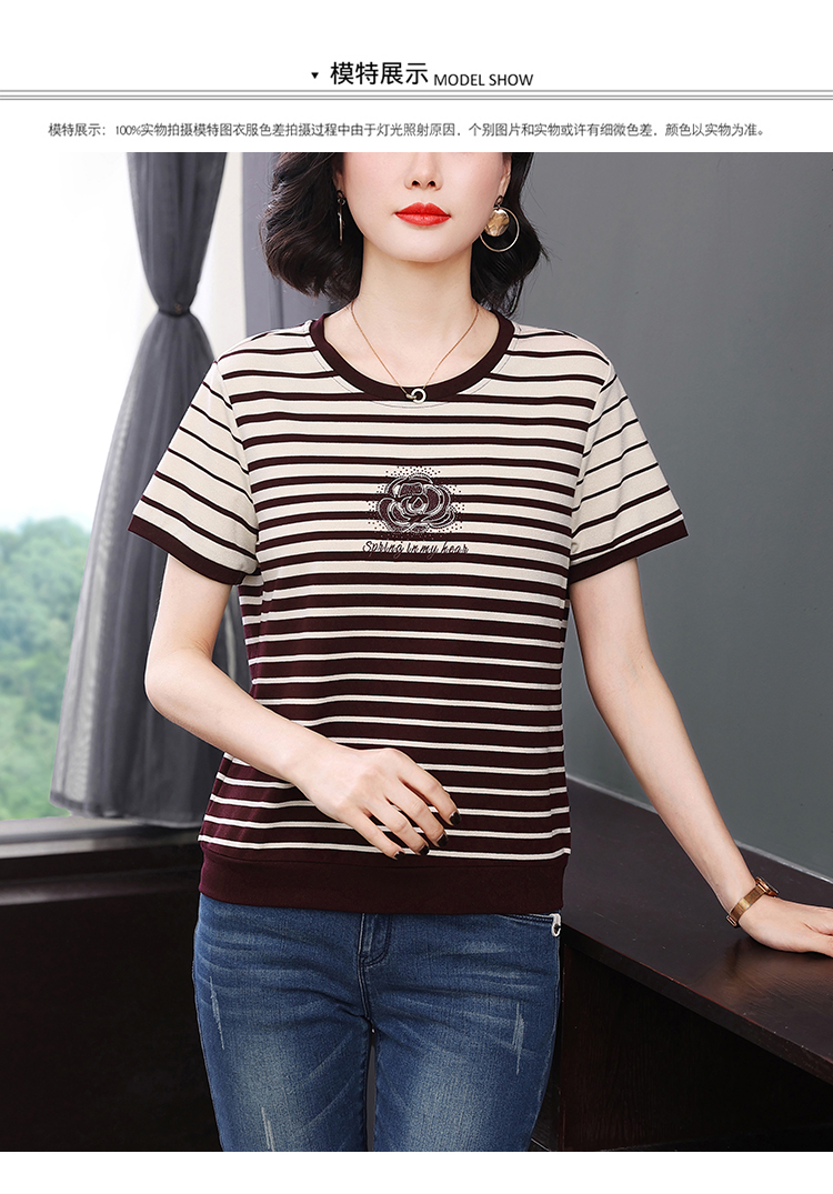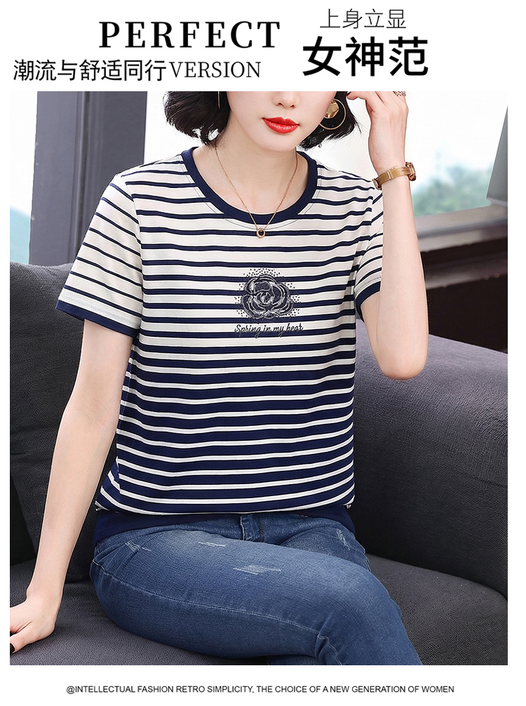 RY1836# 条纹短袖T恤女夏装2025新款洋气中年妈妈上衣宽松藏肉大码体恤衫