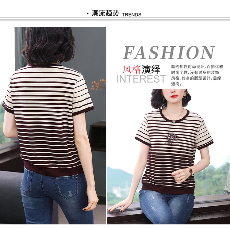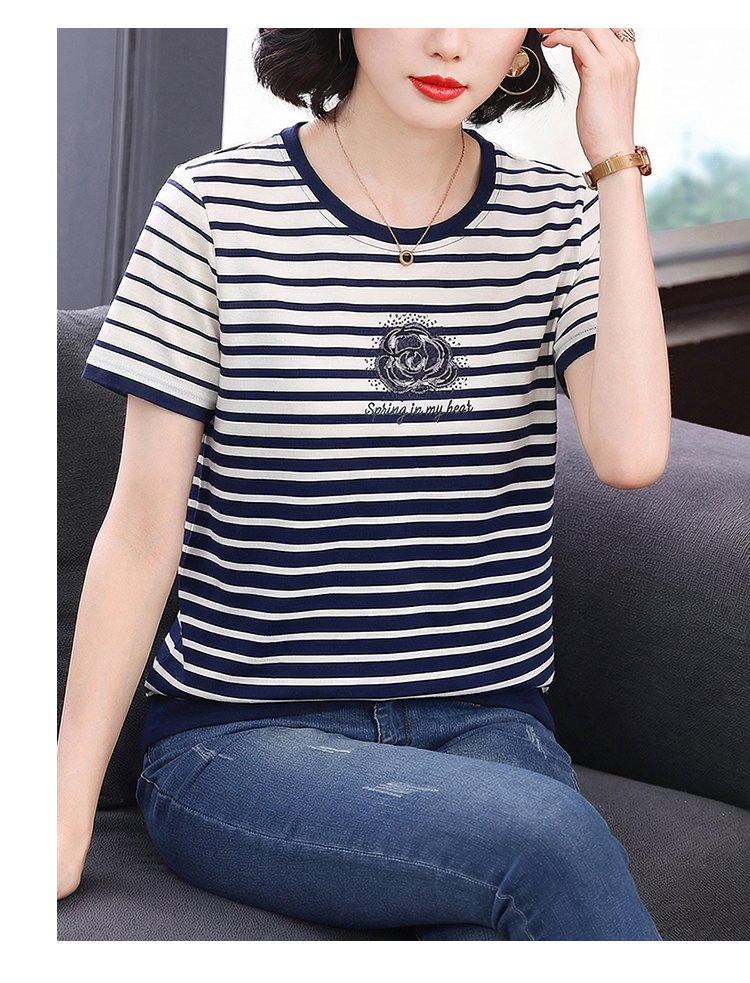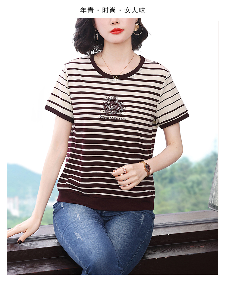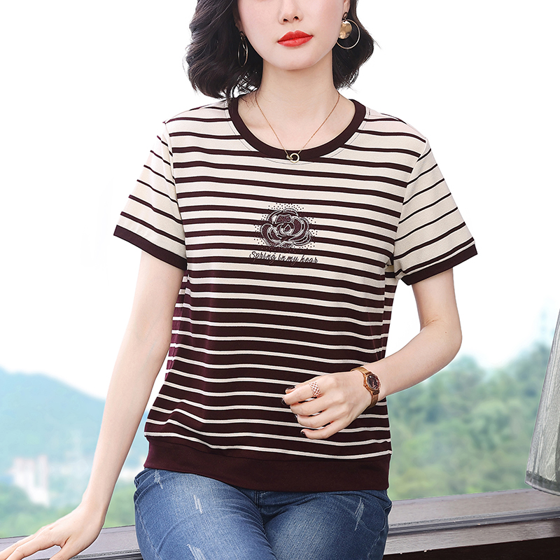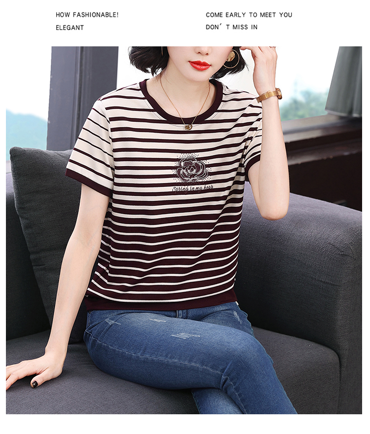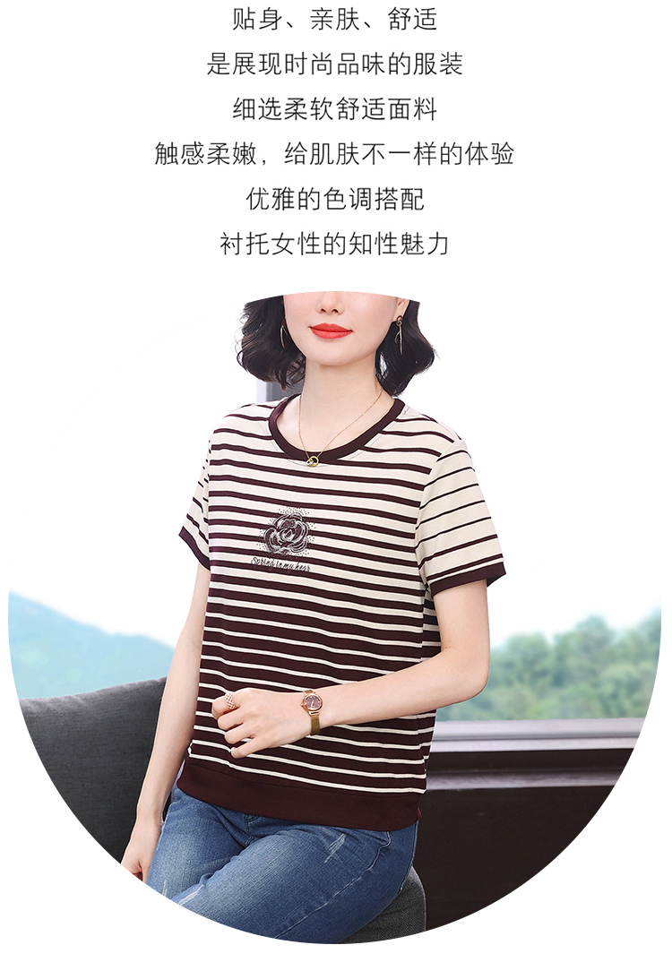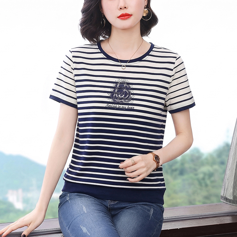 RY1836# 条纹短袖T恤女夏装2025新款洋气中年妈妈上衣宽松藏肉大码体恤衫
