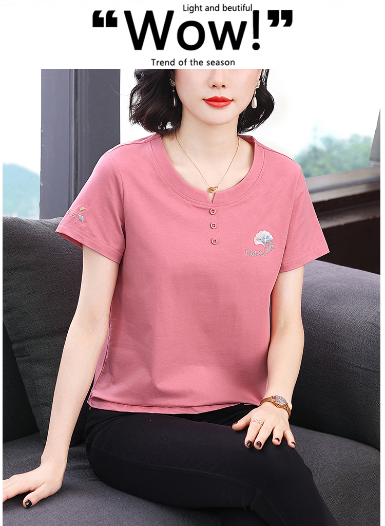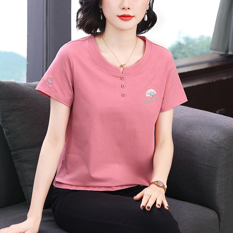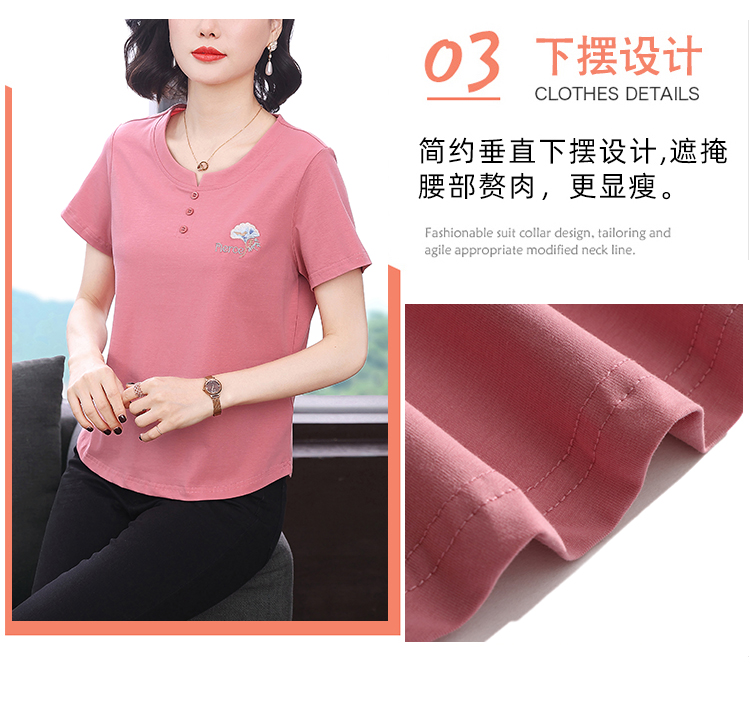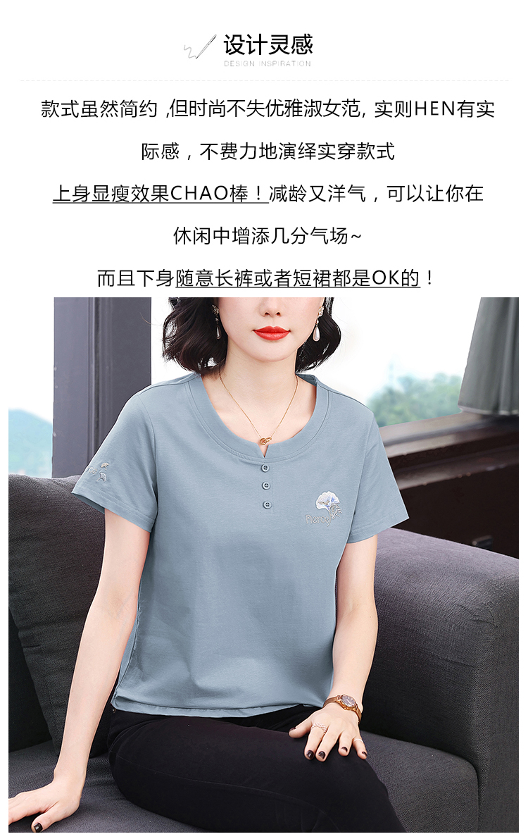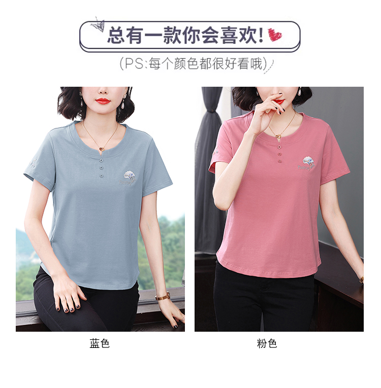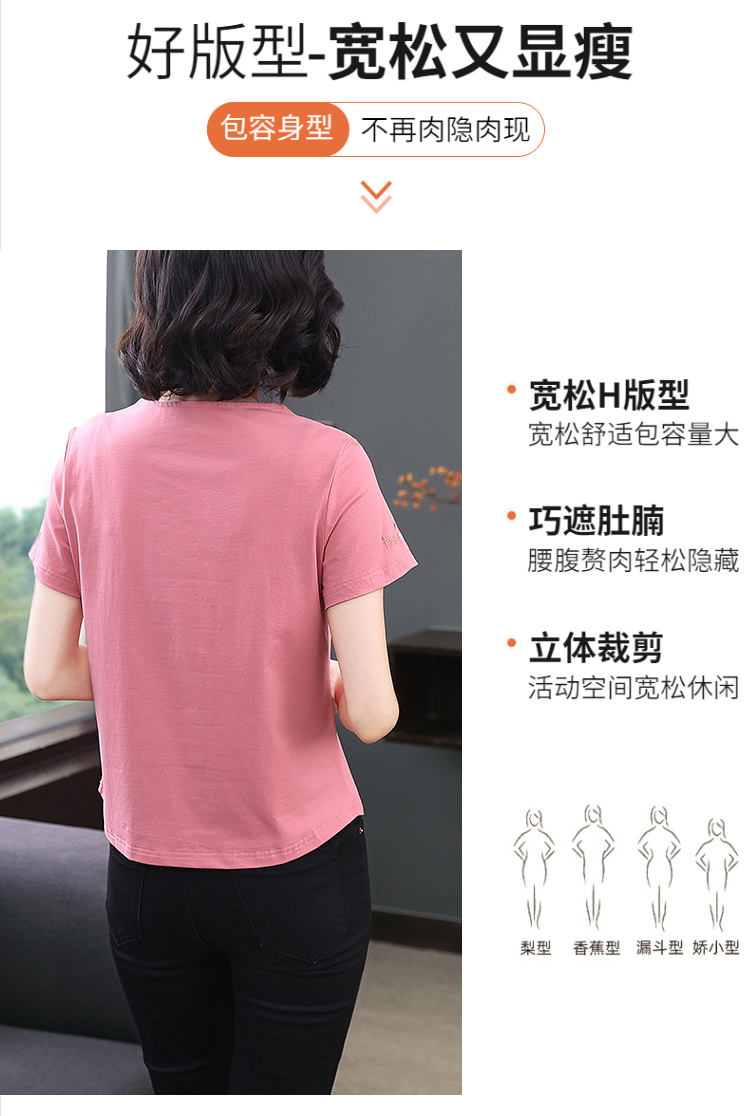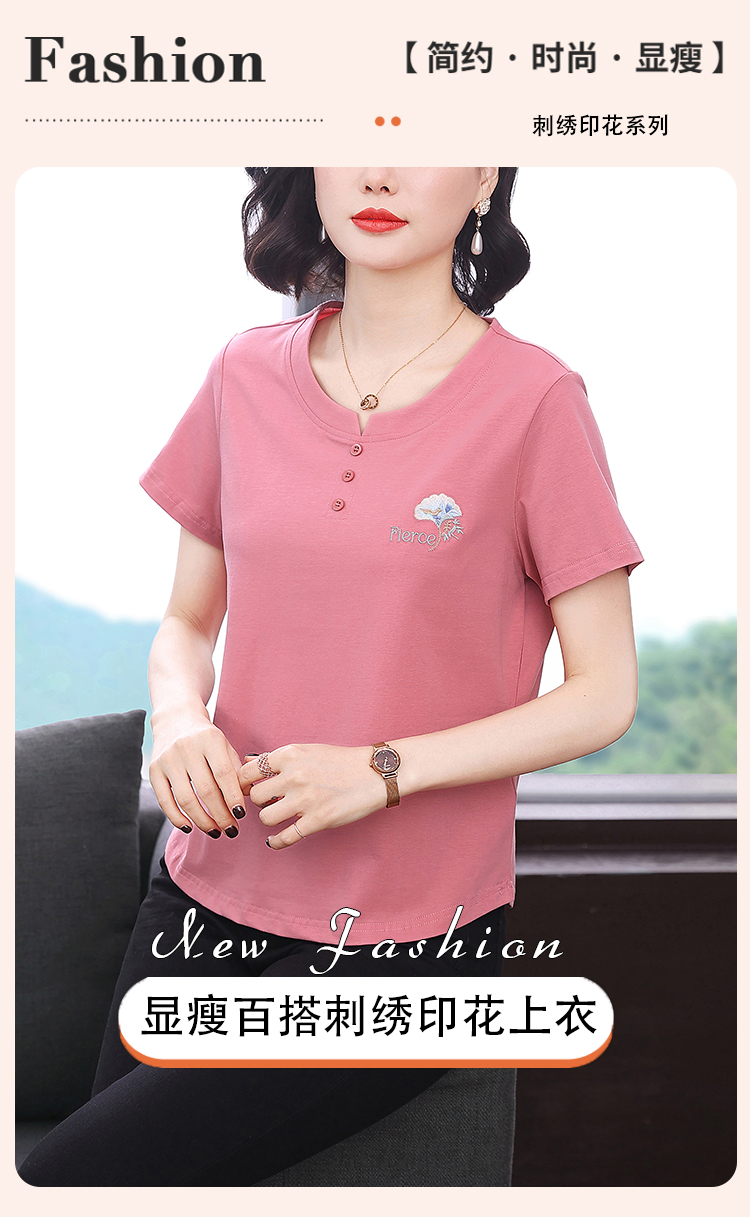 RY1839# 短袖T恤女纯棉刺绣宽松上衣2026新款中年妈妈装洋气大码体恤