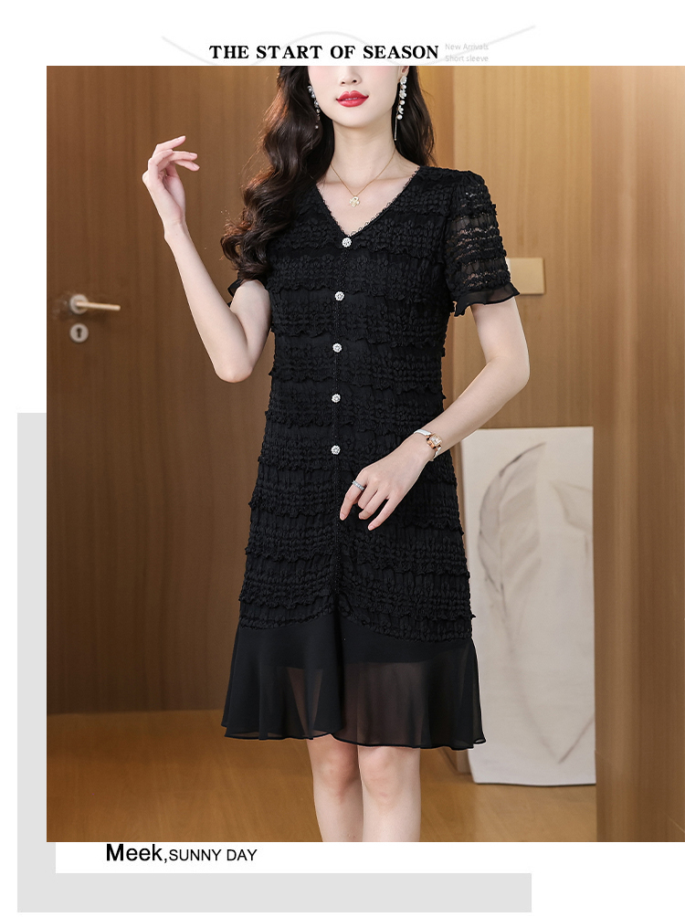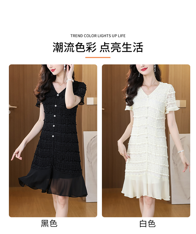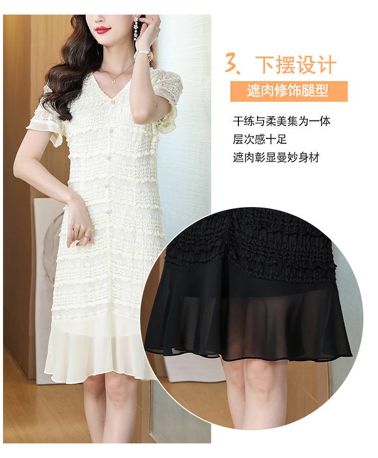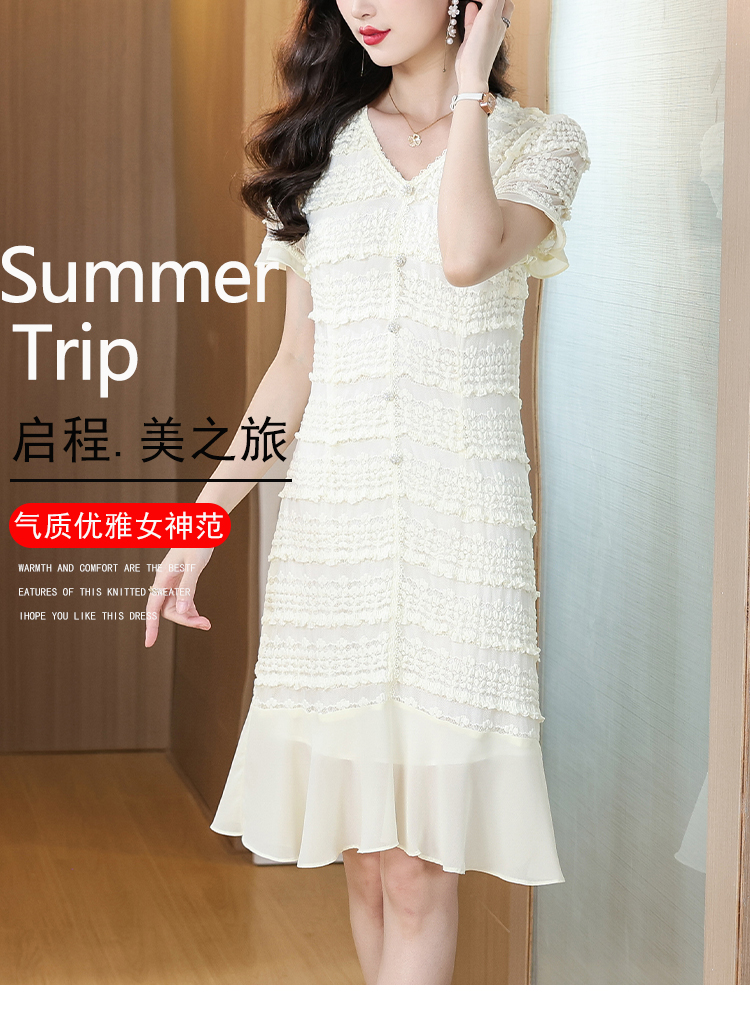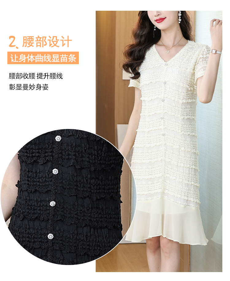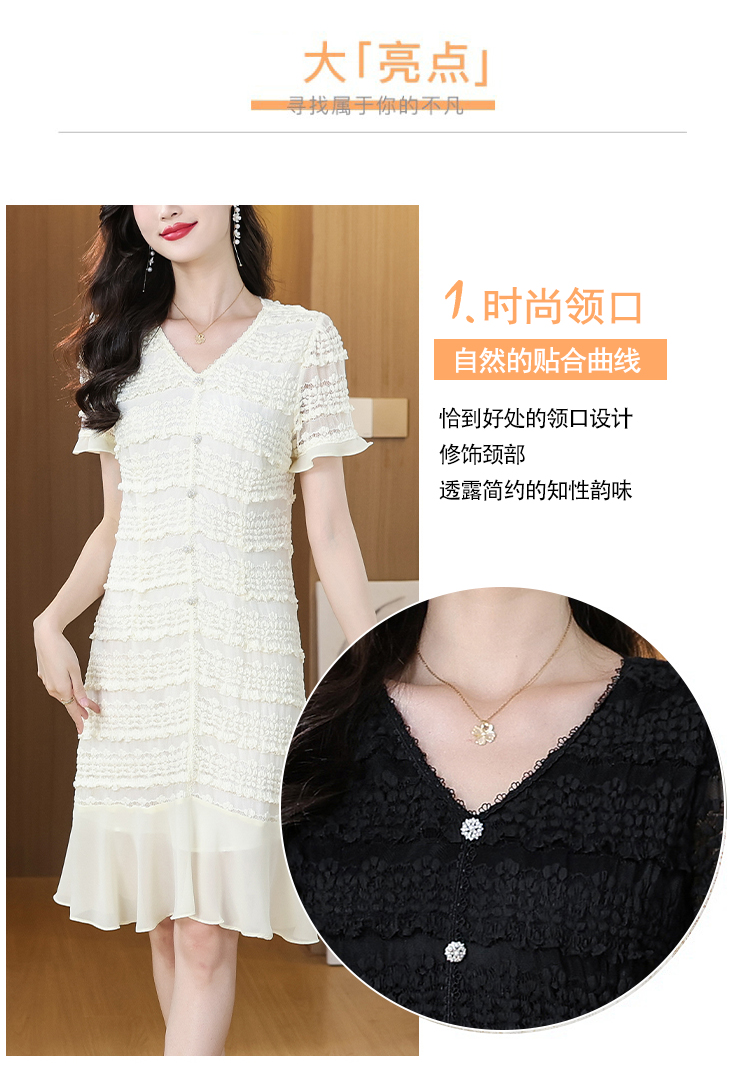 RY1841# V领短袖层层褶皱荷叶边鱼尾下摆中长款温柔风气质显瘦蕾丝连衣裙