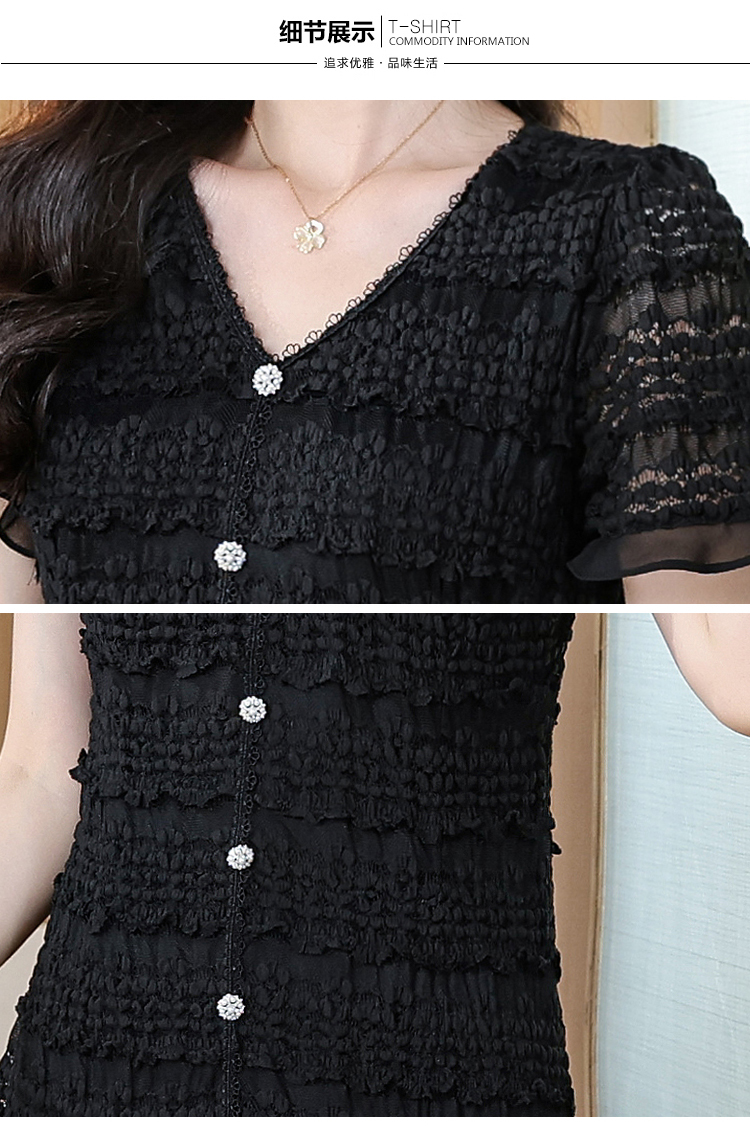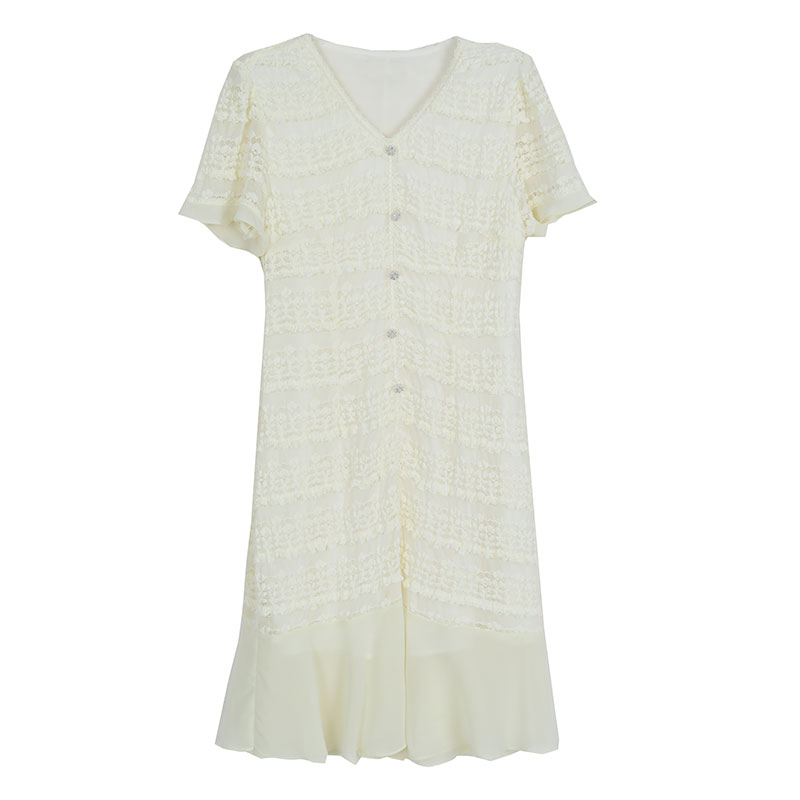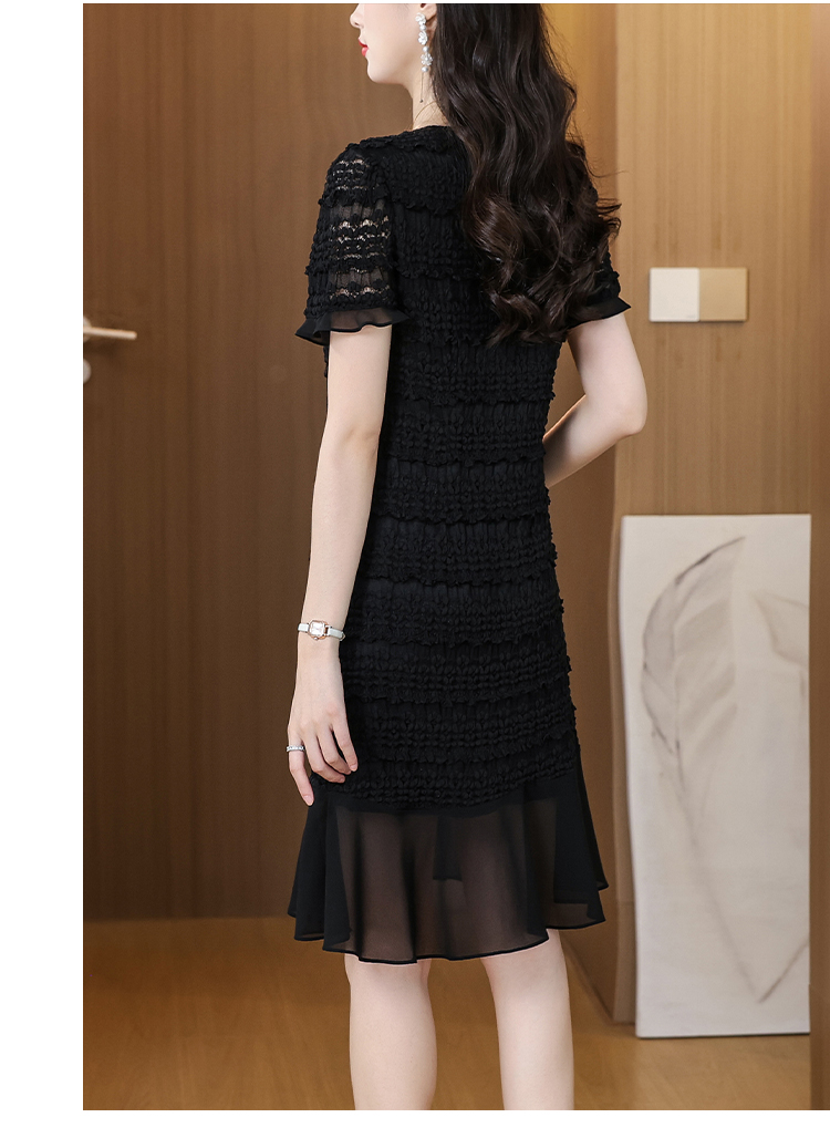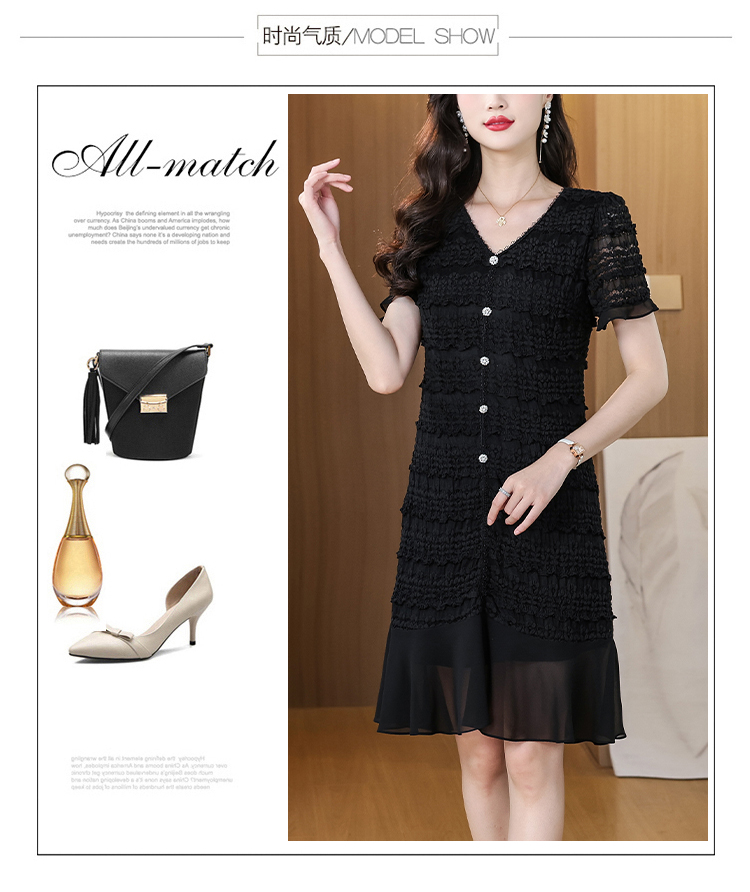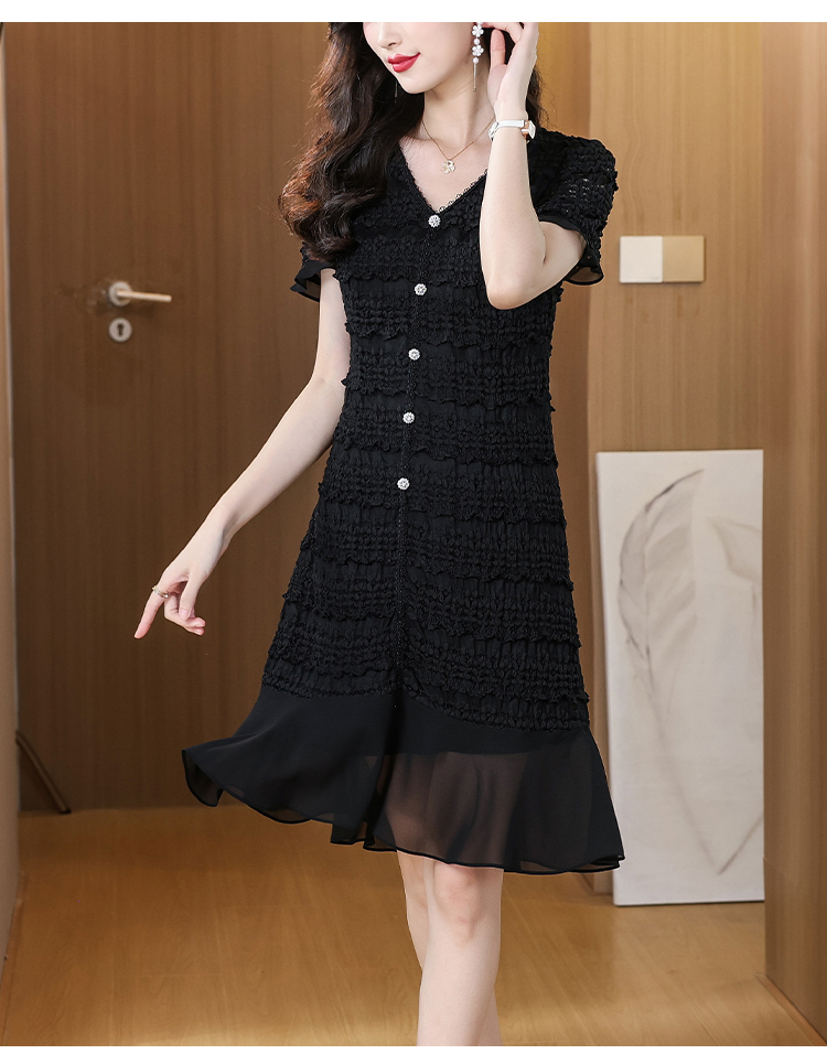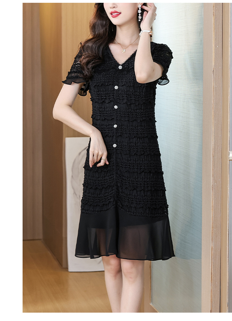 RY1841# V领短袖层层褶皱荷叶边鱼尾下摆中长款温柔风气质显瘦蕾丝连衣裙