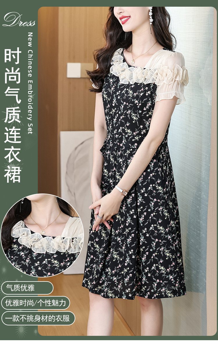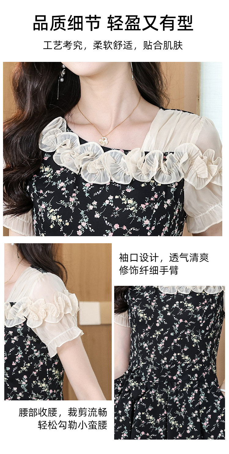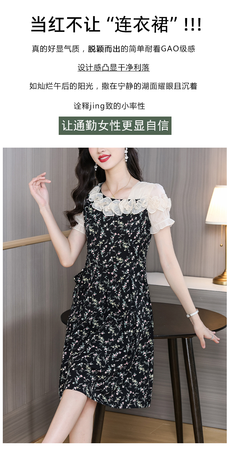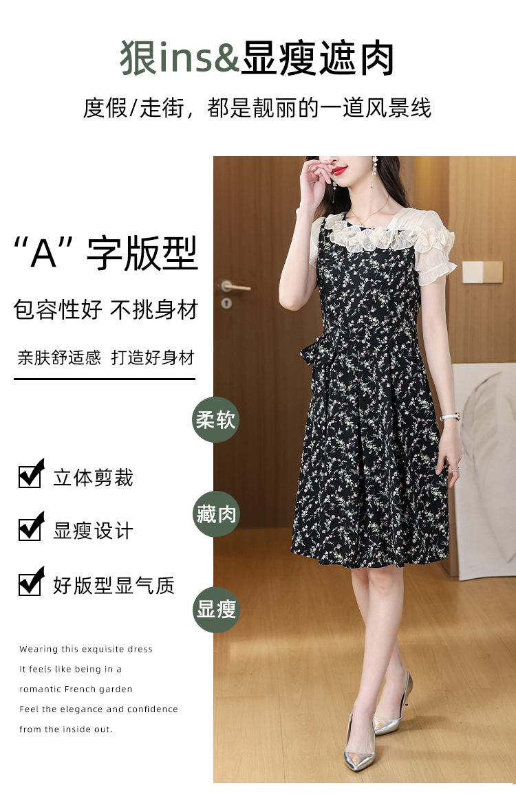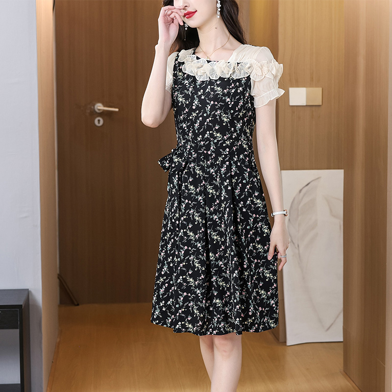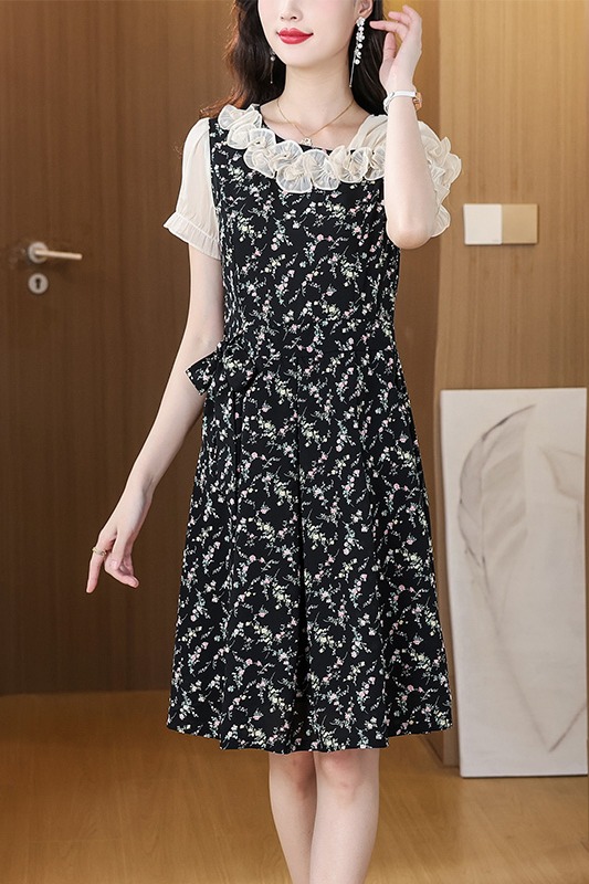 RY1843# 黑色碎花雪纺飘带连衣裙女荷叶边遮肚百搭优雅时尚甜美中年女装裙