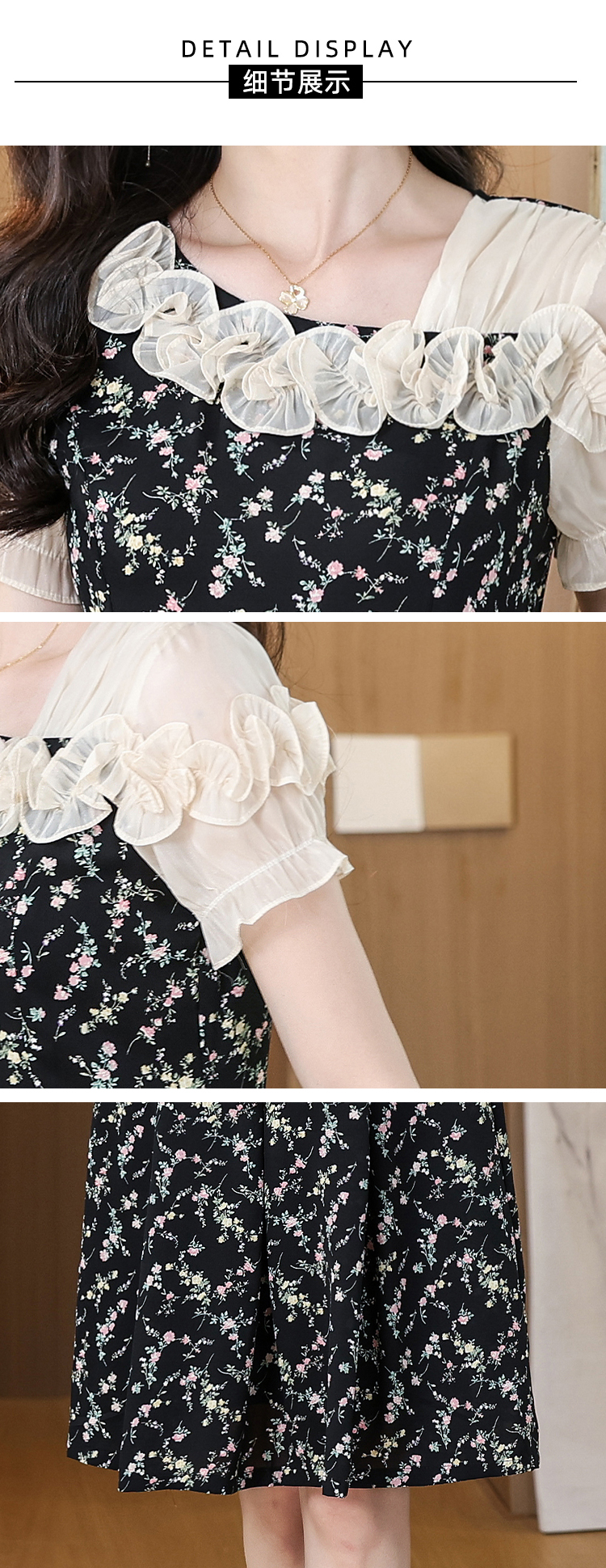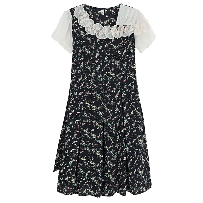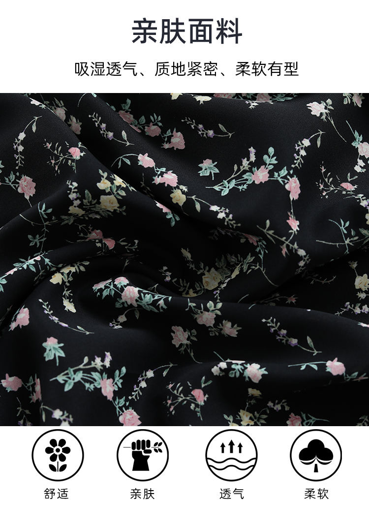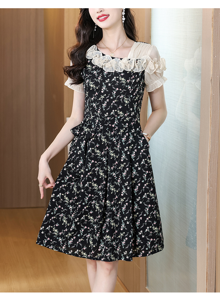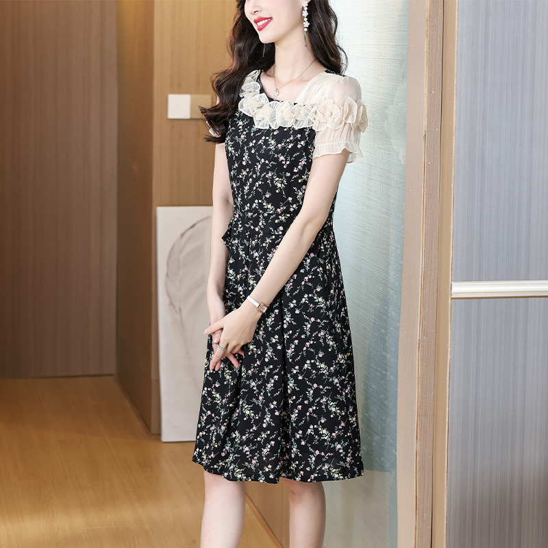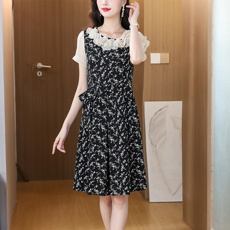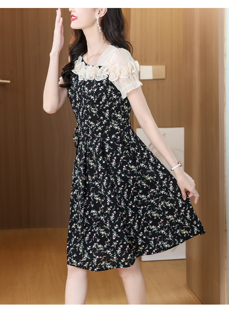 RY1843# 黑色碎花雪纺飘带连衣裙女荷叶边遮肚百搭优雅时尚甜美中年女装裙