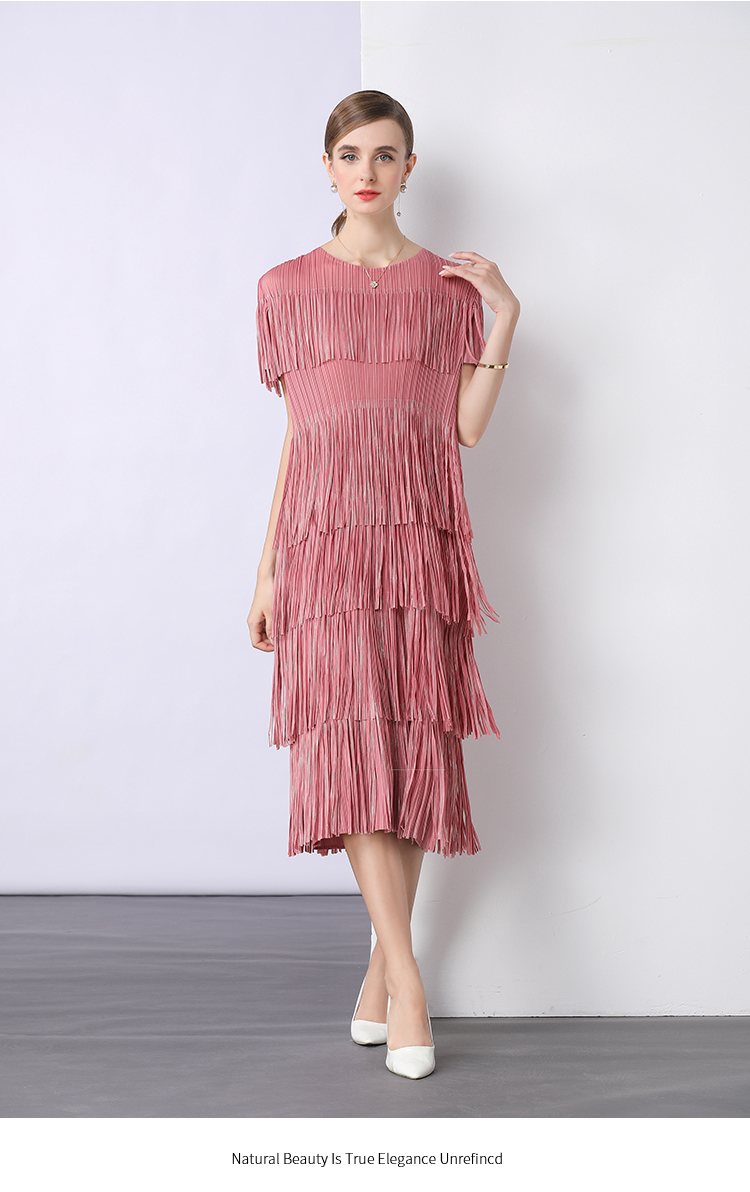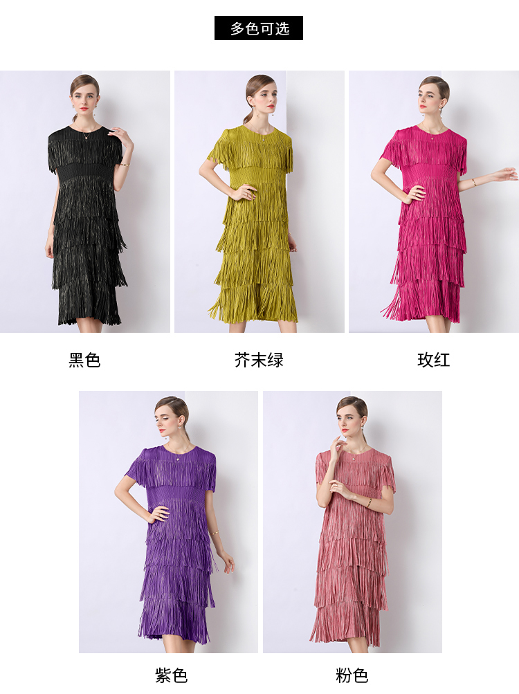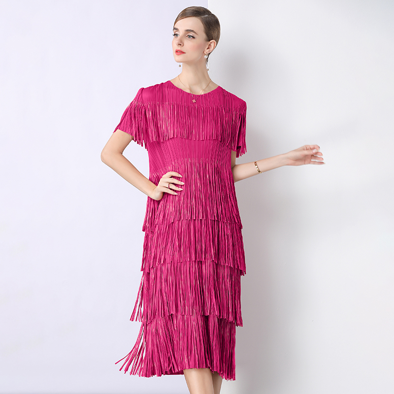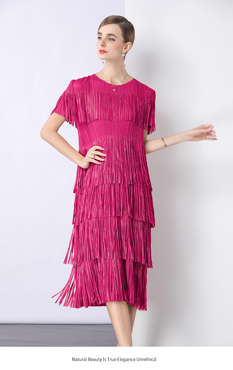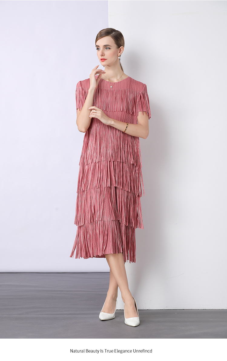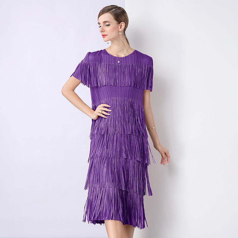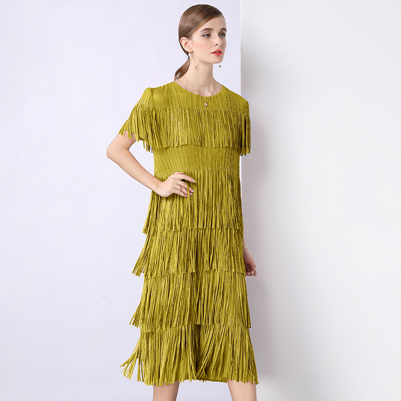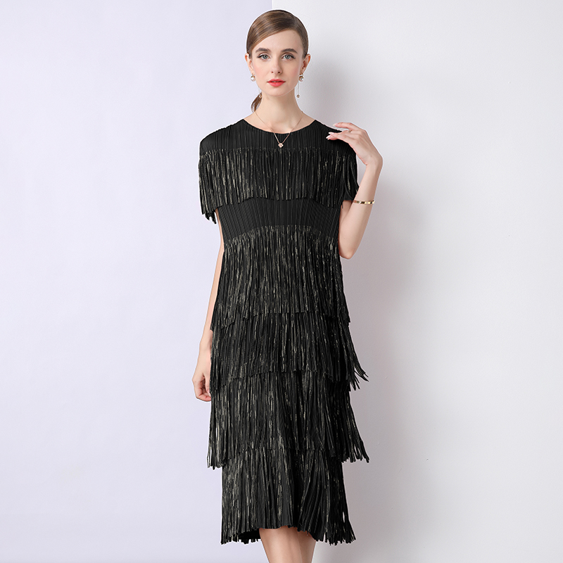 RY1920# 三宅2025外贸烫金流苏蛋糕裙欧美短袖秋季新款优雅宽松褶皱连衣裙
