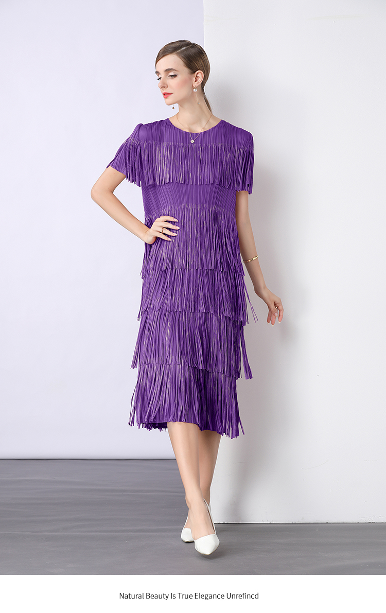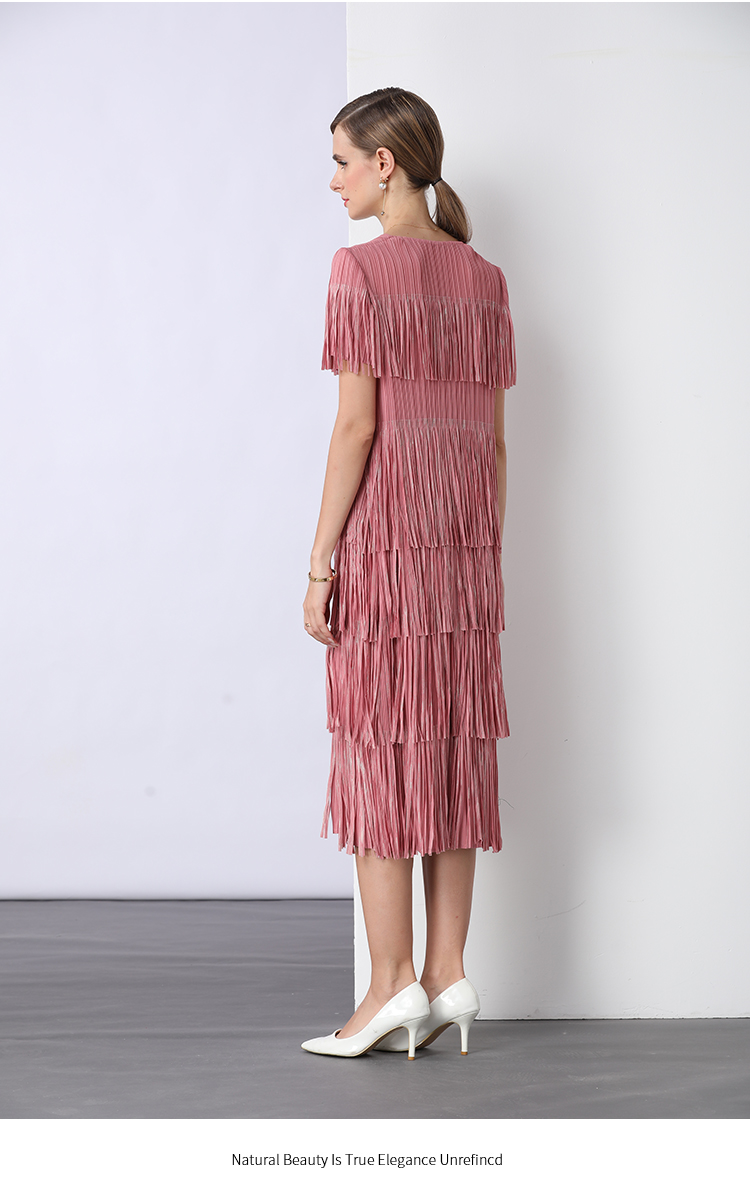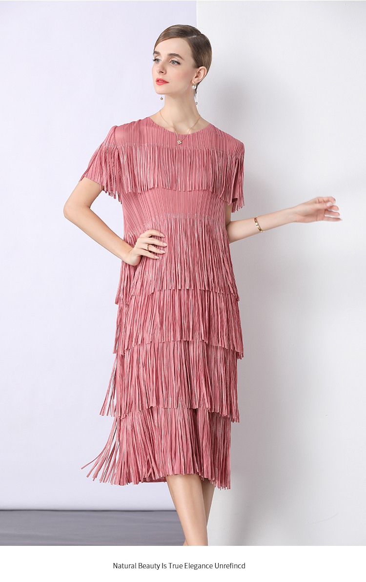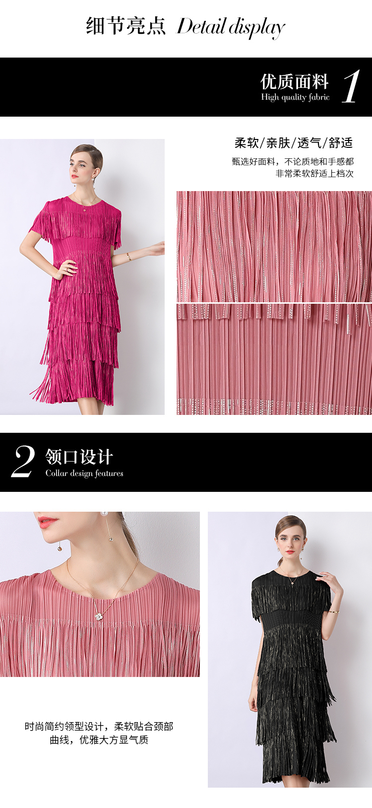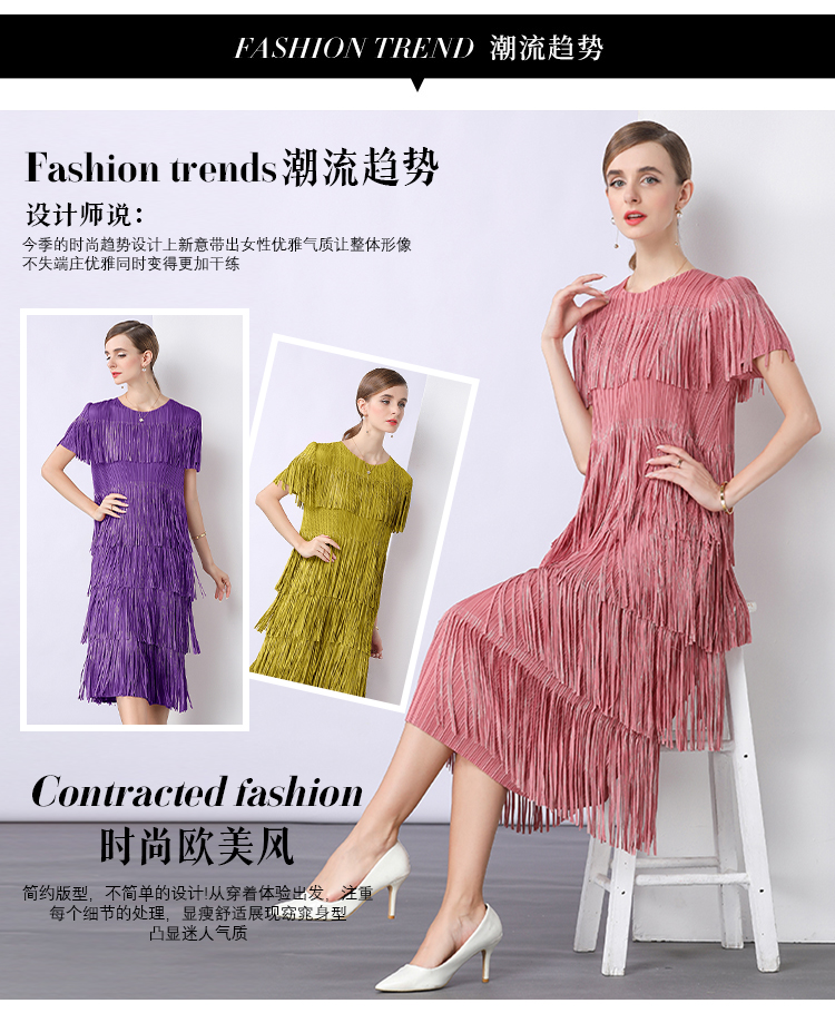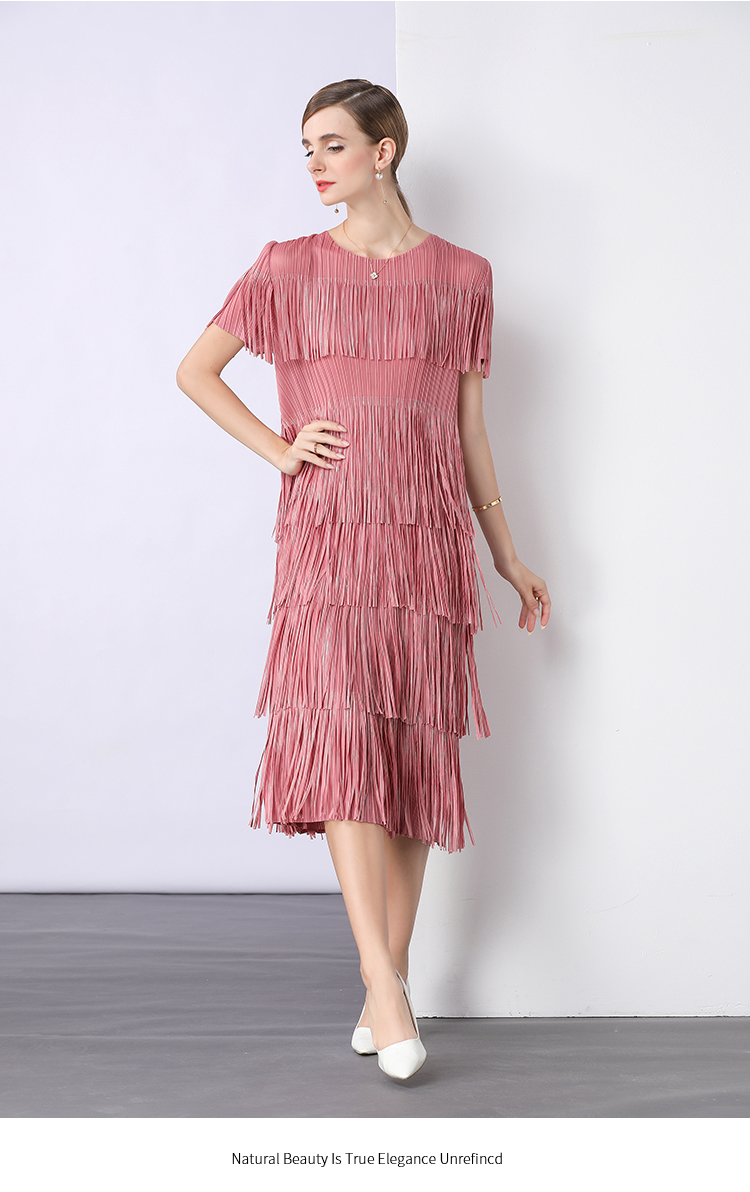 RY1920# 三宅2025外贸烫金流苏蛋糕裙欧美短袖秋季新款优雅宽松褶皱连衣裙