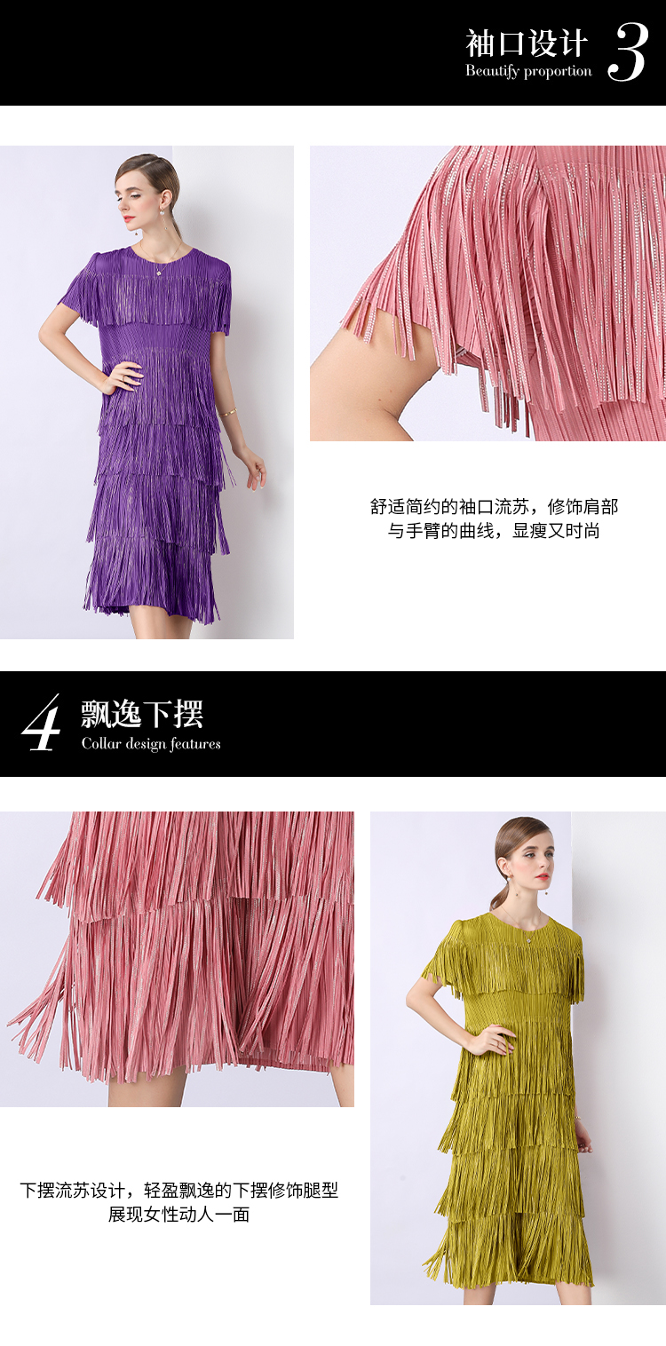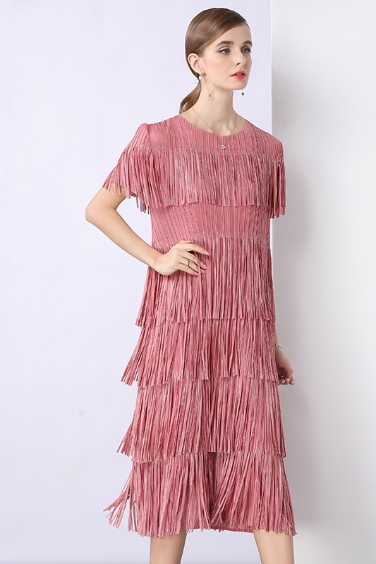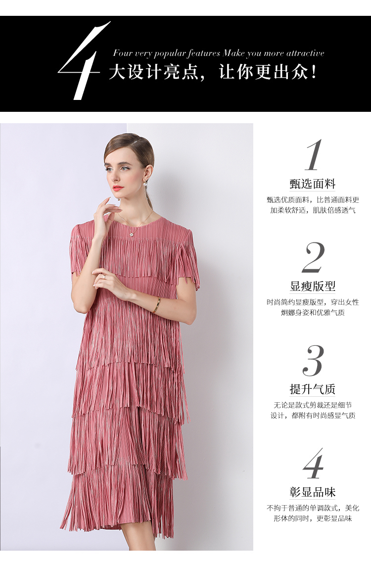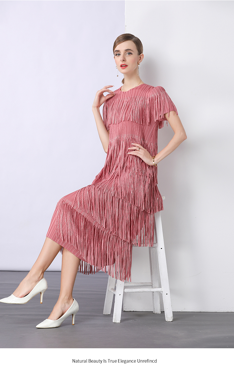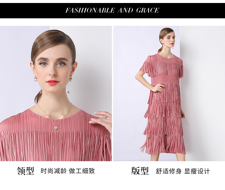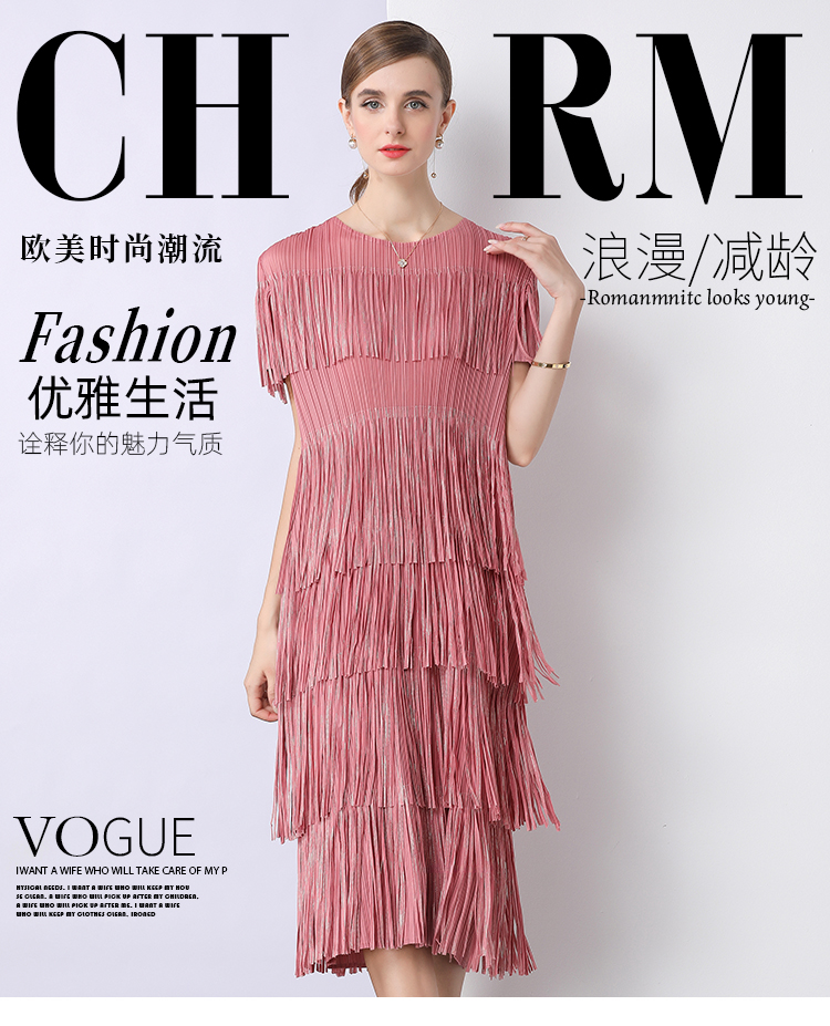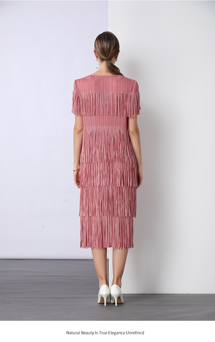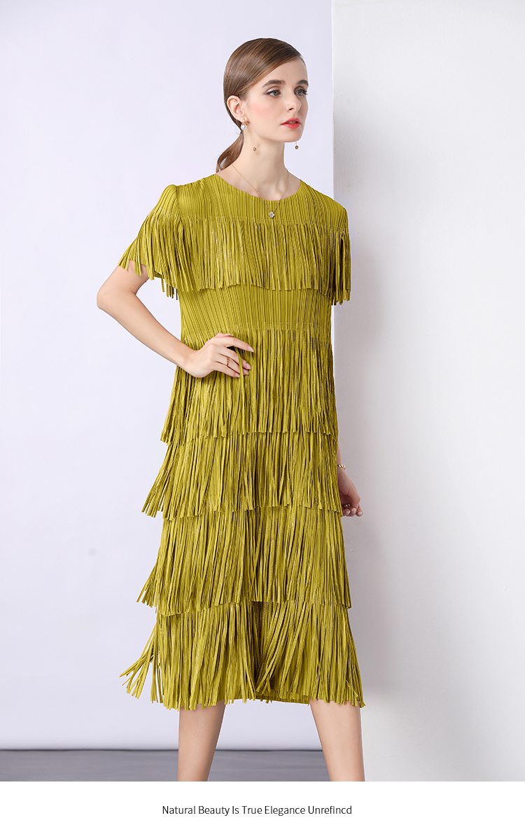 RY1920# 三宅2025外贸烫金流苏蛋糕裙欧美短袖秋季新款优雅宽松褶皱连衣裙