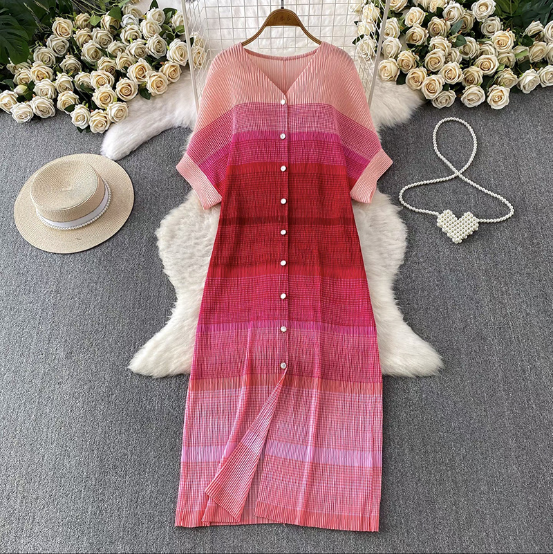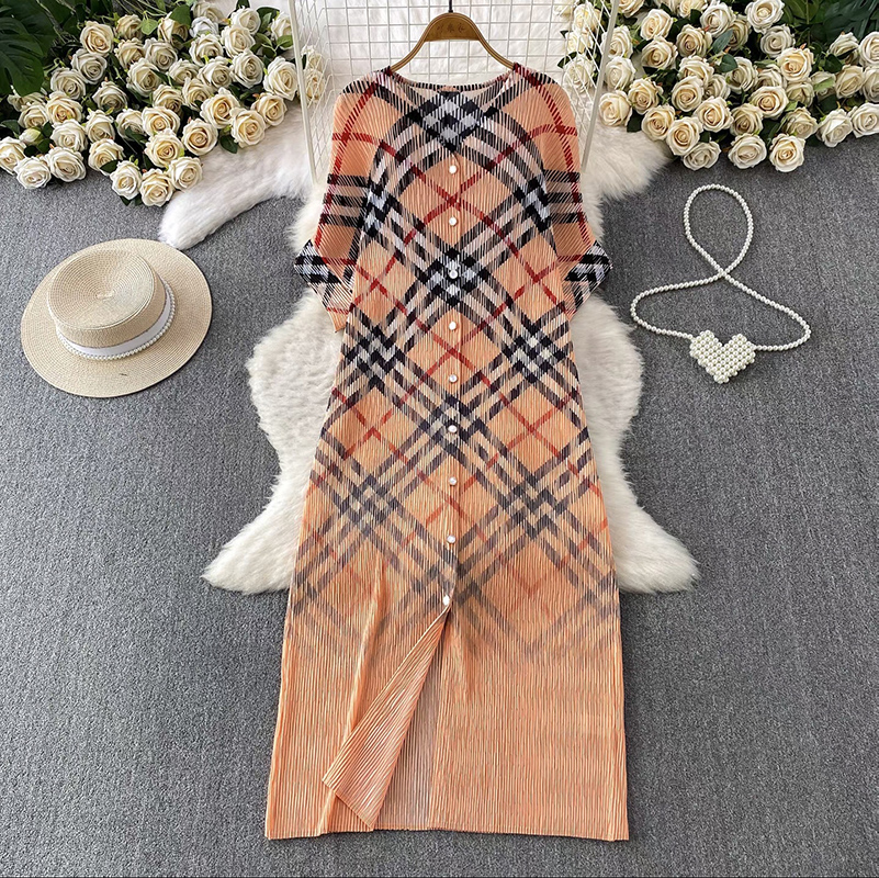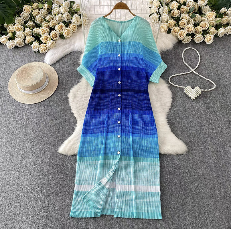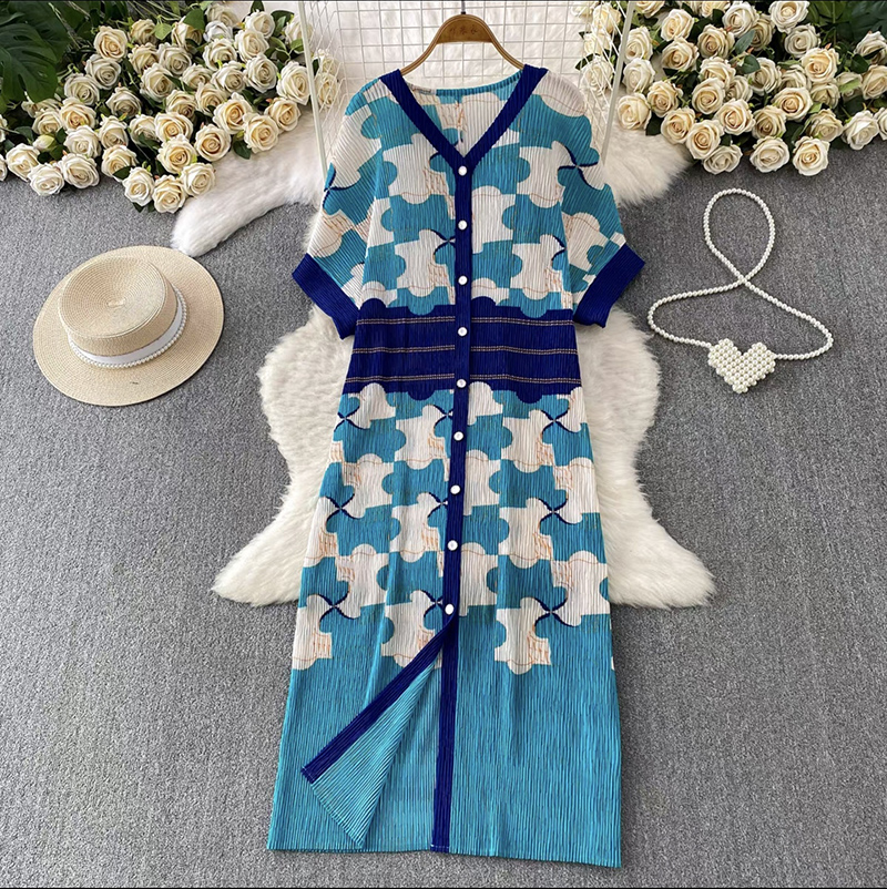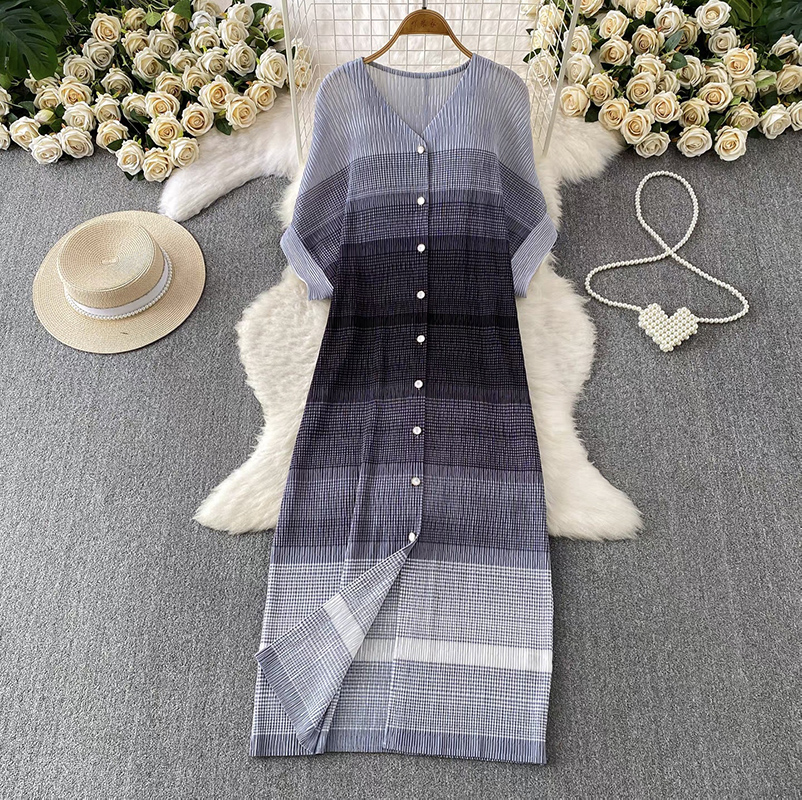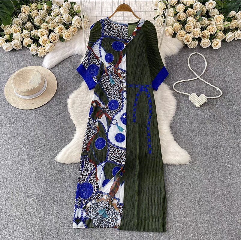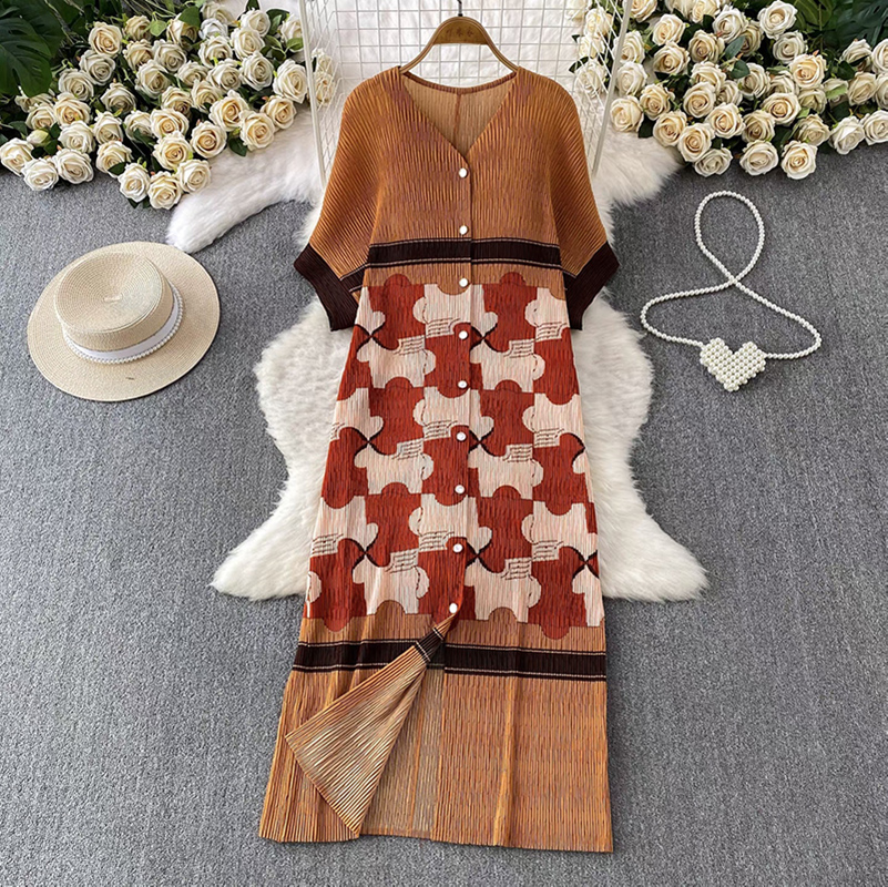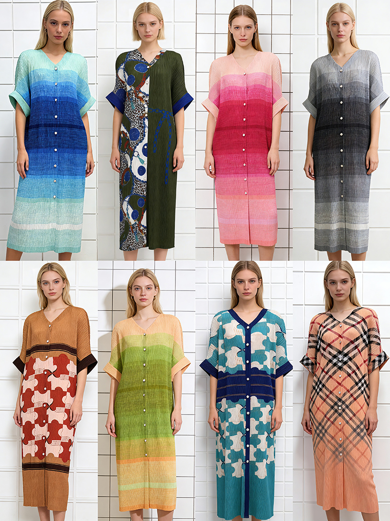 RY1925# 三宅外贸蝙蝠袖宽松褶皱连衣裙印花大码女装mm装优雅显瘦女开衫裙