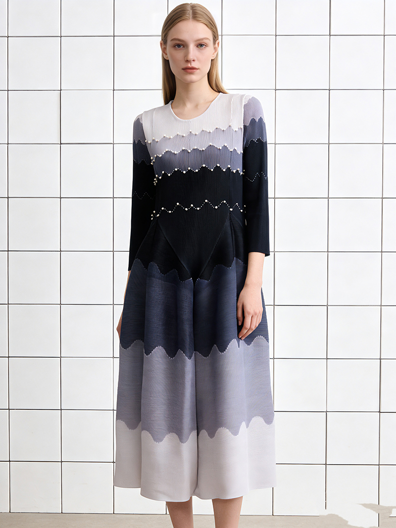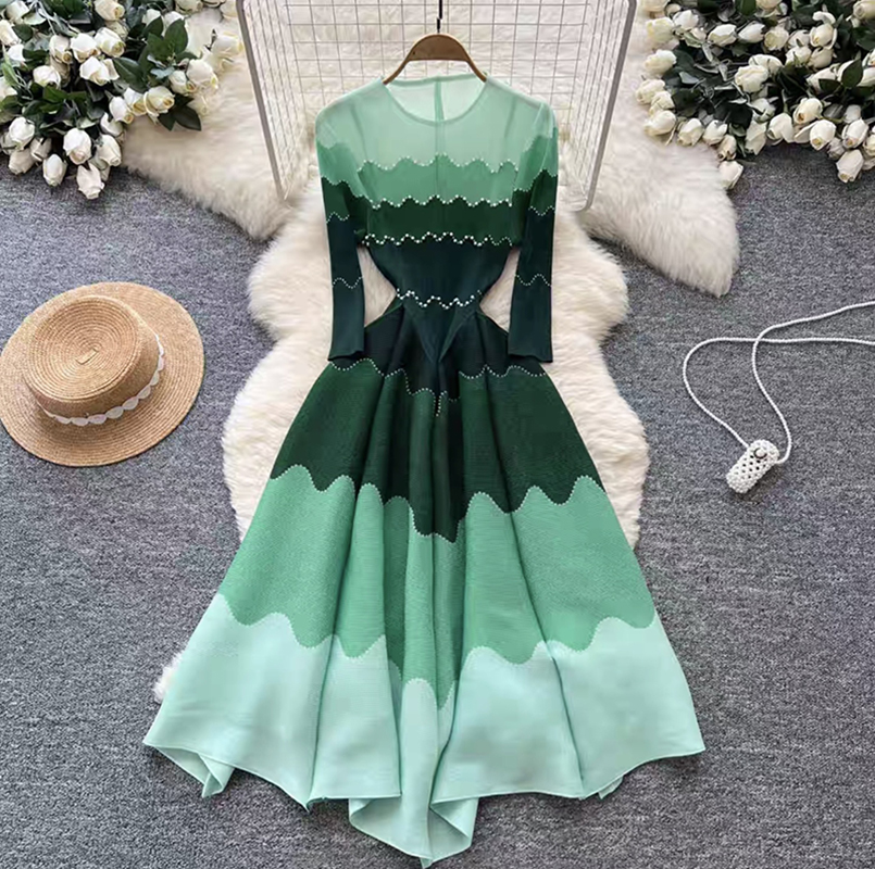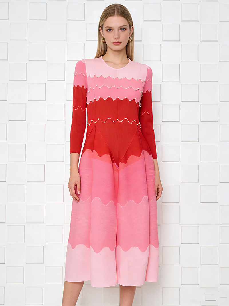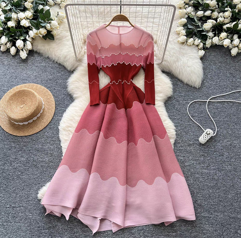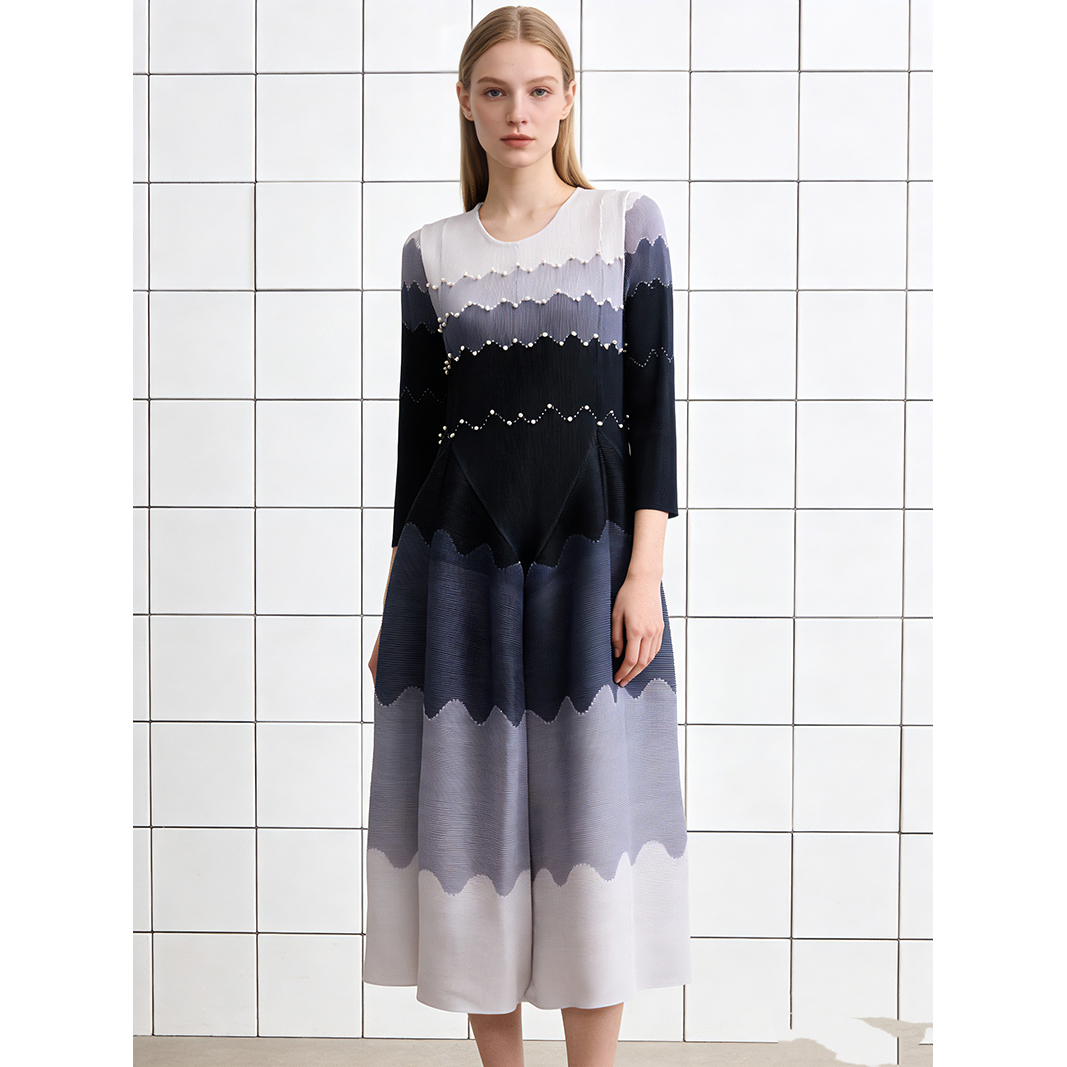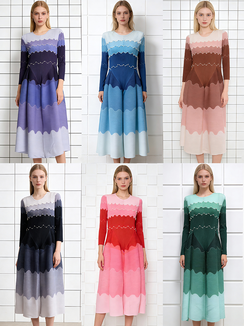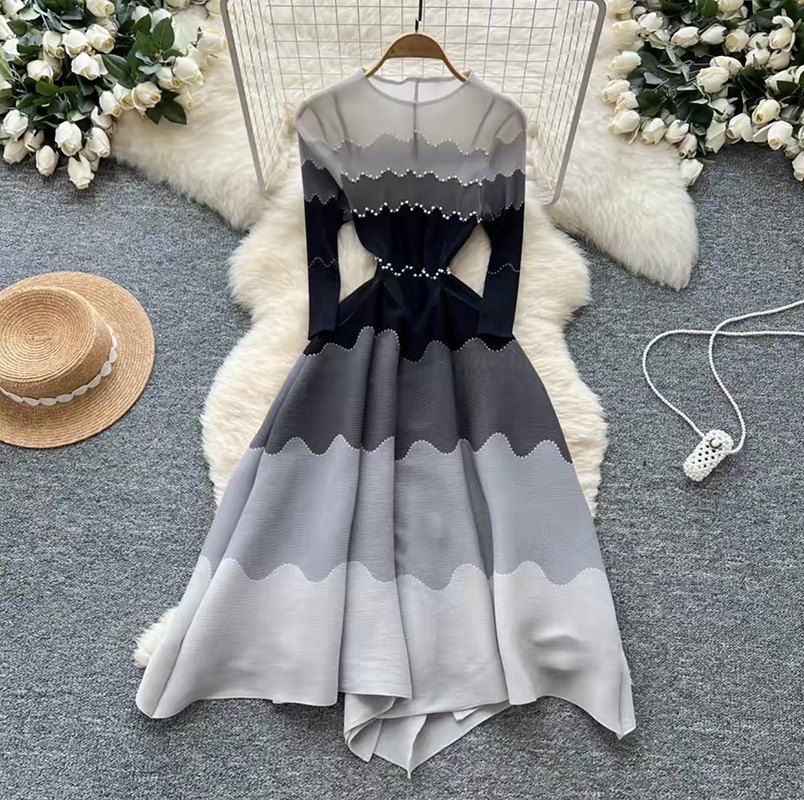 RY1927# 褶皱印花钉珠八片裙欧美跨境重工压褶拼色收腰大摆长裙三宅连衣裙