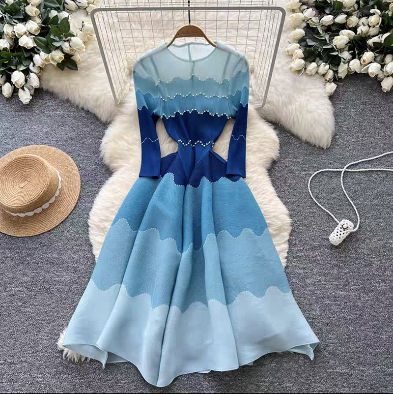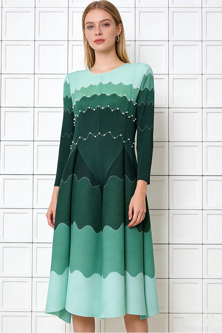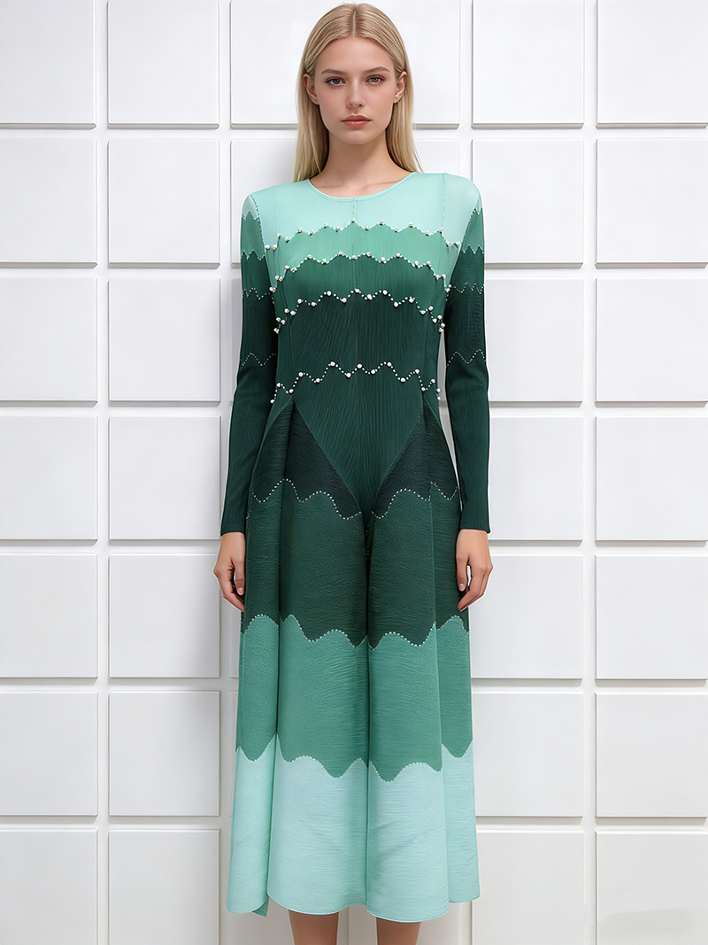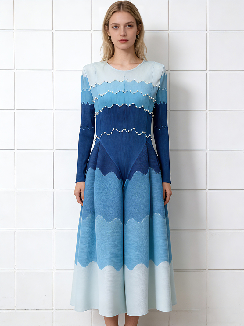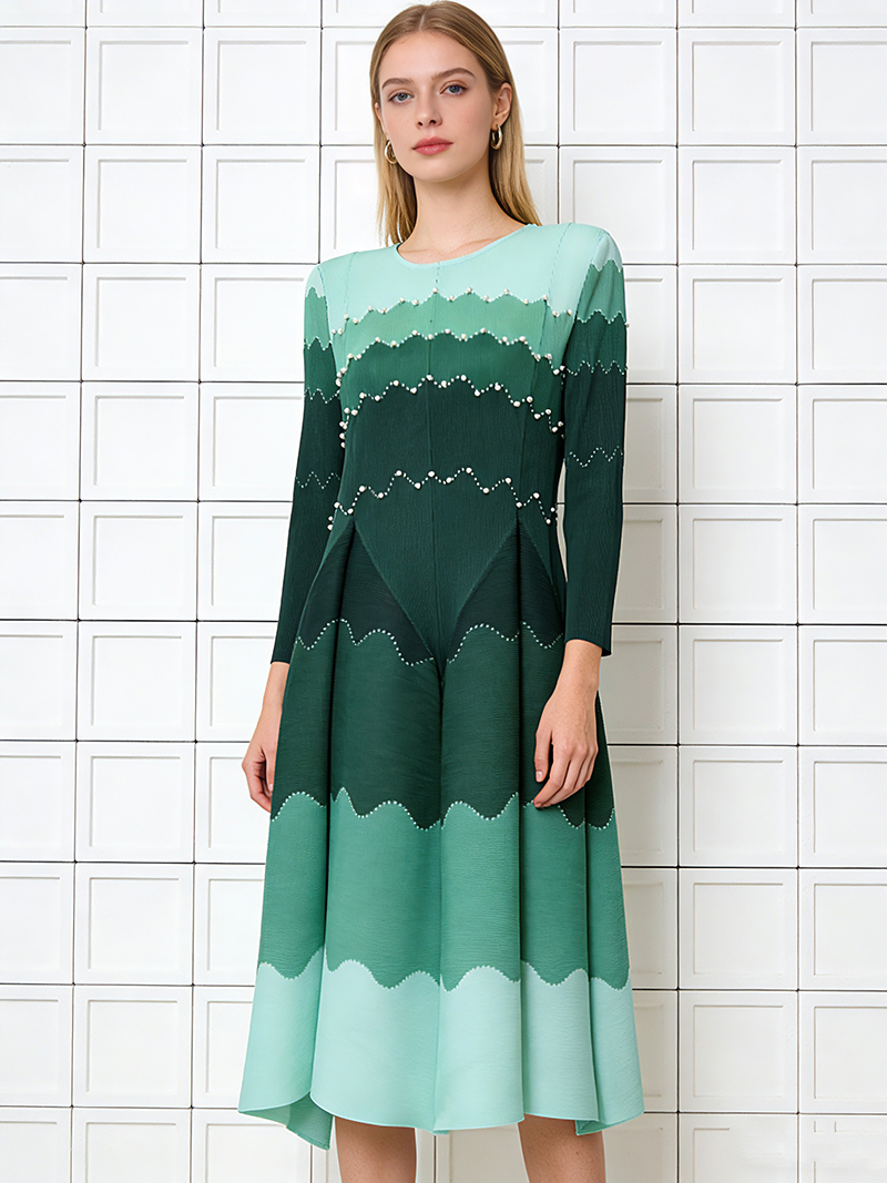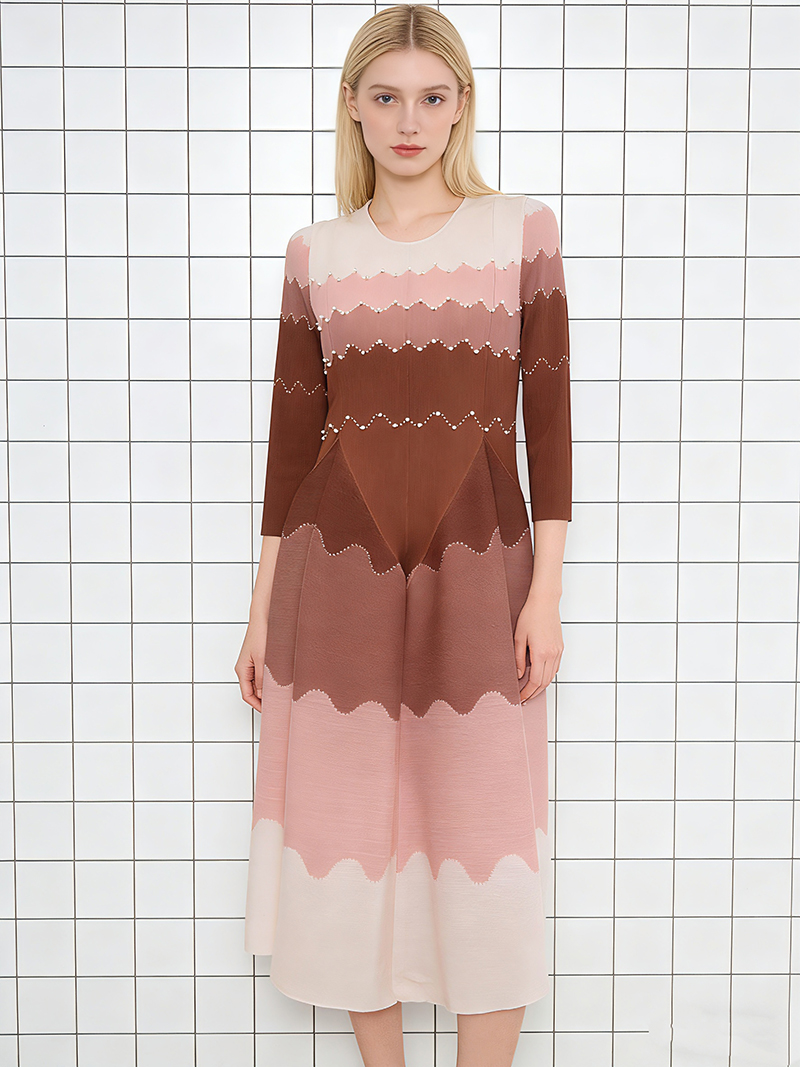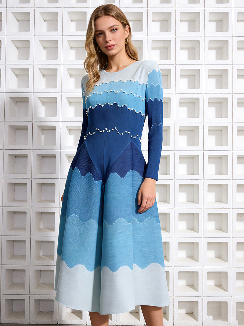 RY1927# 褶皱印花钉珠八片裙欧美跨境重工压褶拼色收腰大摆长裙三宅连衣裙