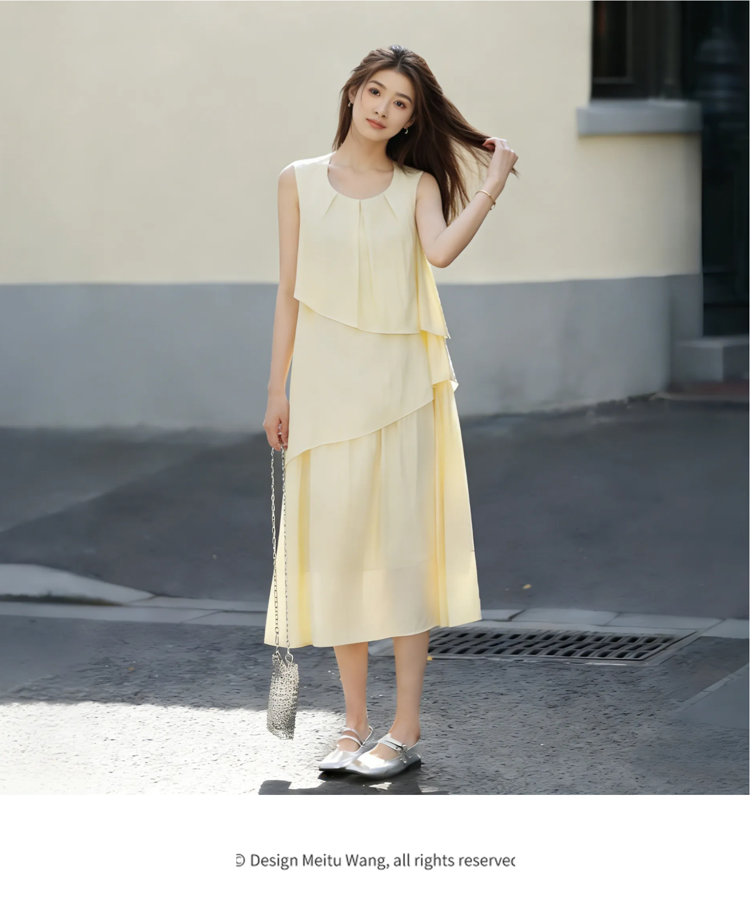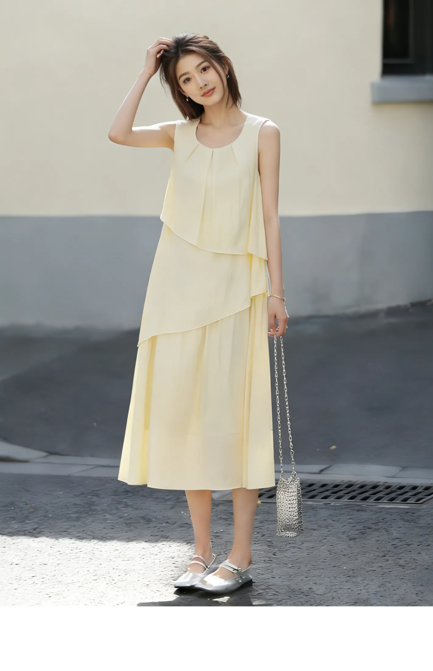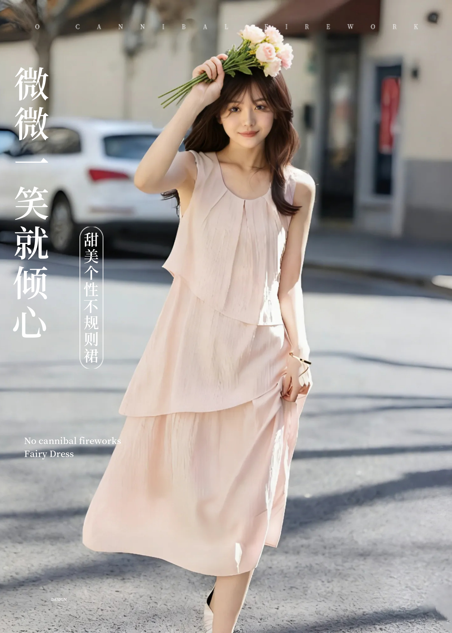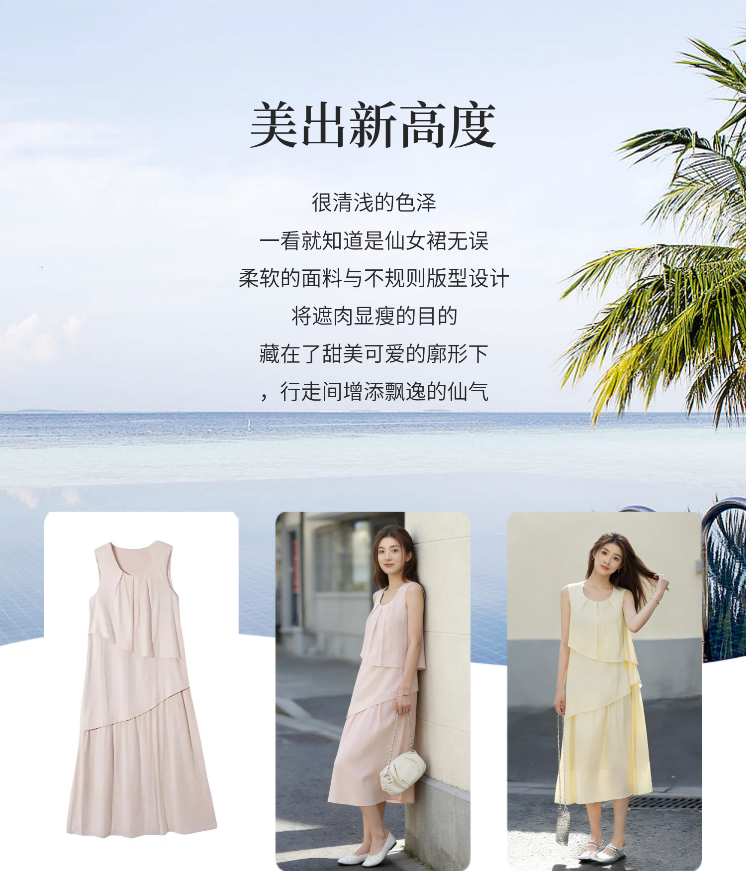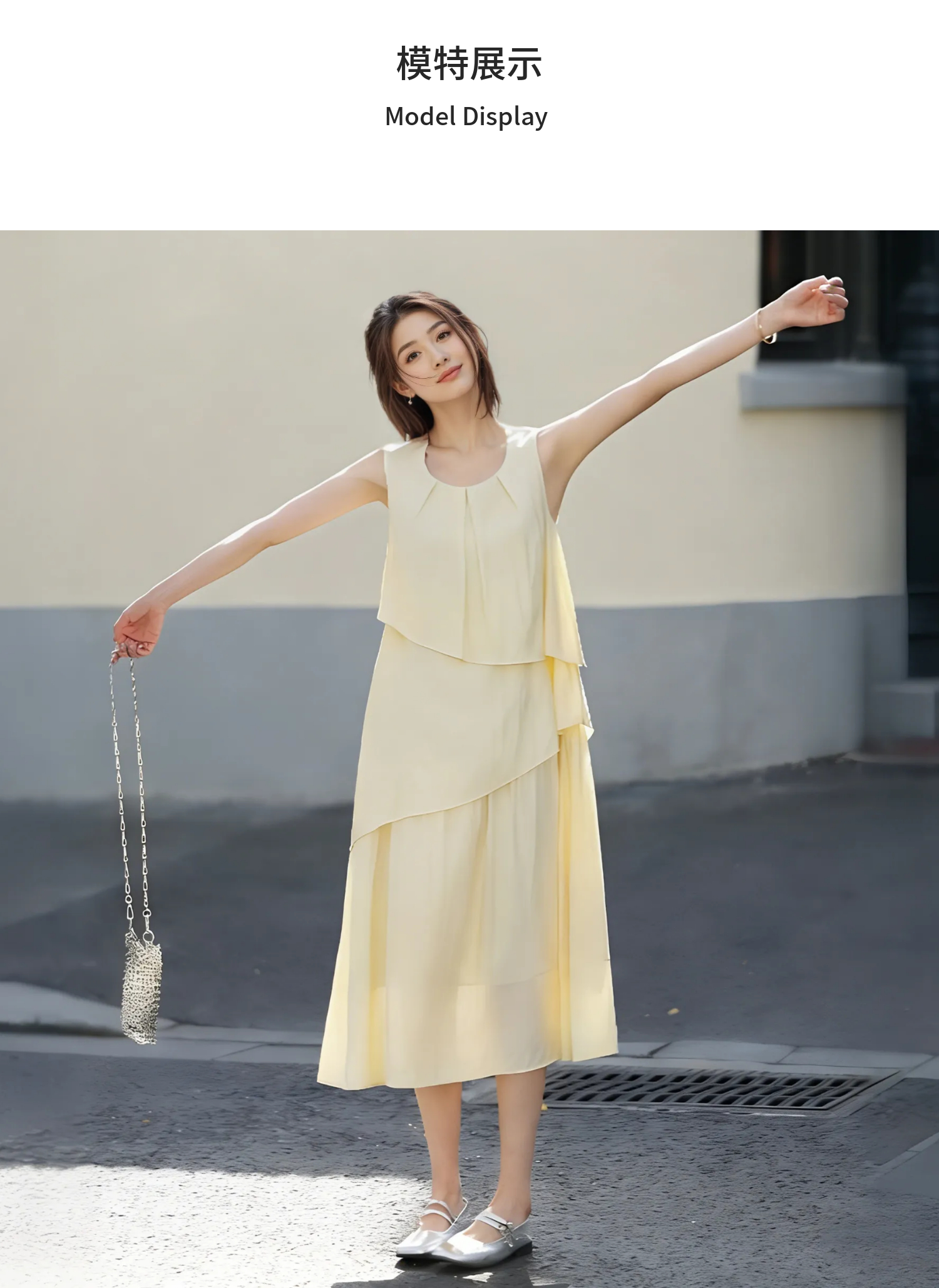 RY2060# 2026夏季新款气质名媛拼接U型领背心裙无袖A字连衣裙女不规则长款