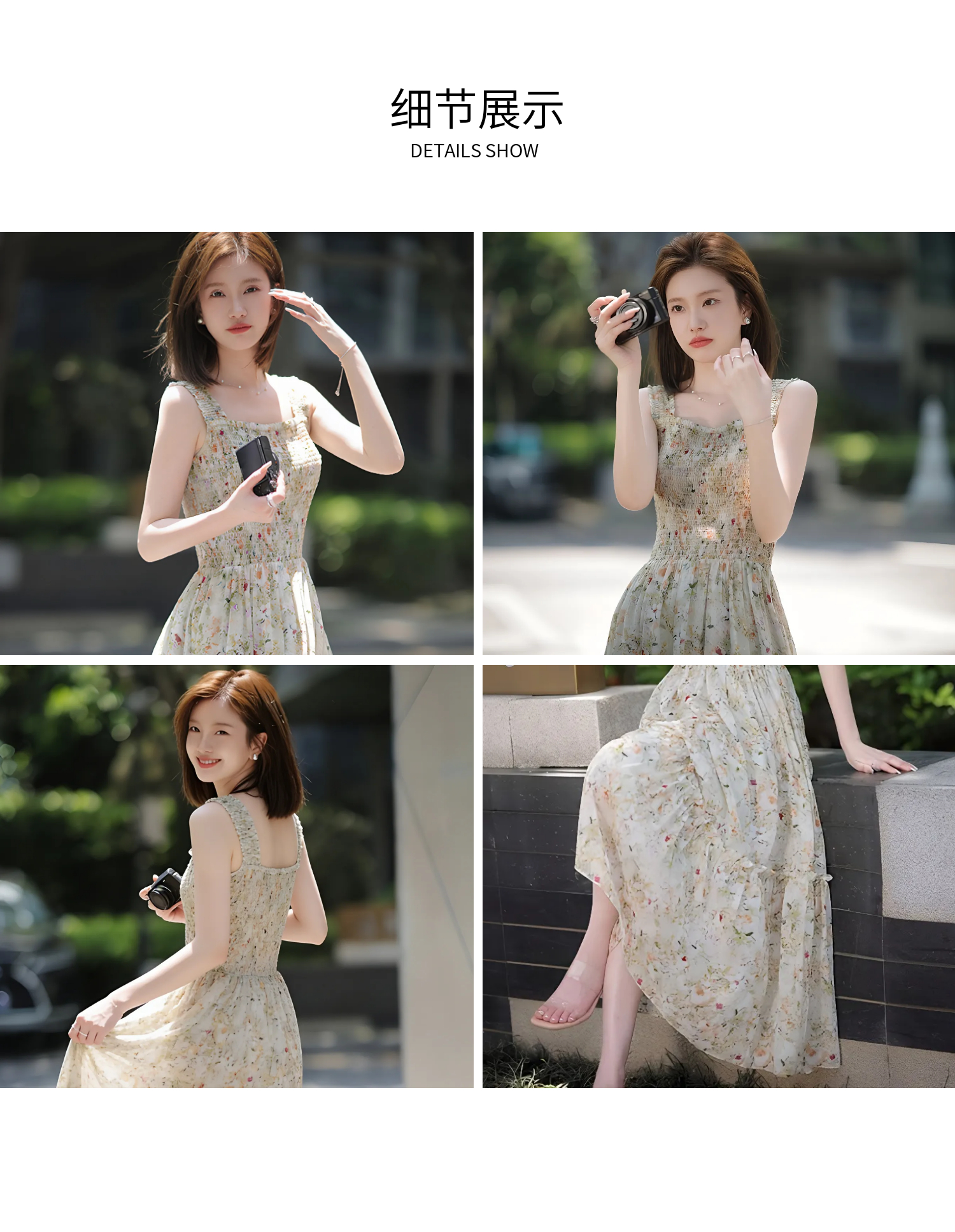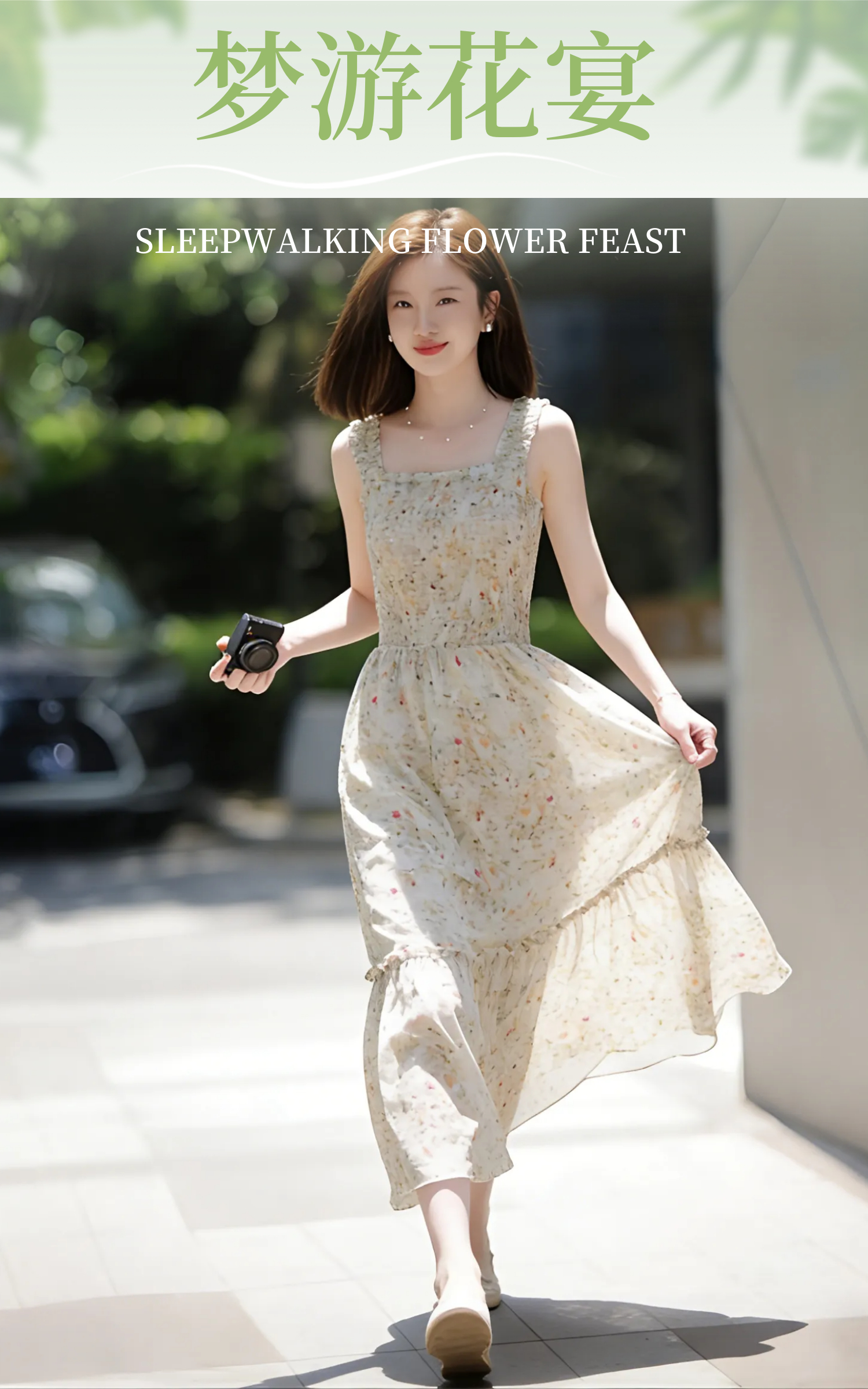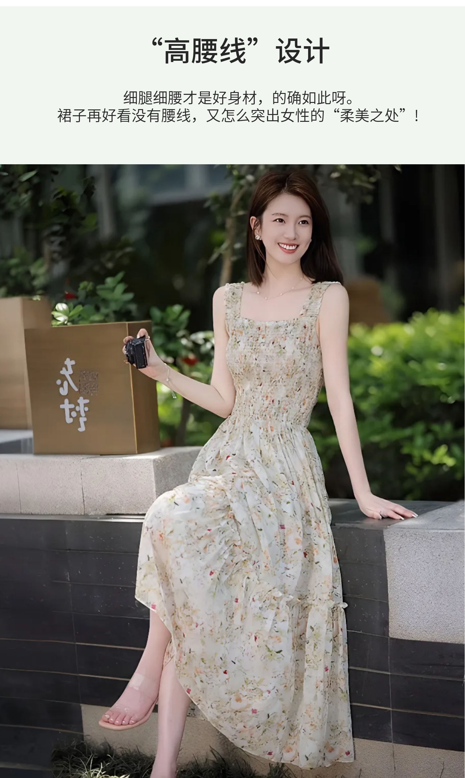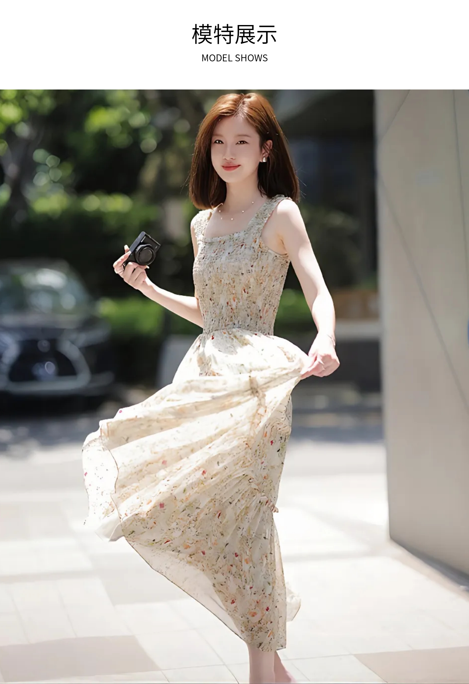 RY2062# 小清新甜美碎花连衣裙女夏季新品高级褶皱感气质无袖高端收腰长裙