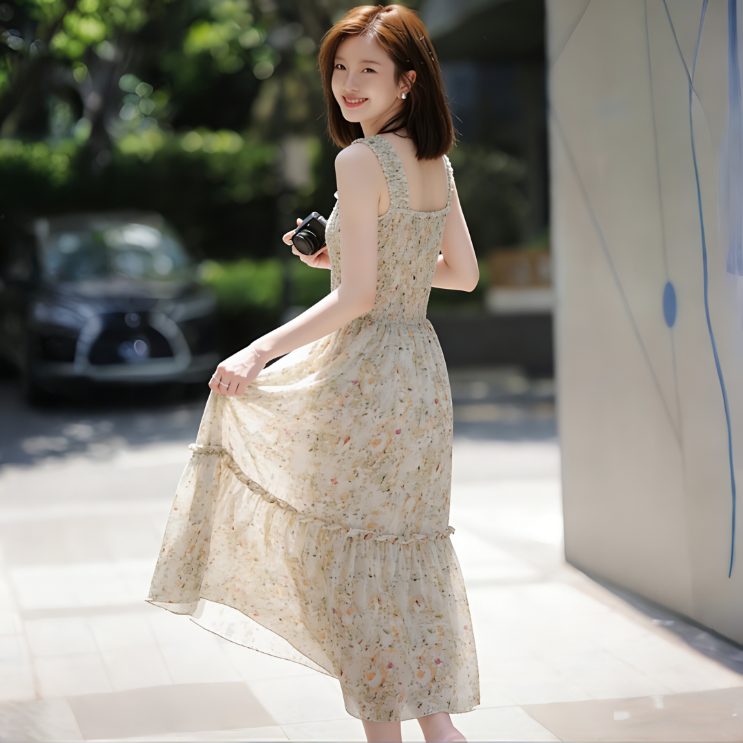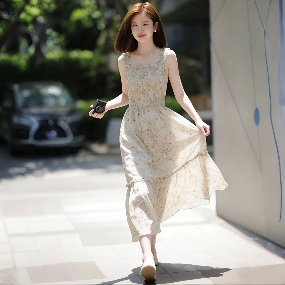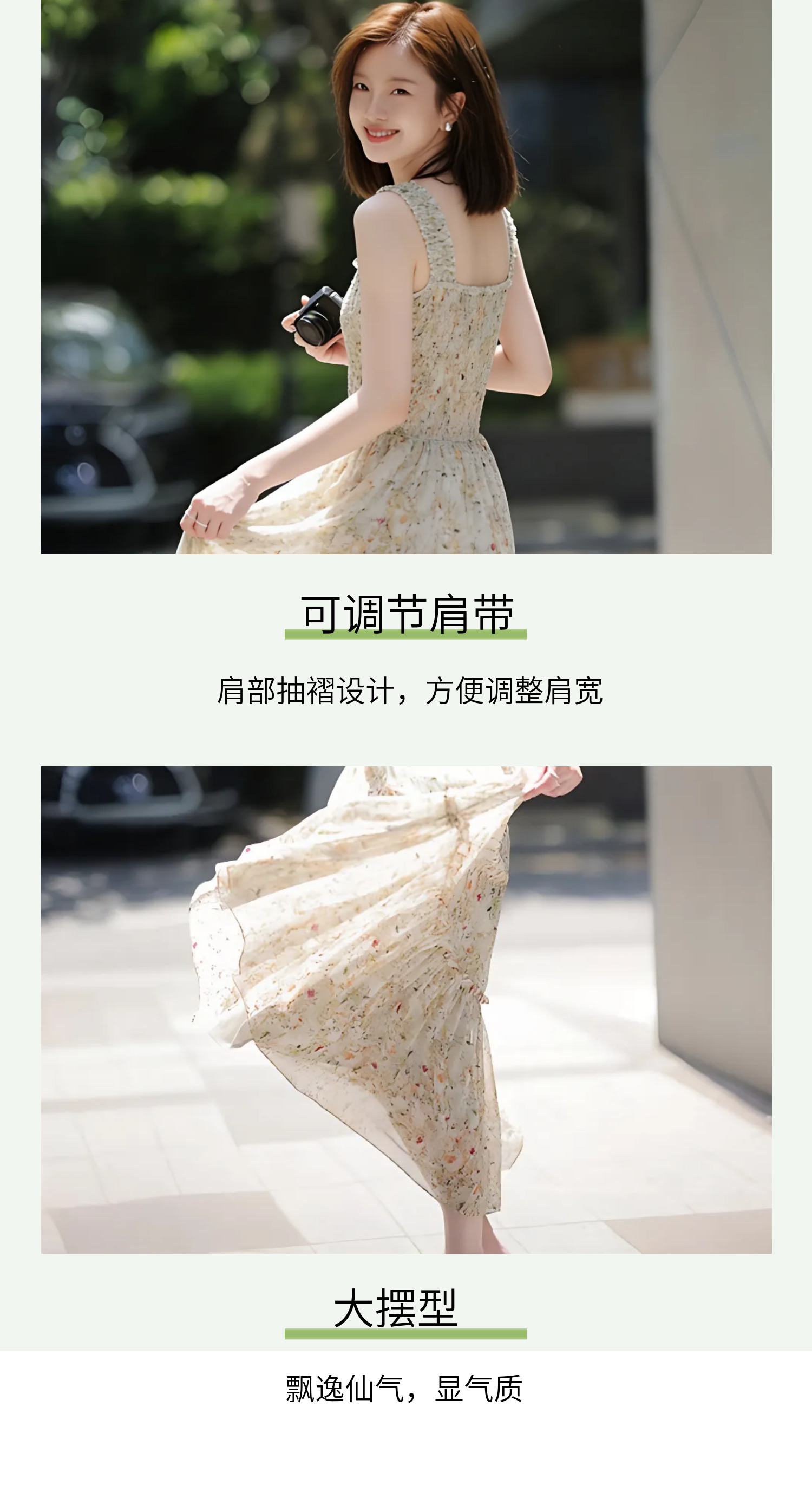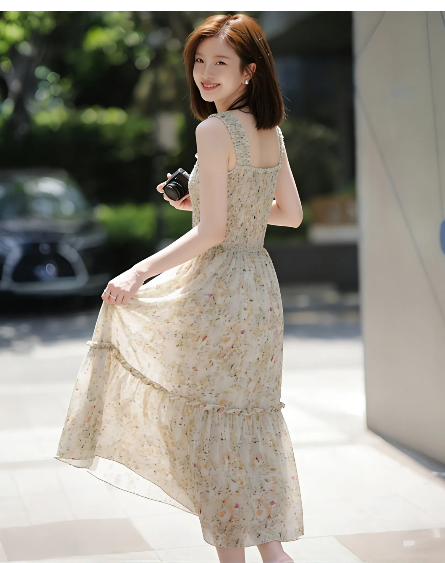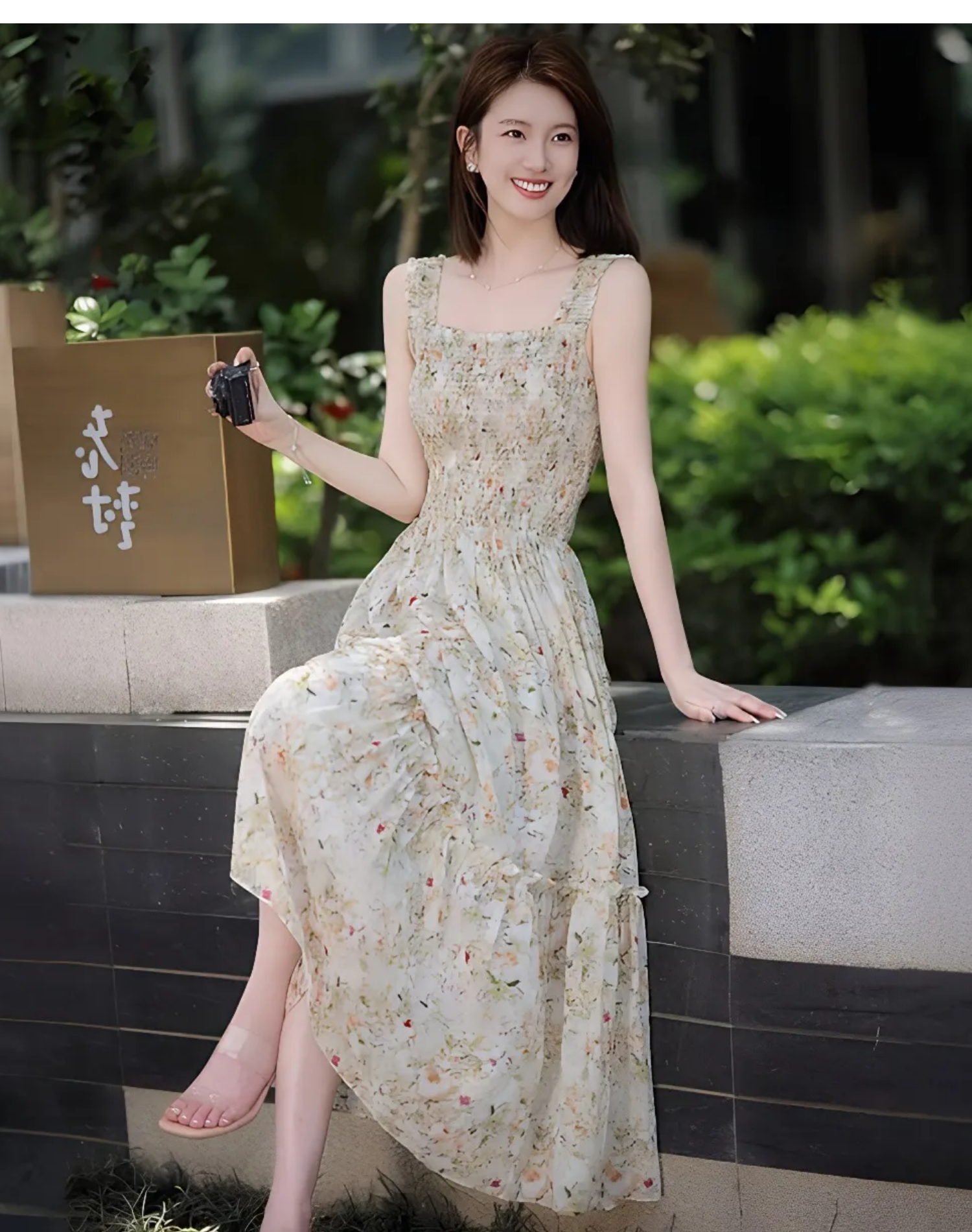 RY2062# 小清新甜美碎花连衣裙女夏季新品高级褶皱感气质无袖高端收腰长裙