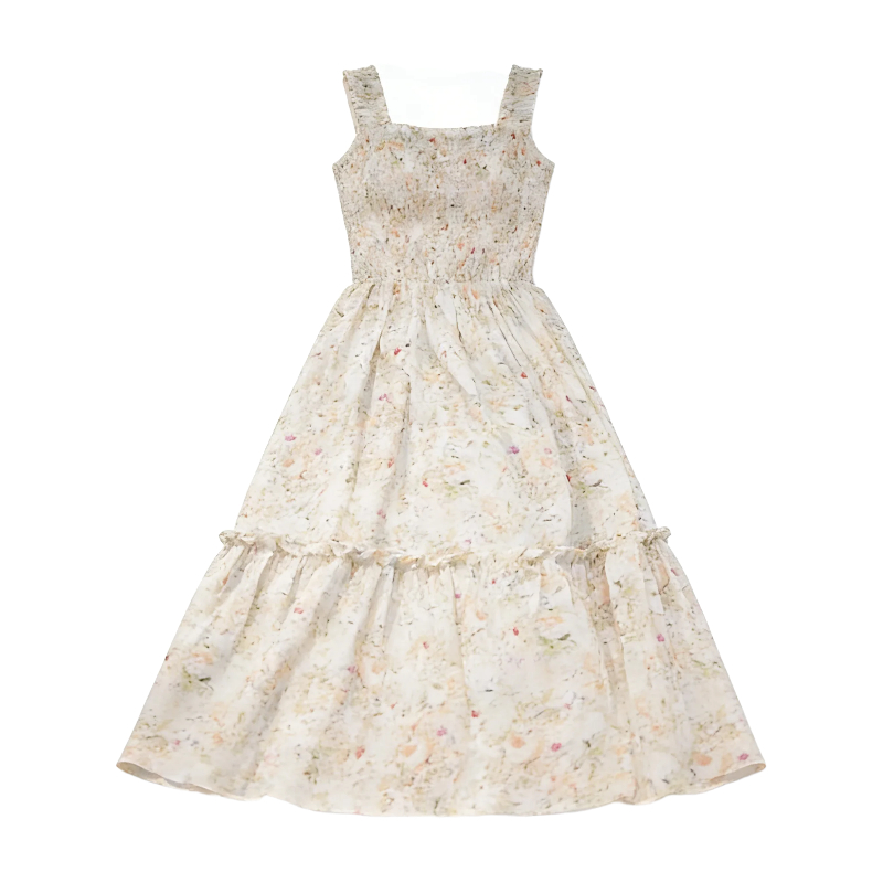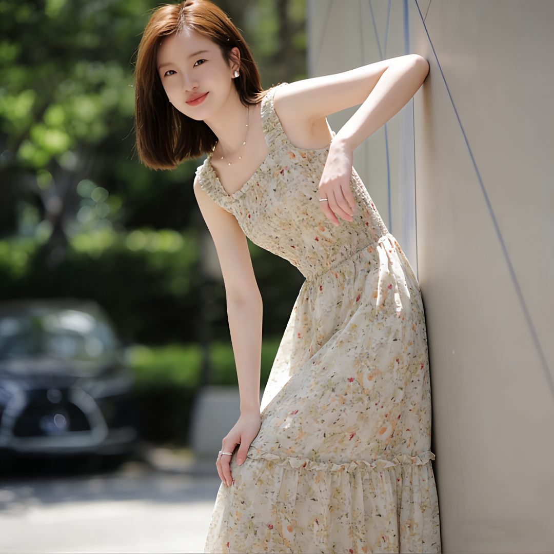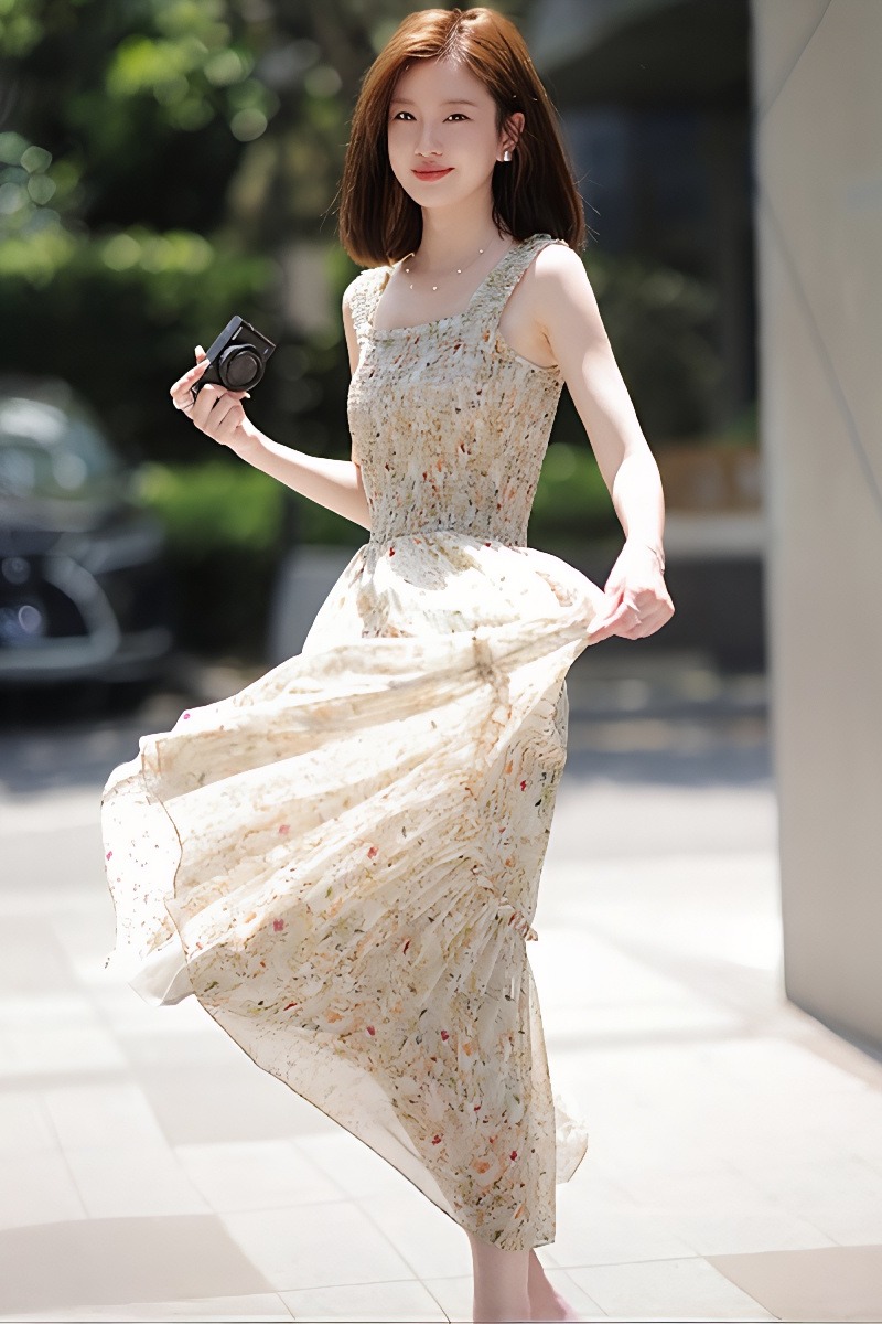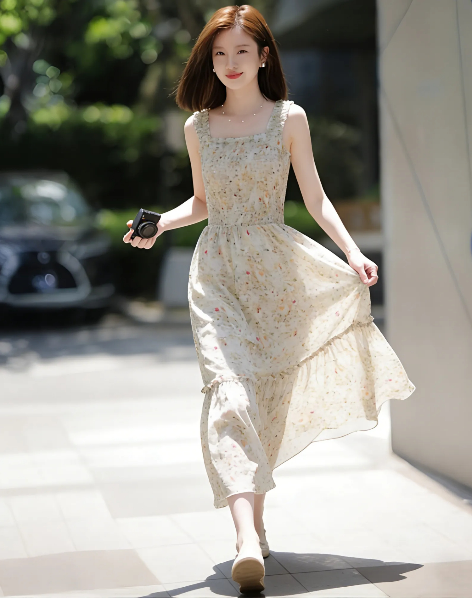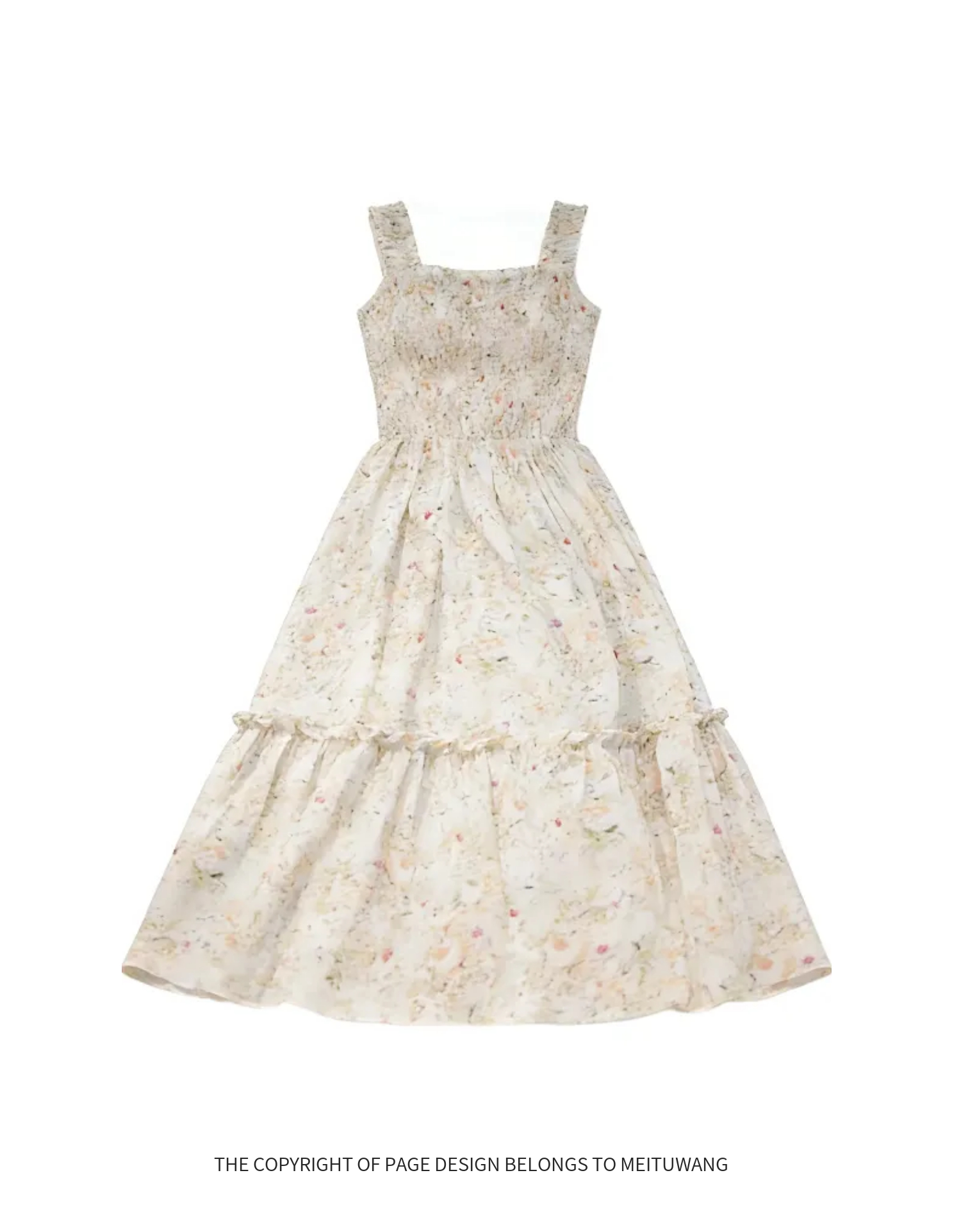 RY2062# 小清新甜美碎花连衣裙女夏季新品高级褶皱感气质无袖高端收腰长裙