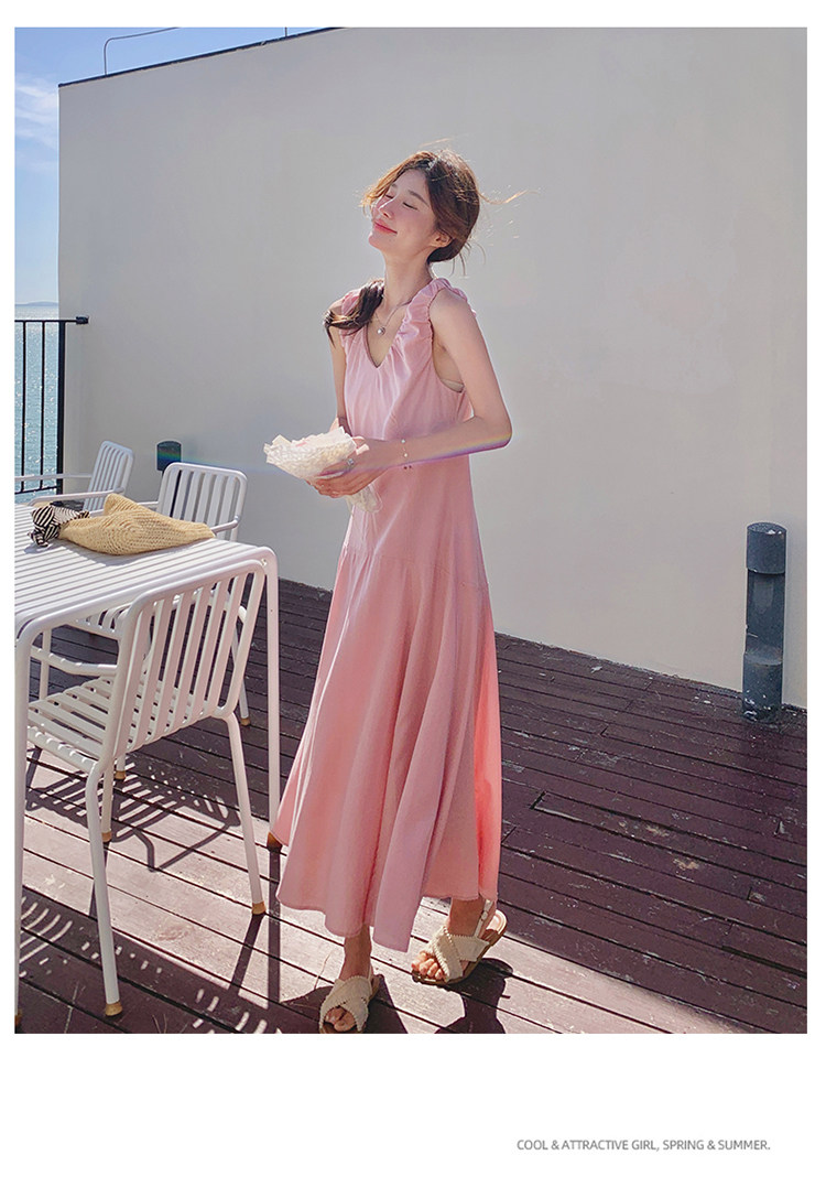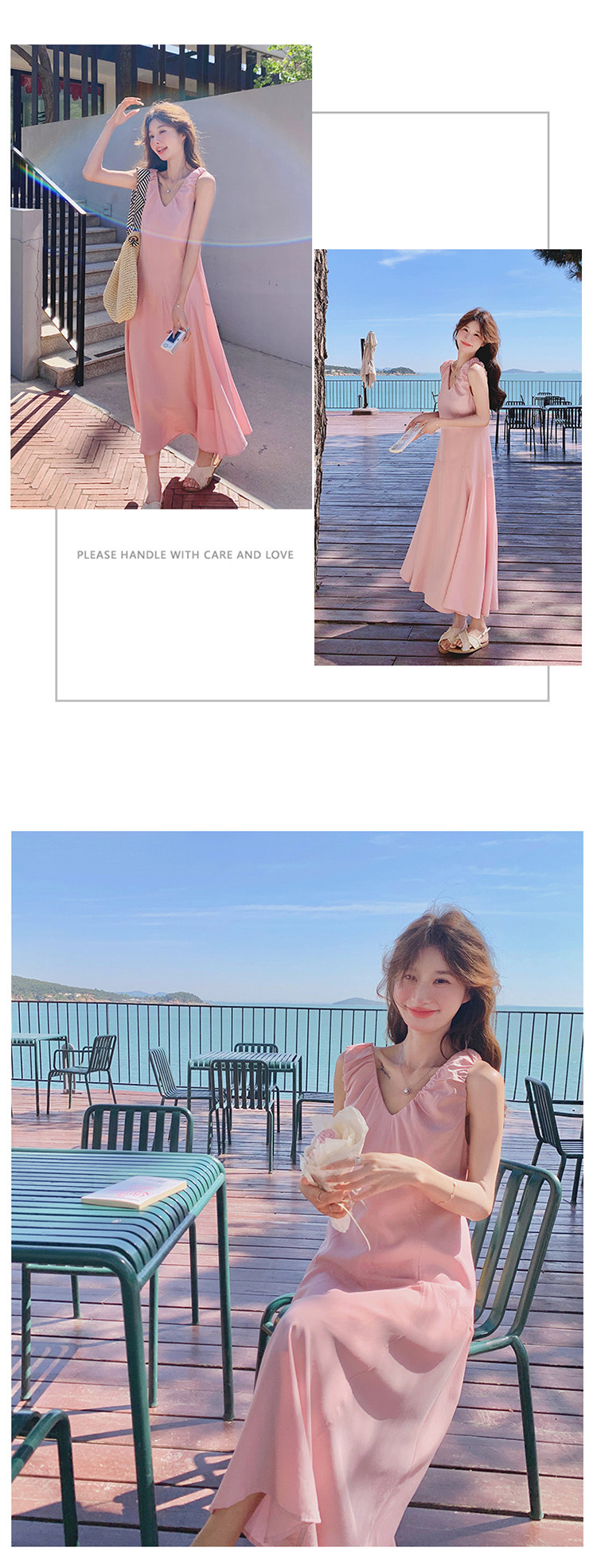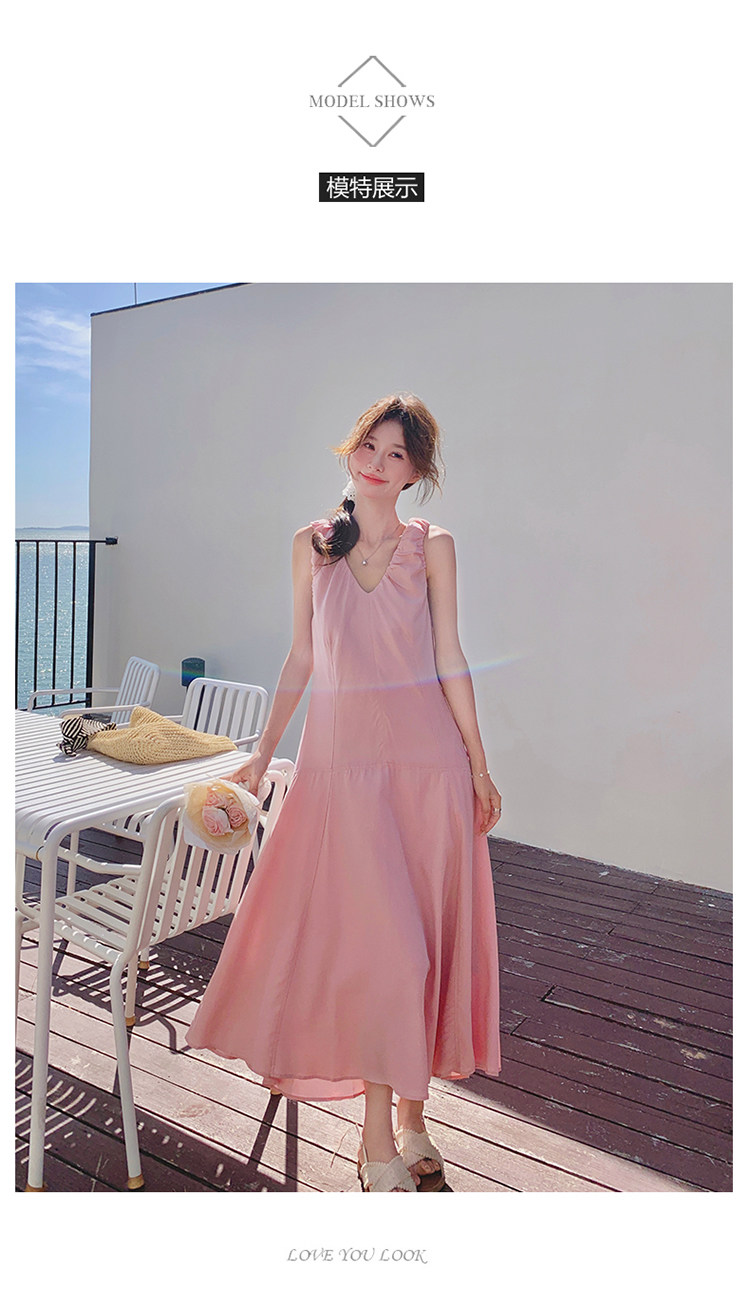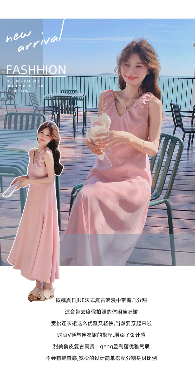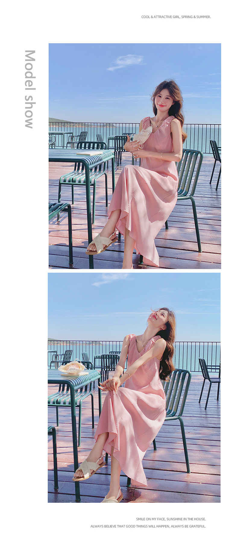 RY2063# 气质温柔粉色无袖v领连衣裙女夏2026新款简单大方高级感背心长裙