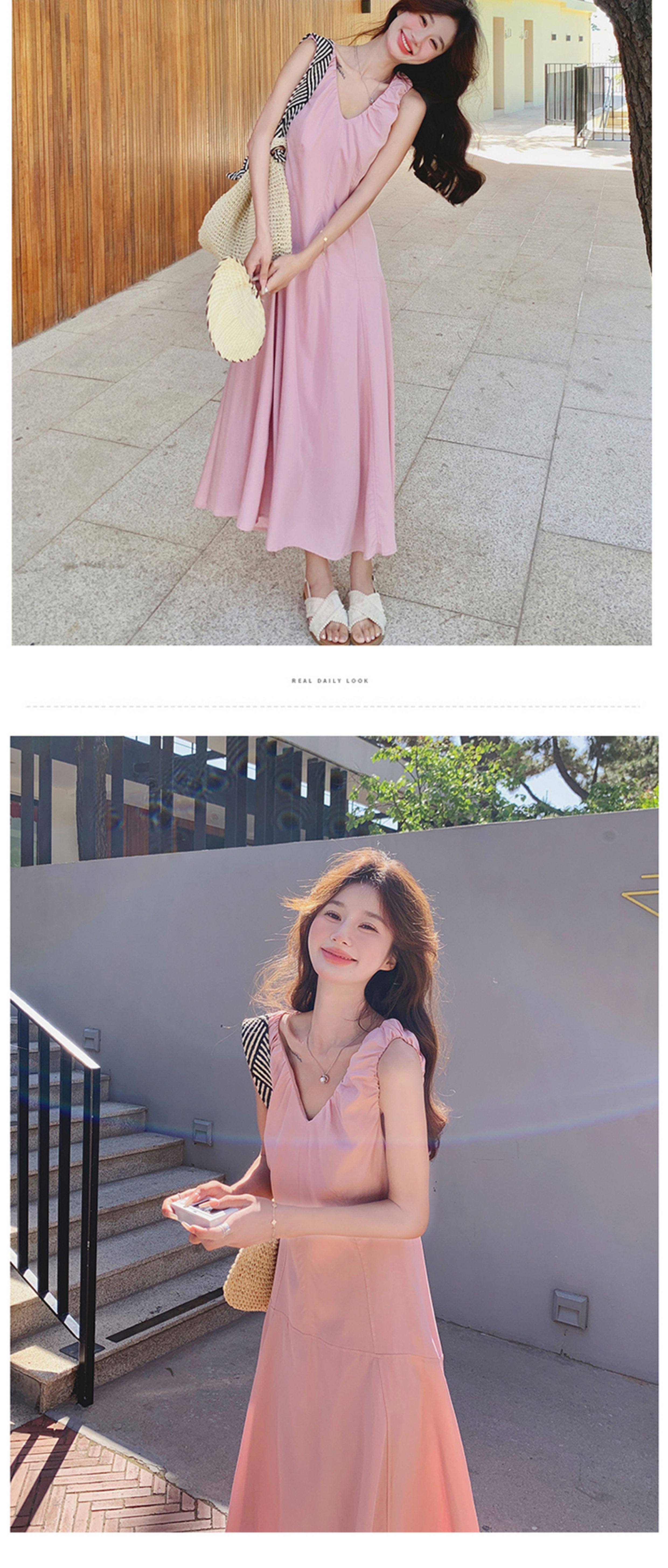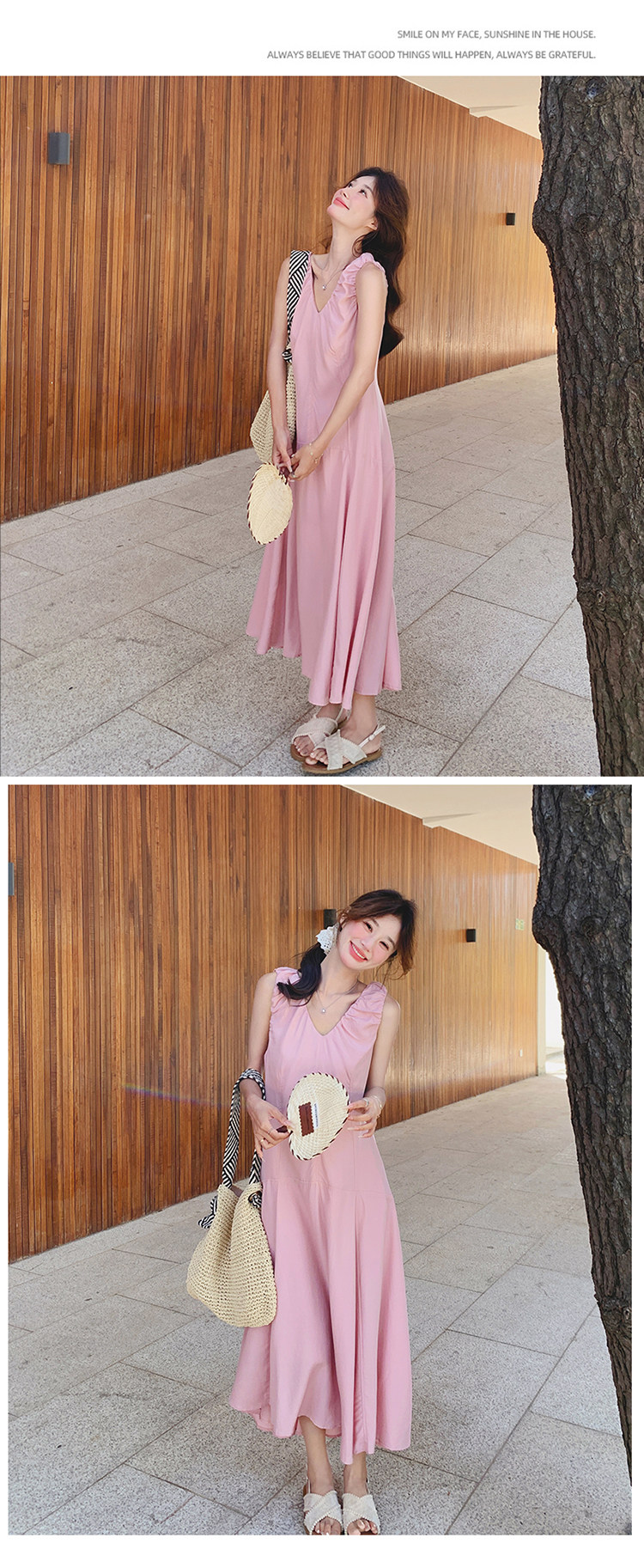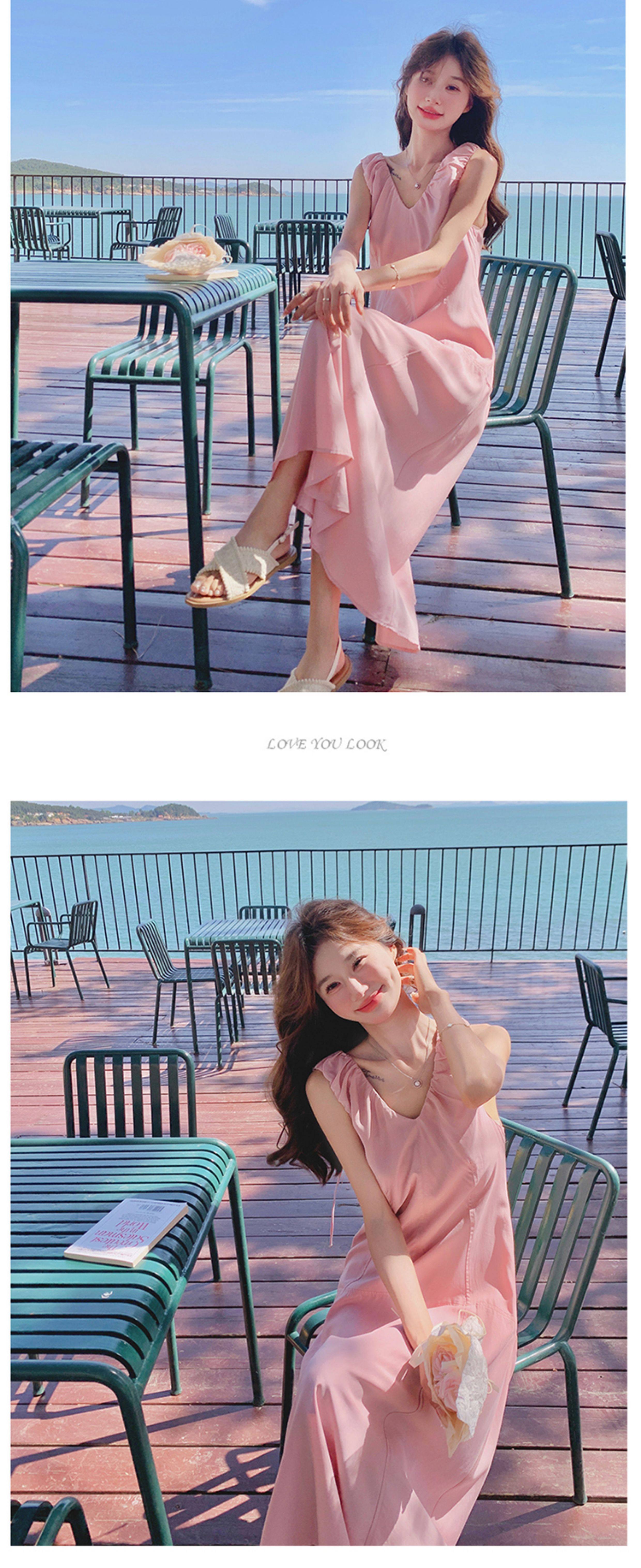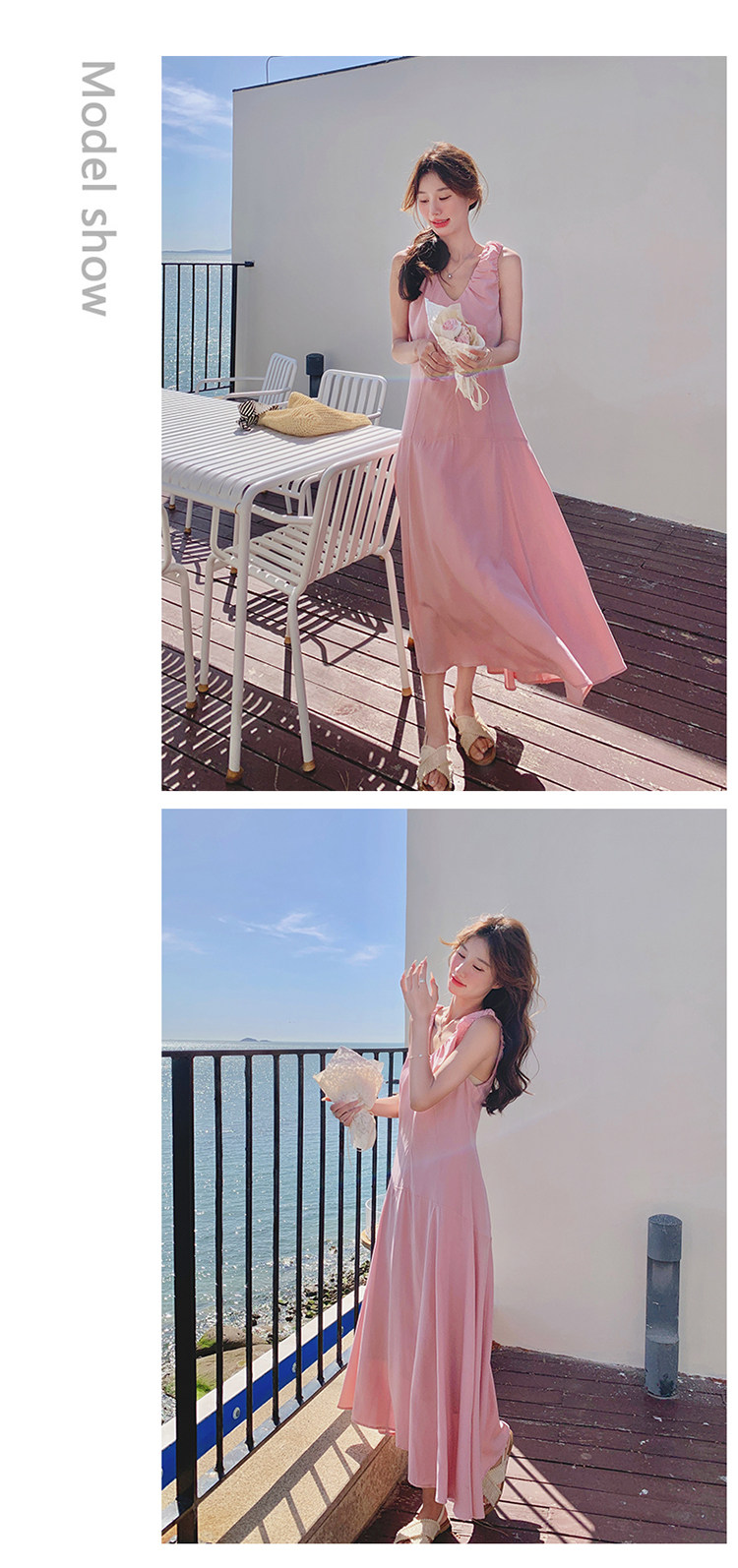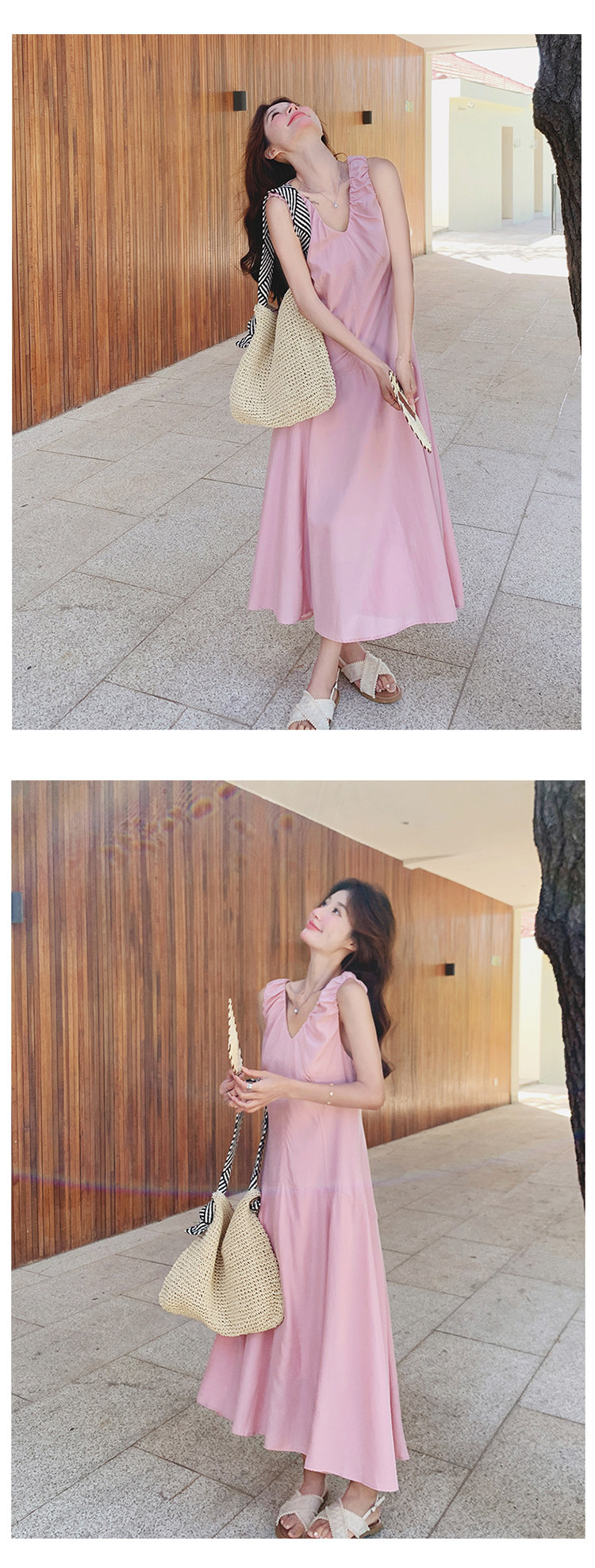 RY2063# 气质温柔粉色无袖v领连衣裙女夏2026新款简单大方高级感背心长裙