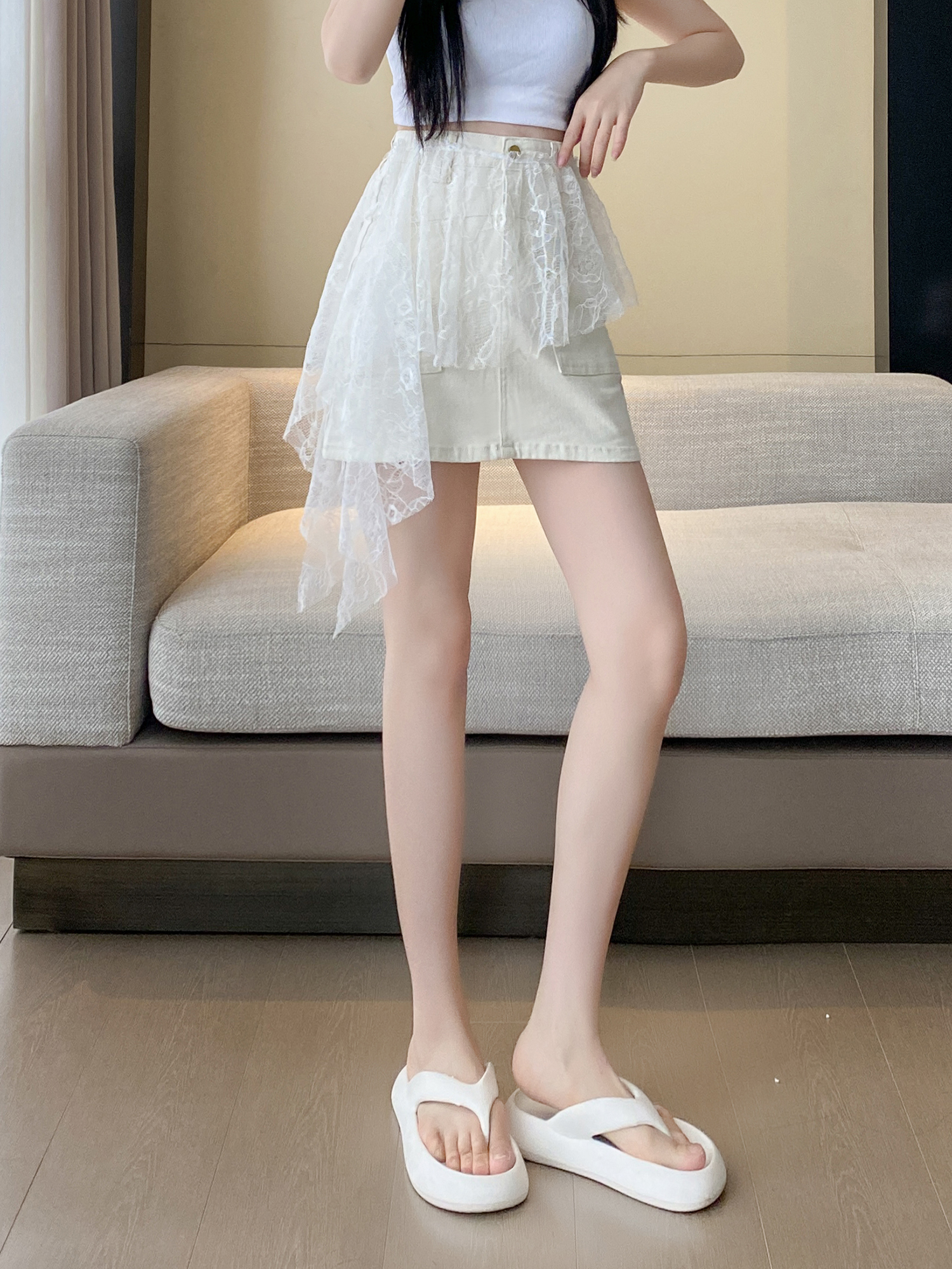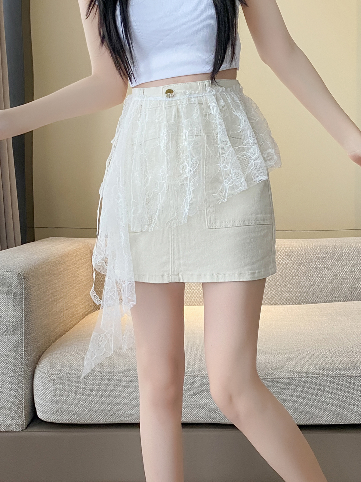 牛仔裙+蕾丝屁帘